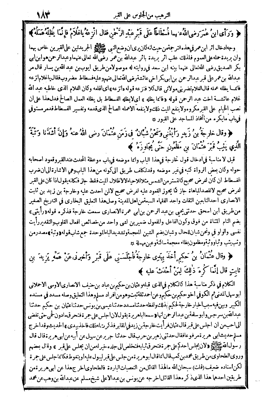 وَقَالَ عُثْمَانُ بنُ حَكِيمٍ أخَذَ بِيَدِي خارِجَةُ فأجْلَسَنِي عَلَى قَبْرٍ وَأخْبَرَني عَنْ عَمِّهِ يَزِيدَ بنِ ثابِتٍ قَالَ إنَّمَا كُرِهَ ذالِكَ لِمَنْ أحْدَثَ عليهِ