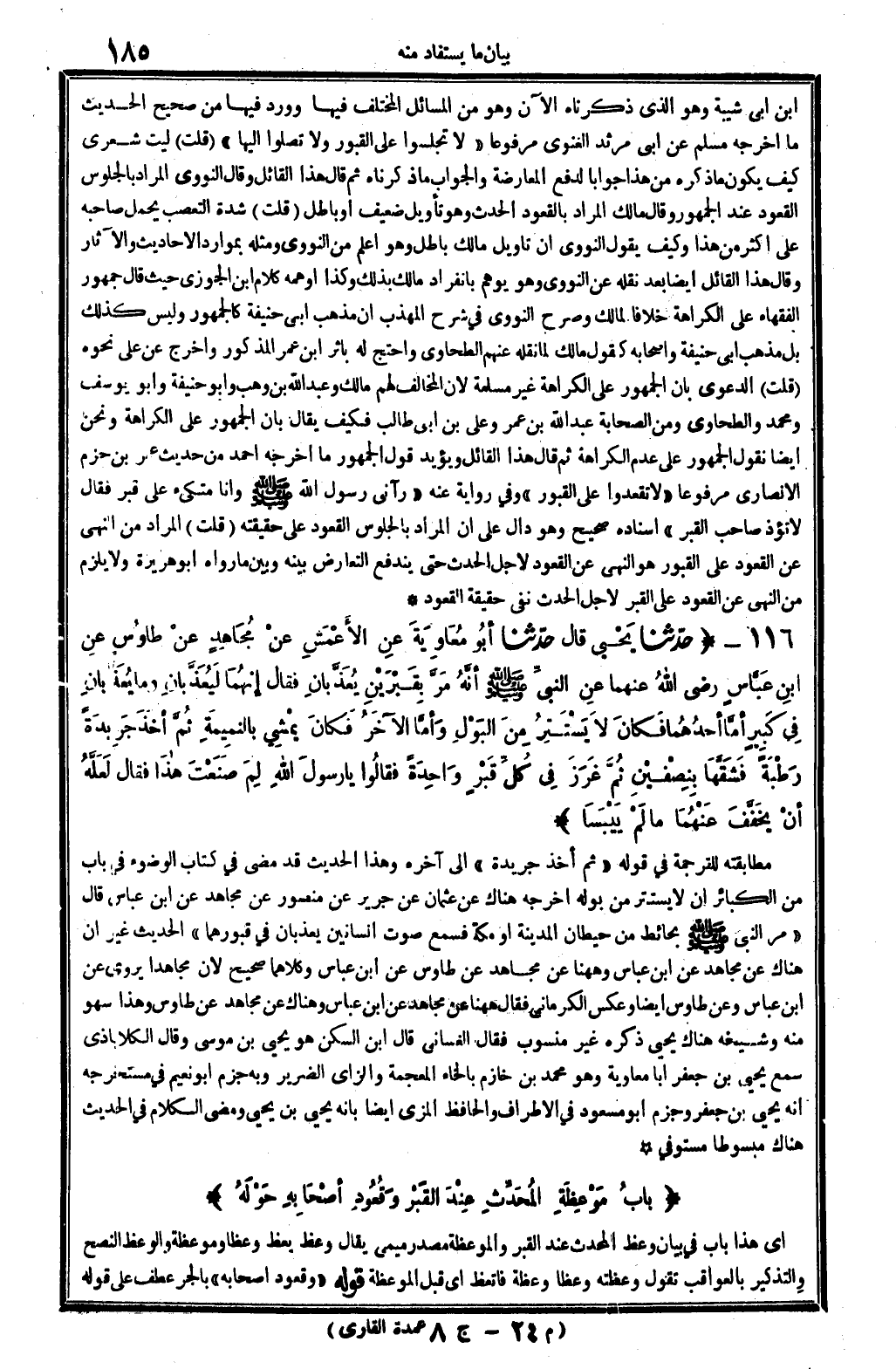 ابْن أبي شيبَة، وَهُوَ الَّذِي ذَكرْنَاهُ الْآن، وَهُوَ من الْمسَائِل الْمُخْتَلف فِيهَا، وَورد فِيهَا من صَحِيح الحَدِيث مَا أخرجه مُسلم عَن أبي مرْثَد الغنوي مَرْفُوعا: (لَا تجلسوا على الْقُبُور وَلَا تصلوا إِلَيْهَا) قلت: لَيْت شعري كَيفَ يكون مَا ذكره من هَذَا جَوَابا لدفع الْمُعَارضَة وَالْجَوَاب مَا ذَكرْنَاهُ، ثمَّ قَالَ هَذَا الْقَائِل: وَقَالَ النَّوَوِيّ: المُرَاد بِالْجُلُوسِ الْقعُود عِنْد الْجُمْهُور، وَقَالَ مَالك: المُرَاد بالقعود الْحَدث وَهُوَ تَأْوِيل ضَعِيف أَو بَاطِل قلت: شدَّة التعصب يحمل صَاحبه على أَكثر من هَذَا، وَكَيف يَقُول النَّوَوِيّ: إِن تَأْوِيل مَالك بَاطِل وَهُوَ أعلم من النَّوَوِيّ؟ وَمثله بموارد الْأَحَادِيث والْآثَار؟ وَقَالَ هَذَا الْقَائِل أَيْضا، بعد نَقله عَن النَّوَوِيّ: وَهُوَ يُوهم بانفراد مَالك بذلك، وَكَذَا أَوْهَمهُ كَلَام ابْن الْجَوْزِيّ، حَيْثُ قَالَ جُمْهُور الْفُقَهَاء على الْكَرَاهَة خلافًا لمَالِك، وَصرح النَّوَوِيّ فِي (شرح الْمُهَذّب) : أَن مَذْهَب أبي حنيفَة كالجمهور، وَلَيْسَ كَذَلِك، بل مَذْهَب أبي حنيفَة وَأَصْحَابه كَقَوْل مَالك لما نَقله عَنْهُم الطَّحَاوِيّ وَاحْتج لَهُ بأثر ابْن عمر الْمَذْكُور. وَأخرج عَن عَليّ نَحوه. قلت: الدَّعْوَى بِأَن الْجُمْهُور على الْكَرَاهَة غير مسلمة، لِأَن الْمُخَالف لَهُم: مَالك وَعبد الله بن وهب وَأَبُو حنيفَة وَأَبُو يُوسُف وَمُحَمّد والطَّحَاوِي، وَمن الصَّحَابَة: عبد الله بن عمر وَعلي بن أبي طَالب، فَكيف يُقَال بِأَن الْجُمْهُور على الْكَرَاهَة وَنحن أَيْضا نقُول الْجُمْهُور على عدم الْكَرَاهَة، ثمَّ قَالَ هَذَا الْقَائِل: وَيُؤَيّد قَول الْجُمْهُور مَا أخرجه أَحْمد من حَدِيث عمر بن حزم الْأنْصَارِيّ مَرْفُوعا: (لَا تقعدوا على الْقُبُور) ، وَفِي رِوَايَة عَنهُ: (رَآنِي رَسُول الله صلى الله عَلَيْهِ وَسلم وَأَنا متكىء على قبر، فَقَالَ: لَا تؤذ صَاحب الْقَبْر) ، إِسْنَاده صَحِيح، وَهُوَ دَال على أَن المُرَاد بِالْجُلُوسِ الْقعُود على حَقِيقَته. قلت: المُرَاد من النَّهْي عَن الْقعُود على الْقُبُور، هُوَ النَّهْي عَن الْقعُود لأجل الْحَدث، حَتَّى ينْدَفع التَّعَارُض بَينه وَبَين مَا رَوَاهُ أَبُو هُرَيْرَة، وَلَا يلْزم من النَّهْي عَن الْقعُود على الْقَبْر لأجل الْحَدث نفي حَقِيقَة الْقعُود.