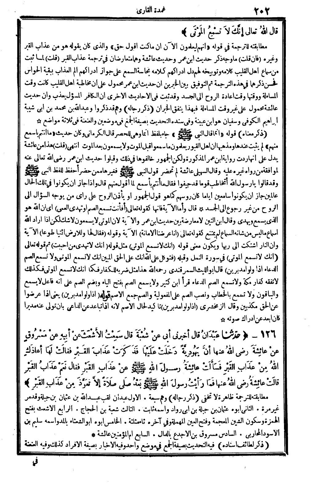 قَالَ: وَأما الْآيَة فَإِنَّهَا كَقَوْلِه تَعَالَى: {أفأنت تسمع الصم أَو تهدي الْعمي} (الزخرف: 04) . أَي: إِن الله هُوَ الَّذِي يسمع وَيهْدِي. وَقَالَ ابْن التِّين: لَا مُعَارضَة بَين حَدِيث ابْن عمر وَالْآيَة، لِأَن الْمَوْتَى لَا يسمعُونَ، لَا شكّ، لَكِن إِذا أَرَادَ الله إسماع مَا لَيْسَ من شَأْنه السماع لم يمْتَنع، كَقَوْلِه تَعَالَى: {إِنَّا عرضنَا الْأَمَانَة ... } (الْأَحْزَاب: 27) . الْآيَة. وَقَوله: {فَقَالَ لَهَا وللأرض ائتيا طَوْعًا} (فصلت: 11) . الْآيَة وَإِن النَّار اشتكت إِلَى رَبهَا، وَيكون معنى قَوْله: {إِنَّك لَا تسمع الْمَوْتَى} (النَّمْل: 08) . مثل قَوْله: {إِنَّك لَا تهدي من أَحْبَبْت} (الْقَصَص: 65) . ثمَّ قَوْله تَعَالَى: {إِنَّك لَا تسمع الْمَوْتَى} (النَّمْل: 08) . فِي سُورَة النَّمْل، وَقَبله: {فتوكل على الله إِنَّك على الْحق الْمُبين إِنَّك لَا تسمع الْمَوْتَى وَلَا تسمع الصم الدُّعَاء إِذا ولوا مُدبرين} (النَّمْل: 97 و 08) . قَالَ أَبُو اللَّيْث السَّمرقَنْدِي، رَحمَه الله: هَذَا مثل ضربه للْكفَّار، فَكَمَا أَنَّك لَا تسمع الْمَوْتَى فَكَذَلِك لَا تفقه كفار مَكَّة وَلَا تسمع الصم الدُّعَاء، قَرَأَ ابْن كثير: وَلَا يسمع الصم، بِفَتْح الْيَاء وبضم الصم، على أَنه فَاعل: لَا يسمع، وَالْبَاقُونَ: وَلَا تسمع، بِالْخِطَابِ وَنصب: الصم، على المفعولية، والصم جمع: الْأَصَم. قَوْله: {إِذا ولوا مُدبرين} (النَّمْل: 08) يَعْنِي إِذا عرضوا عَن الْحق مكدبين وَقَالَ الزَّمَخْشَرِيّ (إِذا ولوا مُدبرين) . تَأْكِيد لحَال الْأَصَم، لِأَنَّهُ إِذا تبَاعد عَن الدَّاعِي بِأَن تولى عَنهُ مُدبرا كَانَ أبعد عَن إِدْرَاك صَوته.