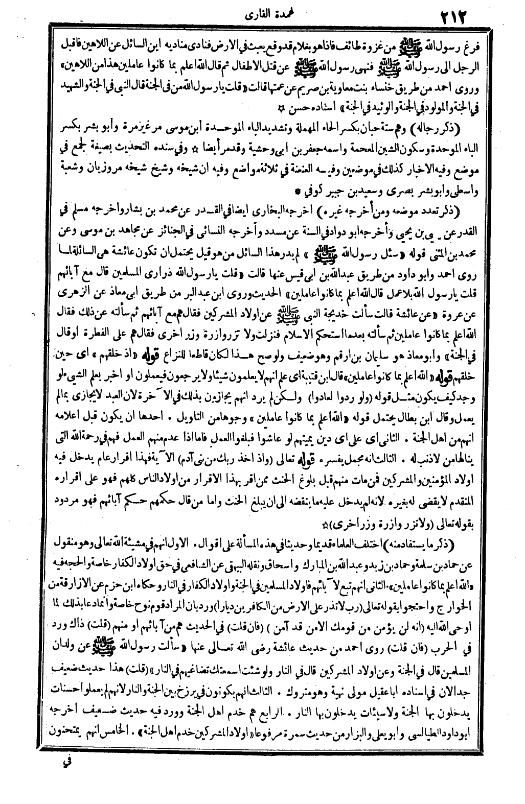ذكر تعدد مَوْضِعه وَمن أخرجه غَيره: أخرجه البُخَارِيّ أَيْضا فِي الْقدر عَن مُحَمَّد بن بشار. وَأخرجه مُسلم فِي الْقدر عَن يحيى بن يحيى. وَأخرجه أَبُو دَاوُد فِي السّنة عَن مُسَدّد وَأخرجه النَّسَائِيّ فِي الْجَنَائِز عَن مُجَاهِد بن مُوسَى وَعَن مُحَمَّد بن الْمثنى، قَوْله: (سُئِلَ رَسُول الله صلى الله عَلَيْهِ وَسلم. .) لم يدر هَذَا السَّائِل من هُوَ، قيل: يحْتَمل أَن تكون عَائِشَة هِيَ السائلة لما روى أَحْمد وَأَبُو دَاوُد من طَرِيق عبد الله بن أبي قيس عَنْهَا، قَالَت: (قلت: يَا رَسُول الله، ذَرَارِي الْمُسلمين؟ قَالَ: مَعَ آبَائِهِم. قلت: يَا رَسُول الله بِلَا عمل؟ قَالَ: الله أعلم بِمَا كَانُوا عاملين) الحَدِيث، وروى ابْن عبد الْبر من طَرِيق أبي معَاذ عَن الزُّهْرِيّ عَن عُرْوَة (عَن عَائِشَة، قَالَت: سَأَلت خَدِيجَة النَّبِي صلى الله عَلَيْهِ وَسلم عَن أَوْلَاد الْمُشْركين، فَقَالَ: هم مَعَ آبَائِهِم، ثمَّ سَأَلته عَن ذَلِك، فَقَالَ: الله أعلم بِمَا كَانُوا عاملين، ثمَّ سَأَلته بَعْدَمَا استحكم الْإِسْلَام فَنزلت: {وَلَا تزر وَازِرَة وزر أُخْرَى} (الْأَنْعَام: 461، الْإِسْرَاء 512، فاطر: 81، الزمر: 7 والنجم: 83) . فَقَالَ: هم على الْفطْرَة، أَو قَالَ: فِي الْجنَّة) . وَأَبُو معَاذ هُوَ: سُلَيْمَان بن أَرقم، وَهُوَ ضَعِيف، وَلَو صَحَّ هَذَا لَكَانَ قَاطعا للنزاع.