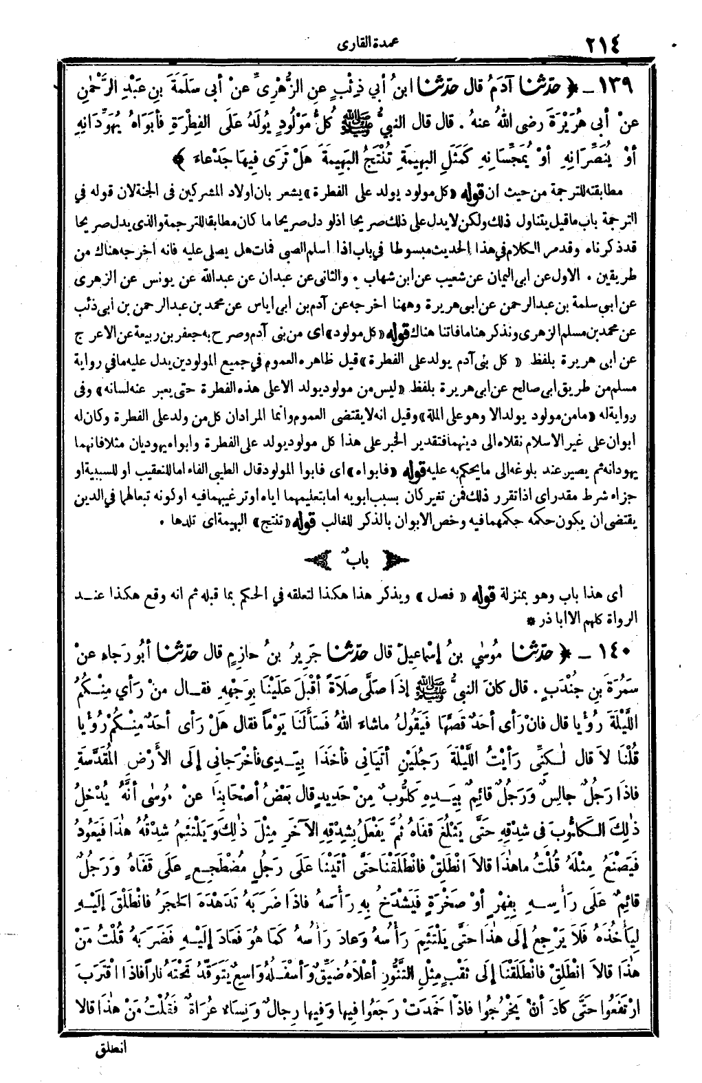 5831 - حدَّثنا آدَمُ قَالَ حدَّثنا ابنُ أبِي ذِئْبٍ عنِ الزُّهْرِيِّ عنْ أبِي سَلَمَةَ بنِ عَبْدِ الرَّحْمانِ عنْ أبِي هُرَيْرَةَ رَضِي الله تَعَالَى عنهُ. قَالَ قَالَ النبيُّ صلى الله عَلَيْهِ وَسلم كُلُّ مَوْلُودٍ يُولَدُ عَلَى الفِطْرَةِ فَأبَوَاهُ يُهَوِّدَانِهِ أوْ يُنَصِّرَانهِ أوْ يُمَجِّسَانِهِ كمَثَلِ البَهِيمَةِ تُنْتِجُ البَهِيمَةَ هَلْ تَرَى فِيها جَدْعَاءَ..