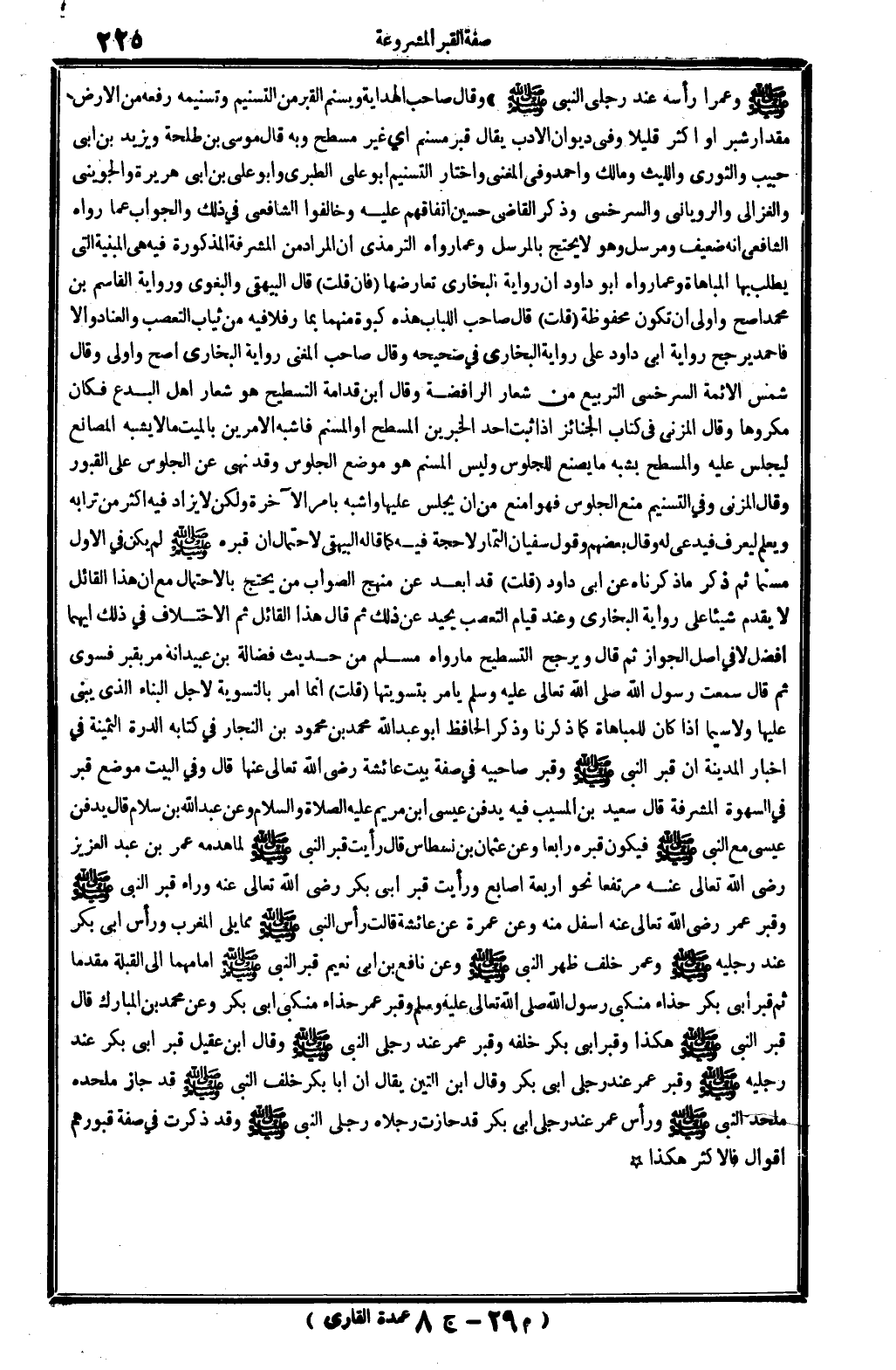 صلى الله عَلَيْهِ وَسلم وعمرا رَأسه عِنْد رجْلي النبيصلى الله عَلَيْهِ وَسلم) . وَقَالَ صَاحب (الْهِدَايَة) : ويسنم الْقَبْر من التسنيم، وتسنيمه، رَفعه من الأَرْض، مِقْدَار شبر أَو أَكثر قَلِيلا. وَفِي (ديوَان الْأَدَب) : يُقَال: قبر مسنم، أَي: غير مسطح، وَبِه قَالَ مُوسَى بن طَلْحَة وَيزِيد بن أبي حبيب، وَالثَّوْري وَاللَّيْث وَمَالك وَأحمد. وَفِي (الْمُغنِي) : وَاخْتَارَ التسنيم أَبُو عَليّ الطَّبَرِيّ وَأَبُو عَليّ بن أبي هُرَيْرَة والجويني وَالْغَزالِيّ وَالرُّويَانِيّ والسرخسي، وَذكر القَاضِي حُسَيْن اتِّفَاقهم عَلَيْهِ، وخالفوا الشَّافِعِي فِي ذَلِك، وَالْجَوَاب عَمَّا رَوَاهُ الشَّافِعِي: أَنه ضَعِيف ومرسل وَهُوَ لَا يحْتَج بالمرسل، وَعَما رَوَاهُ التِّرْمِذِيّ: أَن المُرَاد من المشرفة الْمَذْكُورَة فِيهِ هِيَ المبنية الَّتِي يطْلب بهَا المباهاة، وَعَما رَوَاهُ أَبُو دَاوُد أَن رِوَايَة البُخَارِيّ تعارضها. فَإِن قلت: قَالَ الْبَيْهَقِيّ وَالْبَغوِيّ: وَرِوَايَة الْقَاسِم بن مُحَمَّد أصح، وَأولى أَن تكون مَحْفُوظَة، قلت: قَالَ صَاحب (اللّبَاب) : هَذِه كبوة مِنْهُمَا بِمَا رفلا فِيهِ من ثِيَاب التعصب والعناد، وإلاَّ فَأَحْمَد يرجح رِوَايَة أبي دَاوُد على رِوَايَة البُخَارِيّ فِي (صَحِيحه) . وَقَالَ صَاحب (الْمُغنِي) : رِوَايَة البُخَارِيّ أصح وَأولى. وَقَالَ شمس الْأَئِمَّة السَّرخسِيّ: التربيع من شعار الرافضة، وَقَالَ ابْن قدامَة: التسطيح هُوَ شعار أهل الْبدع، فَكَانَ مَكْرُوها. وَقَالَ الْمُزنِيّ فِي (كتاب الْجَنَائِز) : إِذا ثَبت أحد الْخَبَرَيْنِ المسطح أَو المسنم فَأشبه الْأَمريْنِ بِالْمَيتِ مَا لَا يشبه المصانع ليجلس عَلَيْهِ، والمسطح يشبه مَا يصنع للجلوس، وَلَيْسَ المسنم هُوَ مَوضِع الْجُلُوس، وَقد نهى عَن الْجُلُوس على الْقُبُور. وَقَالَ الْمُزنِيّ؛ وَفِي التسنيم منع الْجُلُوس فَهُوَ أمنع من أَن يجلس عَلَيْهَا، وأشبه بِأَمْر الْآخِرَة، وَلَكِن لَا يُزَاد فِيهِ أَكثر من ترابه، وَيعلم ليعرف فيدعى لَهُ، وَقَالَ بَعضهم: وَقَول سُفْيَان التمار لَا حجَّة فِيهِ، كَمَا قَالَه الْبَيْهَقِيّ لاحْتِمَال أَن قَبره صلى الله عَلَيْهِ وَسلم لم يكن فِي الأول مسنما، ثمَّ ذكر مَا ذَكرْنَاهُ عَن أبي دَاوُد. قلت: قد أبعد عَن مَنْهَج الصَّوَاب من يحْتَج بالإحتمال، مَعَ أَن هَذَا الْقَائِل لَا يقدم شَيْئا على رِوَايَة البُخَارِيّ، وَعند قيام التعصب يحيد عَن ذَلِك، ثمَّ قَالَ هَذَا الْقَائِل: ثمَّ الإختلاف فِي ذَلِك أَيهمَا أفضل لَا فِي أصل الْجَوَاز، ثمَّ قَالَ: ويرجح التسطيح مَا رَوَاهُ مُسلم من حَدِيث فضَالة بن عبيد أَنه مر بِقَبْر فسوي، ثمَّ قَالَ: سَمِعت رَسُول الله، صلى الله عَلَيْهِ وَسلم، يَأْمر بتسويتها قلت: إِنَّمَا أَمر بالتسوية لأجل الْبناء الَّذِي يبْنى عَلَيْهَا، وَلَا سِيمَا إِذا كَانَ للمباهاة كَمَا ذكرنَا، وَذكر الْحَافِظ أَبُو عبد الله مُحَمَّد بن مَحْمُود بن النجار فِي كِتَابه (الدرة الثمينة فِي أَخْبَار الْمَدِينَة) : أَن قبر النَّبِي صلى الله عَلَيْهِ وَسلم وقبر صَاحِبيهِ فِي صفة بَيت عَائِشَة، رَضِي الله تَعَالَى عَنْهَا. قَالَ: وَفِي الْبَيْت مَوضِع قبر فِي السهوة المشرفة، قَالَ سعيد بن الْمسيب: فِيهِ يدْفن عِيسَى ابْن مَرْيَم، عَلَيْهِ الصَّلَاة وَالسَّلَام. وَعَن عبد الله بن سَلام، قَالَ: يدْفن عِيسَى مَعَ النَّبِي صلى الله عَلَيْهِ وَسلم فَيكون قَبره رَابِعا. وَعَن عُثْمَان بن نسطاس، قَالَ: رَأَيْت قبر النَّبِي صلى الله عَلَيْهِ وَسلم لما هَدمه عمر بن عبد الْعَزِيز، رَضِي الله تَعَالَى عَنهُ، مرتفعا نَحْو أَرْبَعَة أَصَابِع، وَرَأَيْت قبر أبي بكر، رَضِي الله تَعَالَى عَنهُ، وَرَاء قبر النَّبِي صلى الله عَلَيْهِ وَسلم، وقبر عمر، رَضِي الله تَعَالَى عَنهُ أَسْفَل مِنْهُ، وَعَن عمْرَة عَن عَائ