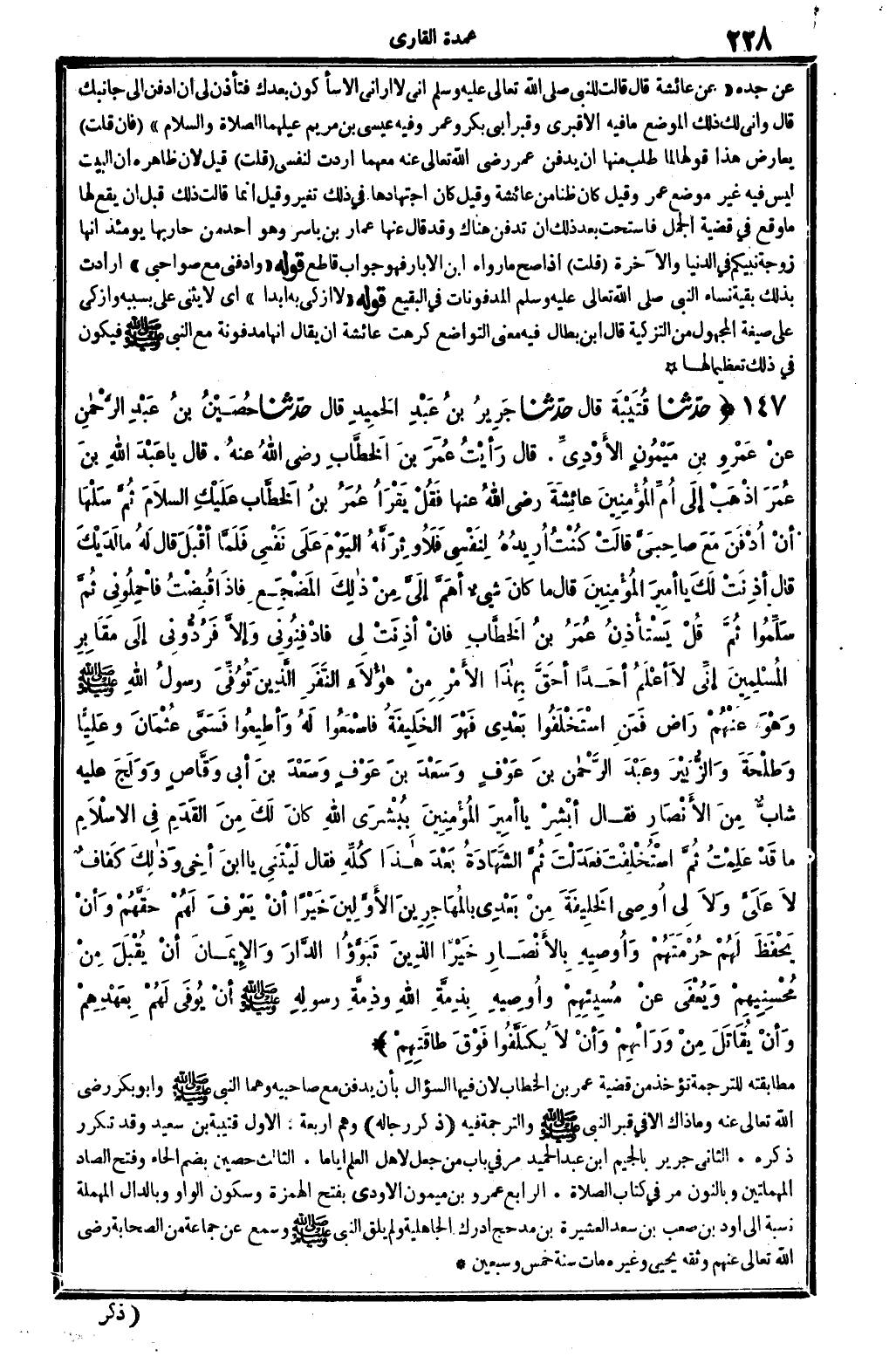 2931 - حدَّثنا قُتَيْبَةُ قَالَ حدَّثنا جَرِيرُ بنُ عَبْدِ الحَمِيدِ قَالَ حدَّثنا حُصَيْنُ بنُ عَبْدِ الرَّحْمانِ عنْ عَمْرِو بنِ مَيْمُونٍ الأوْدِيِّ. قَالَ رَأيْتُ عُمَرَ بنَ الخَطَّابِ رَضِي الله تَعَالَى عنهُ. قَالَ يَا عَبْدَ الله بنَ عُمَرَ اذْهَبْ إلَى أُمِّ المُؤْمِنِينَ عائِشَةَ رَضِي الله تَعَالَى عَنْهَا فَقُلْ يَقْرَأُ عُمَرُ بنُ الخَطَّابِ عَلَيْكِ السَّلاَمَ ثُمَّ سَلْهَا أنْ أُدْفَنَ مَعَ صَاحِبَيَّ قالَتْ كُنْتُ أُرِيدُهُ لِنَفْسِي فَلأُوثِرَنَّهُ اليَوْمَ عَلَى نَفْسِي فَلَمَّا أقْبَلَ قَالَ لَهُ مَا لَدَيْكَ قَالَ أذِنَتْ لَكَ يَا أمِيرَ الْمُؤْمِنِينَ قَالَ مَا كانَ شَيءٌ أهَمَّ إلَيَّ مِنْ ذالِكَ الْمَضْجَعِ فإذَا قُبِضْتُ فاحْمِلُونِي ثُمَّ سَلِّمُوا ثُمَّ قُلْ يَسْتَأذِنُ عُمَرُ بنُ الخَطَّابِ فإنْ أذِنَتْ لِي فادْفِنُونِي وَإلاَّ فَرُدُّونِي إلَى مقَابِرِ المُسْلِمِينَ إنِّي لاَ أعْلَمُ أحَدا أحَقَّ بِهاذَا الأمْرِ مِنْ هاؤُلاَءِ النَّفر الَّذِيَ تُوُفِّيَ رسولُ الله صلى الله عَلَيْهِ وَسلم وَهْوَ عَنْهُمْ رَاض فَمَنِ اسْتَخْلَفُوا بَعْدِي فَهْوَ الخَلِيفَةُ فاسْمَعُوا لَهُ وأطِيعُوا فَسَمَّى عُثْمَانَ وعَلِيَّا وَطَلْحَةَ وَالزُّبَيْرَ وَعَبْدَ الرَّحْمانِ بنَ عَوْفٍ وَسَعْدَ بنَ أبِي وَقَّاصٍ وَوَلَجَ عَلَيْهِ شابٌّ مِنَ الأنْصَارِ فَقَالَ أبْشِرْ يَا أمِيرَ المُؤمِنِينَ بِبُشْرَى الله كانَ لَكَ مِنَ القَدَمِ فِي الإسْلاَمِ مَا قَدْ عَلِمْتُ ثُمَّ اسْتُخْلِفْتَ فَعَدَلْتَ ثُمَّ الشَّهَادَةُ بَعْدَ هاذا كُلِّهِ فَقَالَ لَيْتنِي يَا ابنَ أخِي وَذالِكَ كَفافٌ لاَ عَلَيَّ وَلاَ لِي أُوصِي الخَلِيفَةَ مِنْ بَعْدِي بالمُهَاجِرِينَ الأوَّلِينَ خَيْرا أنْ يَعْرِفَ لَهُمْ حَقَّهُمْ وَأنْ يَحْفَظَ لَهُمْ حُرْمَتَهُمْ وَأُوصِيهِ بِالأنْصَارِ خَيْرا الذِينَ تَبَوَّؤا الدَّارَ وَالإيمَانَ أنْ يُقْبَلَ مِنْ مُحْسِنِيهِمْ ويُعْفَى عنْ مُسِيئِهِمْ وَأُوصِيهِ بِذِمَّةِ الله وذِمَّةِ رسولهِ صلى الله عَلَيْهِ وَسلم أنْ يُوفَى لَهُمْ بِعَهْدِهِمْ وَأنْ يُقَاتَلَ مِنْ وَرَائِهِمْ وَأنْ لاَ يُكَلَّفُوا فَوْقَ طاقَتِهِمْ..