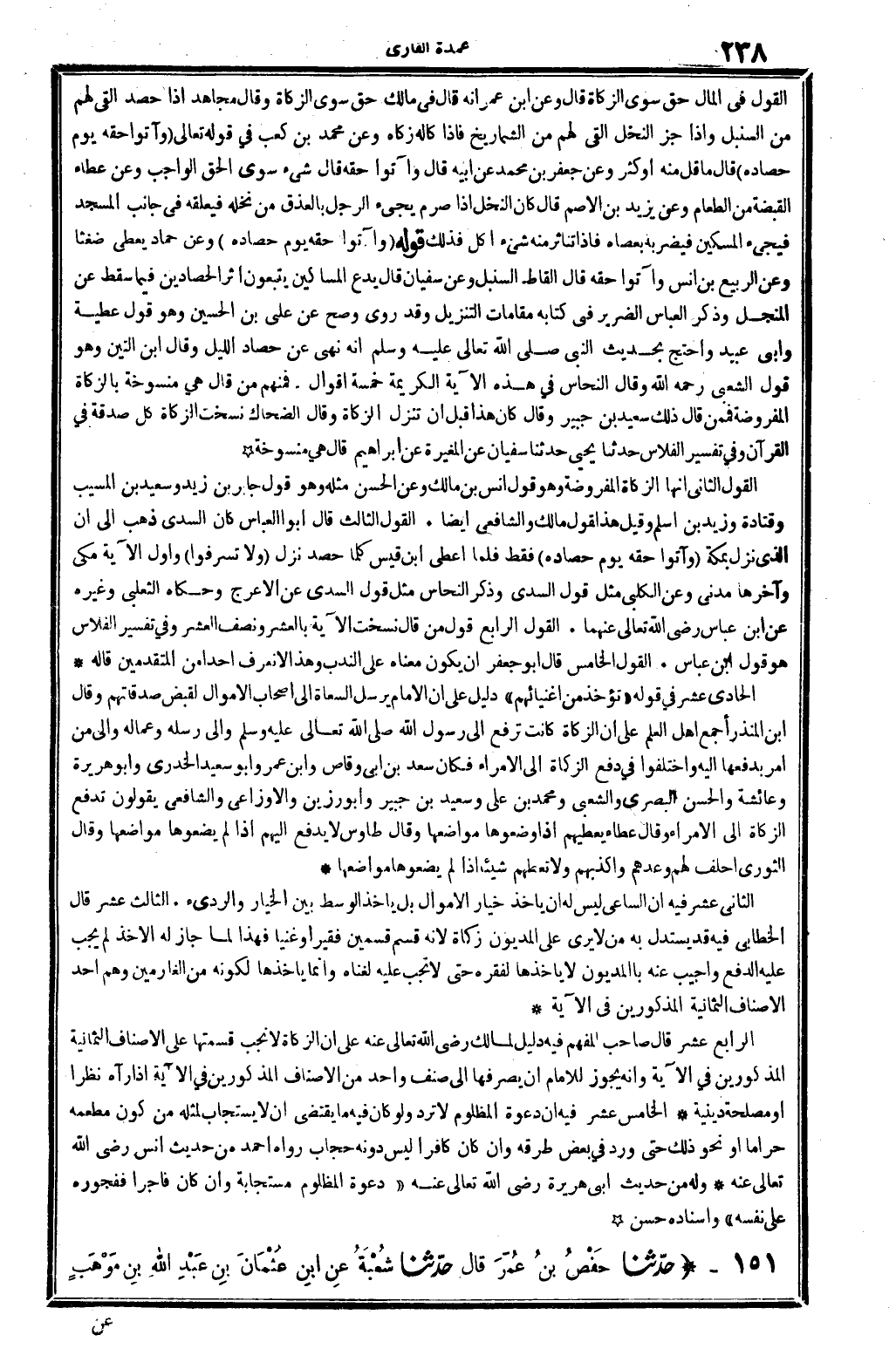 القَوْل: فِي المَال حق سوى الزَّكَاة. قَالَ: وَعَن ابْن عمر أَنه قَالَ: فِي مَالك حق سوى الزَّكَاة. وَقَالَ مُجَاهِد إِذا حصد ألْقى لَهُم من السنبل، وَإِذا جز النّخل ألْقى لَهُم من الشماريخ، فَإِذا كاله زَكَّاهُ. وَعَن مُحَمَّد بن كَعْب، فِي قَوْله تَعَالَى: {وَآتوا حَقه يَوْم حَصَاده} (الْأَنْعَام: 141) . قَالَ: مَا قل مِنْهُ أَو كثر، وَعَن جَعْفَر بن مُحَمَّد عَن أَبِيه، قَالَ: وَآتوا حَقه، قَالَ: شَيْء سوى الْحق الْوَاجِب، وَعَن عَطاء: القبضة من الطَّعَام، وَعَن يزِيد بن الْأَصَم، قَالَ: كَانَ النّخل إِذا صرم يَجِيء الرجل بالعذق من نخله فيعلقه فِي جَانب الْمَسْجِد، فَيَجِيء الْمِسْكِين فيضربه بعصاه، فَإِذا تناثر مِنْهُ شَيْء أكل، فَذَلِك قَوْله: {وَآتوا حَقه يَوْم حَصَاده} (الْأَنْعَام: 141) . وَعَن حَمَّاد: يُعْطي ضغثا، وَعَن الرّبيع بن أنس: وَآتوا حَقه. قَالَ إلقاط السنبل، وَعَن سُفْيَان قَالَ: يدع الْمَسَاكِين يتبعُون أثر الحصادين فِيمَا سقط عَن المنجل، وَذكر الْعَبَّاس الضَّرِير فِي كِتَابه (مقامات التَّنْزِيل) : وَقد رُوِيَ وَصَحَّ عَن عَليّ بن الْحُسَيْن، وَهُوَ قَول عَطِيَّة وَأبي عبيد، وَاحْتج بِحَدِيث النَّبِي صلى الله عَلَيْهِ وَسلم، أَنه: نهى عَن حصاد اللَّيْل. وَقَالَ ابْن التِّين: وَهُوَ قَول الشّعبِيّ، رَحمَه الله، وَقَالَ النّحاس: فِي هَذِه الْآيَة الْكَرِيمَة خَمْسَة أَقْوَال: فَمنهمْ من قَالَ هِيَ مَنْسُوخَة بِالزَّكَاةِ الْمَفْرُوضَة، فَمِمَّنْ قَالَ ذَلِك، سعيد بن جُبَير، وَقَالَ: كَانَ هَذَا قبل أَن تنزل الزَّكَاة، وَقَالَ الضَّحَّاك: نسخت الزَّكَاة فِي كل صَدَقَة فِي الْقُرْآن، وَفِي تَفْسِير الفلاس: حَدثنَا يحيى حَدثنَا سُفْيَان عَن الْمُغيرَة عَن إِبْرَاهِيم، قَالَ: هِيَ مَنْسُوخَة. القَوْل الثَّانِي: إِنَّهَا الزَّكَاة الْمَفْرُوضَة، وَهُوَ قَول أنس بن مَالك، وَعَن الْحسن مثله، وَهُوَ قَول جَابر بن زيد وَسَعِيد بن الْمسيب وَقَتَادَة وَزيد بن أسلم، وَقيل: هَذَا قَول مَالك وَالشَّافِعِيّ أَيْضا. القَوْل الثَّالِث: قَالَ أَبُو الْعَبَّاس: كَأَن السّديّ ذهب إِلَى أَن الَّذِي نزل بِمَكَّة: {وَآتوا حَقه يَوْم حَصَاده} (الْأَنْعَام: 141) . فَقَط، فَلَمَّا أعْطى ابْن قيس كلما حصد، نزل: {وَلَا تسرفوا} (الْأَنْعَام: 141) . وَأول الْآيَة مكي وَآخِرهَا مدنِي. وَعَن الْكَلْبِيّ مثل قَول السّديّ، وَذكر النّحاس مثل قَول السّديّ عَن الْأَعْرَج، وَحَكَاهُ الثَّعْلَبِيّ وَغَيره عَن ابْن عَبَّاس، رَضِي الله تَعَالَى عَنْهُمَا. القَوْل الرَّابِع: قَول من قَالَ: نسخت الْآيَة بالعشر وَنصف الْعشْر. وَفِي تَفْسِير الفلاس: هُوَ قَول ابْن عَبَّاس. القَوْل الْخَامِس: قَالَ أَبُو جَعْفَر: أَن يكون مَعْنَاهُ على النّدب، وَهَذَا لَا نَعْرِف أحدا من الْمُتَقَدِّمين قَالَه.