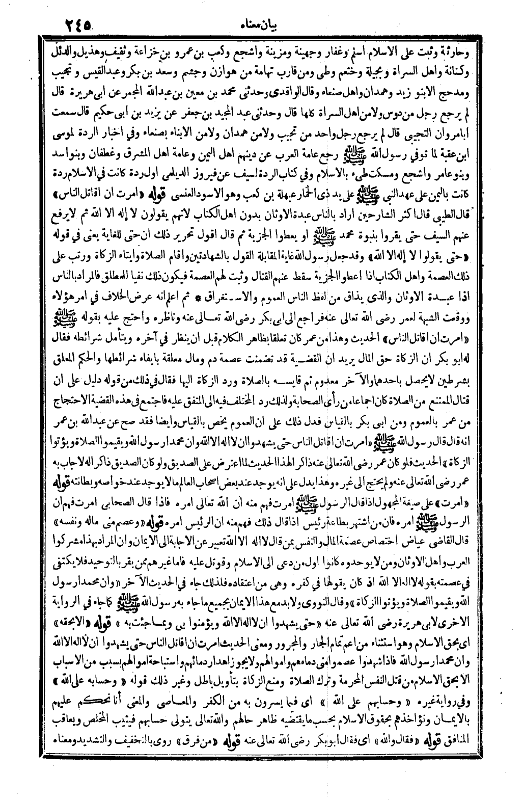 وحارثة وَثَبت على الْإِسْلَام أسلم وغفار وجهينة وَمُزَيْنَة وَأَشْجَع وَكَعب بن عَمْرو بن خُزَاعَة وَثَقِيف وهذيل والدئل وكنانة وَأهل السراة وبجيلة وخثعم وطي وَمن قَارب تهَامَة من هوَازن وجشم وَسعد بن بكر وَعبد الْقَيْس وتجيب ومدحج إِلَّا بَنو زيد وهمدان وَأهل صنعاء وَقَالَ الْوَاقِدِيّ وحَدثني مُحَمَّد بن معِين بن عبد الله المجمر عَن أبي هُرَيْرَة قَالَ لم يرجع رجل من دوس وَلَا من أهل السراة كلهَا قَالَ وحَدثني عبد الْمجِيد بن جَعْفَر عَن يزِيد بن أبي حَكِيم قَالَ سَمِعت أَبَا مَرْوَان التجِيبِي قَالَ لم يرجع رجل وَاحِد من تجيب وَلَا من هَمدَان وَلَا من الْأَبْنَاء بِصَنْعَاء وَفِي أَخْبَار الرِّدَّة لمُوسَى بن عقبَة لما توفّي رَسُول الله - صَلَّى اللَّهُ عَلَيْهِ وَسَلَّم َ - رَجَعَ عَامَّة الْعَرَب عَن دينهم أهل الْيمن وَعَامة أهل الْمشرق وغَطَفَان وَبَنُو أَسد وَبَنُو عَامر وَأَشْجَع ومسكت طَيء بِالْإِسْلَامِ وَفِي كتاب الرِّدَّة لسيف عَن فَيْرُوز الديلمي أول ردة كَانَت فِي الْإِسْلَام ردة كَانَت بِالْيمن على عهد النَّبِي - صَلَّى اللَّهُ عَلَيْهِ وَسَلَّم َ - على يَد ذِي الْخمار عبهلة بن كَعْب وَهُوَ الْأسود الْعَنسِي " أمرت أَن أقَاتل النَّاس " قَالَ الطَّيِّبِيّ قَالَ أَكثر الشَّارِحين أَرَادَ بِالنَّاسِ عَبدة الْأَوْثَان بِدُونِ أهل الْكتاب لأَنهم يَقُولُونَ لَا إِلَه إِلَّا الله ثمَّ لَا يرفع عَنْهُم السَّيْف حَتَّى يقرُّوا بنبوة مُحَمَّد - صَلَّى اللَّهُ عَلَيْهِ وَسَلَّم َ - أَو يُعْطوا الْجِزْيَة ثمَّ قَالَ أَقُول تَحْرِير ذَلِك أَن حَتَّى للغاية يَعْنِي فِي قَوْله " حَتَّى يَقُولُوا لَا إِلَه إِلَّا الله " وَقد جعل رَسُول الله غَايَة الْمُقَابلَة القَوْل بِالشَّهَادَتَيْنِ وإقام الصَّلَاة وإيتاء الزَّكَاة ورتب على ذَلِك الْعِصْمَة وَأهل الْكتاب إِذا أعْطوا الْجِزْيَة سقط عَنْهُم الْقِتَال وَثَبت لَهُم الْعِصْمَة فَيكون ذَلِك نفيا للمطلق فَالْمُرَاد بِالنَّاسِ إِذا عَبدة الْأَوْثَان وَالَّذِي يذاق من لفظ النَّاس الْعُمُوم والاستغراق ثمَّ اعْلَم أَنه عرض الْخلاف فِي هَؤُلَاءِ وَوَقعت الشُّبْهَة لعمر رَضِي الله تَعَالَى عَنهُ فراجع إِلَى أبي بكر رَضِي الله تَعَالَى عَنهُ وناظره وَاحْتج عَلَيْهِ بقوله - صَلَّى اللَّهُ عَلَيْهِ وَسَلَّم َ - " أمرت أَن أقَاتل النَّاس " الحَدِيث وَهَذَا من عمر كَانَ تعلقا بِظَاهِر الْكَلَام قبل أَن ينظر فِي آخِره ويتأمل شَرَائِطه فَقَالَ لَهُ أَبُو بكر إِن الزَّكَاة حق المَال يُرِيد أَن الْقَضِيَّة قد تَضَمَّنت عصمَة دم وَمَال معلقَة بإيفاء شرائطها وَالْحكم الْمُعَلق بِشَرْطَيْنِ لَا يحصل بِأَحَدِهِمَا وَالْآخر مَعْدُوم ثمَّ قايسه بِالصَّلَاةِ ورد الزَّكَاة إِلَيْهَا فَقَالَ فِي ذَلِك من قَوْله دَلِيل على أَن قتال الْمُمْتَنع من الصَّلَاة كَانَ إِجْمَاعًا من رَأْي الصَّحَابَة وَلذَلِك رد الْمُخْتَلف فِيهِ إِلَى الْمُتَّفق عَلَيْهِ فَاجْتمع فِي هَذِه الْقَضِيَّة الِاحْتِجَاج من عمر بِالْعُمُومِ وَمن أبي بكر بِالْقِيَاسِ فَدلَّ ذَلِك على أَن الْعُمُوم يخص بِالْقِيَاسِ وَأَيْضًا فقد صَحَّ عَن عبد الله بن عمر أَنه قَالَ قَالَ رَسُول الله - صَلَّى اللَّهُ عَلَيْهِ وَسَلَّم َ - " أمرت أَن أقَاتل النَّاس حَتَّى يشْهدُوا أَن لَا إِلَه إِلَّا الله وَأَن مُحَمَّدًا رَسُول الله ويقيموا الصَّلَاة ويؤتوا الزَّكَاة " الحَدِيث فَلَو كَانَ عمر رَضِي الله تَعَالَى عَنهُ ذَاكِرًا لهَذَا الحَدِيث لما اعْترض على الصّديق وَلَو كَانَ الصّديق ذَاكِرًا لَهُ لأجاب بِهِ عمر رَضِي الله تَعَالَى عَنهُ وَلم يحْتَج إِلَى غَيره وَهَذَا يدل على أَنه يُوجد عِنْد بعض أَصْحَاب الْعَالم مَا لَا يُوجد عِنْد خواصه وبطانته قَوْله " أمرت " على صِيغَة الْمَجْهُول إِذا قَالَ رَسُول الله - صَلَّى اللَّهُ ع