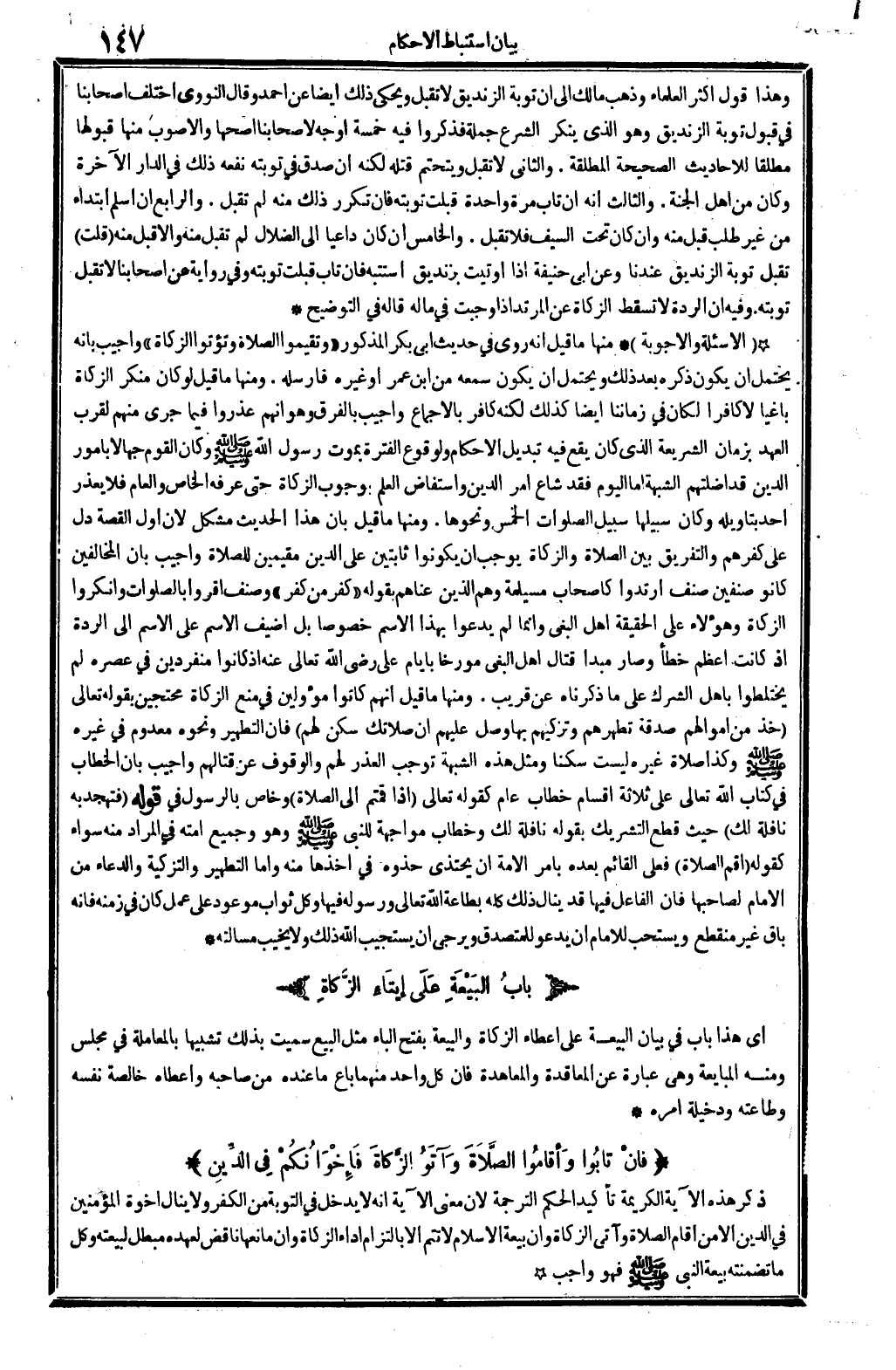 ذكر هَذِه الْآيَة الْكَرِيمَة تَأْكِيدًا لحكم التَّرْجَمَة، لِأَن معنى الْآيَة أَنه: لَا يدْخل فِي التَّوْبَة من الْكفْر وَلَا ينَال أخوة الْمُؤمنِينَ فِي الدّين إلاَّ من أَقَامَ الصَّلَاة وَآتى الزَّكَاة، وَأَن بيعَة الْإِسْلَام لَا تتمّ إلاَّ بِالْتِزَام أَدَاء الزَّكَاة، وَأَن مانعها نَاقص لعهده مُبْطل لبيعته، وكل مَا تضمنته بيعَة النَّبِي صلى الله عَلَيْهِ وَسلم فَهُوَ وَاجِب.