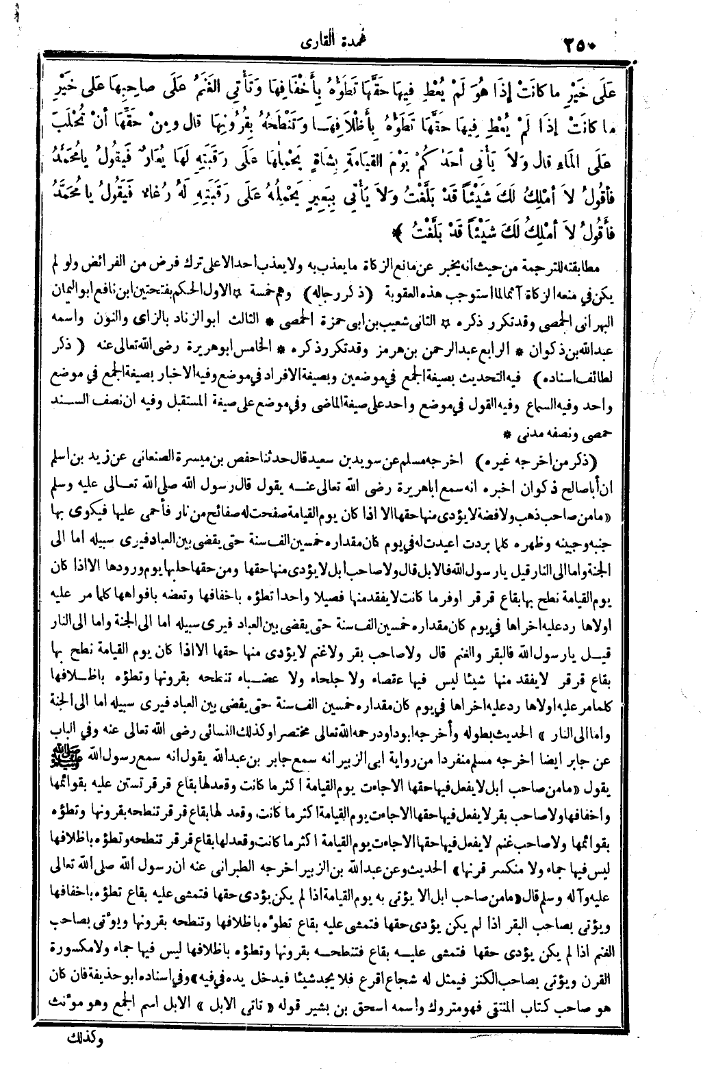 ذكر من أخرجه غَيره: أخرجه مُسلم عَن سُوَيْد بن سعيد، قَالَ: حَدثنَا حَفْص بن ميسرَة الصَّنْعَانِيّ عَن زيد بن أسلم أَن أَبَا صَالح ذكْوَان أخبرهُ أَنه سمع أَبَا هُرَيْرَة، رَضِي الله تَعَالَى عَنهُ، يَقُول: قَالَ رَسُول الله، صلى الله عَلَيْهِ وَسلم: (مَا من صَاحب ذهب وَلَا فضَّة لَا يُؤَدِّي مِنْهَا حَقّهَا إلاَّ إِذا كَانَ يَوْم الْقِيَامَة صفحت لَهُ صَفَائِح من نَار فأحمى عَلَيْهَا فيكوى بهَا جنبه وجبينه، وظهره كلما بردت أُعِيدَت لَهُ فِي يَوْم كَانَ مقدراه خمسين ألف سنة حَتَّى يقْضى بَين الْعباد، فَيرى سَبيله إِمَّا إِلَى الْجنَّة وَإِمَّا إِلَى النَّار. قيل: يَا رَسُول الله فالإبل؟ قَالَ: وَلَا صَاحب إبل لَا يُؤَدِّي مِنْهَا حَقّهَا، وَمن حَقّهَا حلبها يَوْم وُرُودهَا إلاَّ إِذا كَانَ يَوْم الْقِيَامَة نطح بهَا بقاع قرقر أوفر مَا كَانَت لَا يفقد مِنْهَا فصيلاً وَاحِدًا تطؤه بأخفافها وتعضه بأفواهها كلما مر عَلَيْهِ أولاها رد عَلَيْهِ أخراها فِي يَوْم كَانَ مِقْدَاره خمسين ألف سنة، حَتَّى يقْضى بَين الْعباد فَيرى سَبيله إِمَّا إِلَى الْجنَّة وَإِمَّا إِلَى النَّار. قيل: يَا رَسُول الله، فالبقر وَالْغنم؟ قَالَ: وَلَا صَاحب بقر وَلَا غنم لَا يُؤَدِّي مِنْهَا حَقّهَا إلاَّ إِذا كَانَ يَوْم الْقِيَامَة نطح بهَا بقاع قرقر لَا يفقد مِنْهَا شَيْئا لَيْسَ فِيهَا عقصاء وَلَا جلحاء وَلَا عضباء تنطحه بقرونها وتطؤه بأظلافها كلما مر عَلَيْهِ أولاها رد عَلَيْهِ أخراها فِي يَوْم كَانَ مِقْدَاره خمسين ألف سنة حَتَّى يقْضِي بَين الْعباد فَيرى سَبيله إِمَّا إِلَى الْجنَّة وَإِمَّا إِلَى النَّار. .) الحَدِيث بِطُولِهِ، وَأخرجه أَبُو دَاوُد رَحمَه الله تَعَالَى، مُخْتَصرا، وَكَذَلِكَ النَّسَائِيّ، رَضِي الله تَعَالَى عَنهُ، وَفِي الْبَاب عَن جَابر أَيْضا أخرجه مُسلم مُنْفَردا من رِوَايَة أبي الزبير أَنه سمع جَابر بن عبد الله يَقُول: إِنَّه سمع رَسُول الله صلى الله عَلَيْهِ وَسلم يَقُول: (مَا من صَاحب إبل لَا يفعل فِيهَا حَقّهَا إلاَّ جَاءَت يَوْم الْقِيَامَة أَكثر مَا كَانَت وَقعد لَهَا بقاع قرقر تستن عَلَيْهِ بقوائمها وأخفافها، وَلَا صَاحب بقر لَا يفعل فِيهَا حَقّهَا إلاَّ جَاءَت يَوْم الْقِيَامَة أَكثر مَا كَانَت وَقعد لَهَا بقاع قرقر تنطحه بقرونها وتطؤه بقوائمها، وَلَا صَاحب غنم لَا يفعل فِيهَا حَقّهَا إلاَّ جَاءَت يَوْم الْقِيَامَة أَكثر مَا كَانَت وَقعد لَهَا بقاع قرقر تنطحه وتطؤه بأظلافها لَيْسَ فِيهَا جماء وَلَا منكسر قرنها. .) الحَدِيث، وَعَن عبد الله بن الزبير أخرجه الطَّبَرَانِيّ عَنهُ: أَن رَسُول الله، صلى الله عَلَيْهِ وَسلم، قَالَ: (مَا من صَاحب إبل إلاَّ يُؤْتى بِهِ يَوْم الْقِيَامَة إِذا لم يكن يُؤَدِّي حَقّهَا فتمشي عَلَيْهِ بقاع تطؤه بأخفافها وَيُؤْتى بِصَاحِب الْبَقر إِذا لم يكن يُؤَدِّي حَقّهَا فتمشي عَلَيْهِ بقاع تطؤه بأظلافها وتنطحه بقرونها، وَيُؤْتى بِصَاحِب الْغنم إِذا لم يكن يُؤَدِّي حَقّهَا فتمشي عَلَيْهِ بقاع فتنطحه بقرونها وتطؤه بأظلافها لَيْسَ فِيهَا جماء وَلَا مَكْسُورَة الْقرن، وَيُؤْتى بِصَاحِب الْكَنْز فيمثل لَهُ شُجَاع أَقرع فَلَا يجد شَيْئا فَيدْخل يَده فِي فِيهِ) . وَفِي إِسْنَاده أَبُو حُذَيْفَة، فَإِن كَانَ هُوَ صَاحب كتاب الْمُنْتَقى فَهُوَ مَتْرُوك، واسْمه إِسْحَاق بن بشير. قَوْله: (تَأتي الْإِبِل) الْإِبِل اسْم الْجمع وَهُوَ مؤنث