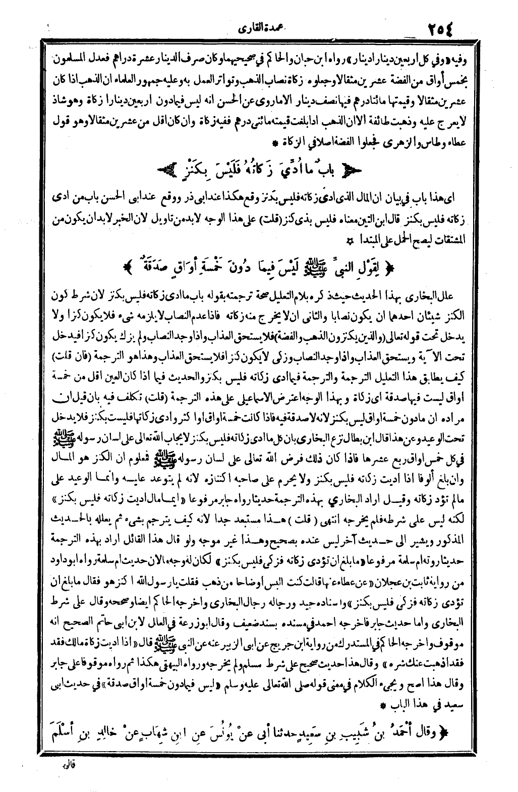 علل البُخَارِيّ بِهَذَا الحَدِيث حَيْثُ ذكره بلام التَّعْلِيل صِحَة تَرْجَمته بقوله: بَاب مَا أُدي زَكَاته فَلَيْسَ بكنز، لِأَن شَرط كَون الْكَنْز شَيْئَانِ أَحدهمَا أَن يكون نِصَابا، وَالثَّانِي أَن لَا يخرج مِنْهُ زَكَاته فَإِذا عدم النّصاب لَا يلْزمه شَيْء فَلَا يكون كنزا، وَلَا يدْخل تَحت قَوْله تَعَالَى: {وَالَّذين يكنزون الذَّهَب وَالْفِضَّة} (التَّوْبَة: 43) . فَلَا يسْتَحق الْعَذَاب وَإِذا وجد النّصاب وَلم يزك يكون كنزا، فَيدْخل تَحت الْآيَة، وَيسْتَحق الْعَذَاب، وَإِذا وجد النّصاب وزكى لَا يكون كنزا فَلَا يسْتَحق الْعَذَاب، وَهَذَا هُوَ التَّرْجَمَة. فَإِن قلت: كَيفَ يُطَابق هَذَا التَّعْلِيل التَّرْجَمَة والترجمة فِيمَا أُدي زَكَاته فَلَيْسَ بكنز، والْحَدِيث فِيمَا إِذا كَانَ الْعين أقل من خَمْسَة أَوَاقٍ لَيست فِيهَا صَدَقَة، أَي: زَكَاة، وَبِهَذَا الْوَجْه اعْترض الْإِسْمَاعِيلِيّ على هَذِه التَّرْجَمَة. قلت: تكلّف فِيهِ بِأَن قيل: إِن مُرَاده أَن مَا دون خَمْسَة أَوَاقٍ لَيْسَ بكنز، لِأَنَّهُ لَا صَدَقَة فِيهِ، فَإِذا كَانَت خَمْسَة أَوَاقٍ أَو أَكثر وَأدّى زَكَاتهَا فَلَيْسَتْ بكنز، فَلَا يدْخل تَحت الْوَعيد. وَعَن هَذَا قَالَ ابْن بطال: نزع البُخَارِيّ بِأَن كل مَا أُدي زَكَاته فَلَيْسَ بكنز لإِيجَاب الله تَعَالَى على لِسَان رَسُوله صلى الله عَلَيْهِ وَسلم فِي كل خمس أَوَاقٍ ربع عشرهَا، فَإِذا كَانَ ذَلِك فرض الله تَعَالَى على لِسَان رَسُوله صلى الله عَلَيْهِ وَسلم، فمعلوم أَن الْكَنْز هُوَ المَال وَإِن بلغ ألوفا، إِذا أدّيت زَكَاته فَلَيْسَ بكنز، وَلَا يحرم على صَاحبه اكتنازه لِأَنَّهُ لم يتوعد عَلَيْهِ، وَإِنَّمَا الْوَعيد على مَا لم تُؤَد زَكَاته. وَقيل: أَرَادَ البُخَارِيّ بِهَذِهِ التَّرْجَمَة حَدِيثا رَوَاهُ جَابر مَرْفُوعا: (أَيّمَا مَال أدّيت زَكَاته فَلَيْسَ بكنز) ، لكنه لَيْسَ على شَرطه فَلم يُخرجهُ. انْتهى. قلت: هَذَا مستبعد جدا لِأَنَّهُ كَيفَ يترجم بِشَيْء ثمَّ يعلله بِالْحَدِيثِ الْمَذْكُور وَيُشِير إِلَى حَدِيث آخر لَيْسَ عِنْده بِصَحِيح، وَهَذَا غير موجه، وَلَو قَالَ هَذَا الْقَائِل: أَرَادَ بِهَذِهِ التَّرْجَمَة حَدِيثا روته أم سَلمَة مَرْفُوعا: (مَا بلغ أَن تُؤَدّى زَكَاته فَزكِّي فَلَيْسَ بكنز) ، لَكَانَ لَهُ وَجه مَا، لِأَن حَدِيث أم سَلمَة رَوَاهُ أَبُو دَاوُد من رِوَايَة ثَابت بن عجلَان (عَن عَطاء عَنْهَا قَالَت: كنت ألبس أَوْضَاحًا من ذهب، فَقلت: يَا رَسُول الله أكنز هُوَ؟ فَقَالَ: مَا بلغ أَن تُؤَدّى زَكَاته فَزكِّي فَلَيْسَ بكنز) ، وَإِسْنَاده جيد وَرِجَاله رجال البُخَارِيّ، وَأخرجه الْحَاكِم أَيْضا وَصَححهُ، وَقَالَ: على شَرط البُخَارِيّ. وَأما حَدِيث جَابر فَأخْرجهُ أَحْمد فِي (مُسْنده) بِسَنَد ضَعِيف، وَقَالَ أَبُو زرْعَة فِي (الْعِلَل) لِابْنِ أبي حَاتِم: الصَّحِيح أَنه مَوْقُوف، وَأخرجه الْحَاكِم فِي (الْمُسْتَدْرك) من رِوَايَة ابْن جريج عَن أبي الزبير عَنهُ عَن النَّبِي صلى الله عَلَيْهِ وَسلم قَالَ: (إِذا أدّيت زَكَاة مَالك فقد أذهبت عَنْك شَره) . وَقَالَ: هَذَا حَدِيث صَحِيح على شَرط مُسلم وَلم يُخرجهُ، وَرَوَاهُ الْبَيْهَقِيّ هَكَذَا، ثمَّ رَوَاهُ مَوْقُوفا على جَابر وَقَالَ: هَذَا أصح، وَيَجِيء الْكَلَام فِي معنى قَوْله، صلى الله عَلَيْهِ وَسلم: (لَيْسَ فِيمَا دون خَمْسَة أَوَاقٍ صَدَقَة) فِي حَدِيث أبي سعيد فِي هَذَا الْبَاب.