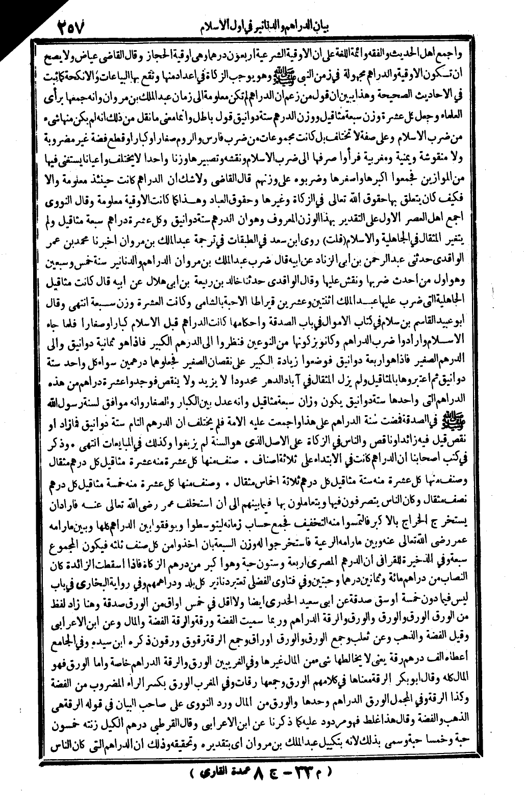 وَأجْمع أهل الحَدِيث وَالْفِقْه وأئمة اللُّغَة على أَن الْأُوقِيَّة الشَّرْعِيَّة: أَرْبَعُونَ درهما، وَهِي أُوقِيَّة الْحجاز. وَقَالَ القَاضِي عِيَاض: وَلَا يَصح أَن تكون الْأُوقِيَّة وَالدَّرَاهِم مَجْهُولَة فِي زمن النَّبِي صلى الله عَلَيْهِ وَسلم وَهُوَ يُوجب الزَّكَاة فِي أعداد مِنْهَا وَتَقَع بهَا الْبياعَات والأنكحة كَمَا ثَبت فِي الْأَحَادِيث الصَّحِيحَة، وَهَذَا يبين أَن قَول من زعم أَن الدَّرَاهِم لم تكن مَعْلُومَة إِلَى زمَان عبد الْملك بن مَرْوَان وَأَنه جمعهَا بِرَأْي الْعلمَاء، وَجعل كل عشرَة وزن سَبْعَة مَثَاقِيل وَوزن الدِّرْهَم سِتَّة دوانيق، قَول بَاطِل، وَإِنَّمَا معنى مَا نقل من ذَلِك أَنه لم يكن مِنْهَا شَيْء من ضرب الْإِسْلَام وعَلى صفة لَا تخْتَلف، بل كَانَت مجموعات من ضرب فَارس وَالروم صغَارًا وكبارا وَقطع فضَّة غير مَضْرُوبَة وَلَا منقوشة ويمنية ومغربية، فَرَأَوْا صرفهَا إِلَى ضرب الْإِسْلَام ونقشه وتصييرها وزنا وَاحِدًا لَا يخْتَلف وأعيانا يسْتَغْنى فِيهَا من الموازين، فَجمعُوا أكبرها وأصغرها وضربوه على وزنهم، قَالَ القَاضِي: وَلَا شكّ أَن الدَّرَاهِم كَانَت حِينَئِذٍ مَعْلُومَة، وَإِلَّا فَكيف كَانَ يتَعَلَّق بهَا حُقُوق الله تَعَالَى فِي الزَّكَاة وَغَيرهَا وَحُقُوق الْعباد وَهَذَا كَمَا كَانَت الْأُوقِيَّة مَعْلُومَة. وَقَالَ النَّوَوِيّ: أجمع أهل الْعَصْر الأول على التَّقْدِير بِهَذَا الْوَزْن الْمَعْرُوف، وَهُوَ أَن الدِّرْهَم سِتَّة دوانيق، وكل عشرَة دَرَاهِم سَبْعَة مَثَاقِيل وَلم يتَغَيَّر المثقال فِي الْجَاهِلِيَّة وَالْإِسْلَام. قلت: روى ابْن سعد فِي (الطَّبَقَات) فِي تَرْجَمَة عبد الْملك بن مَرْوَان: أخبرنَا مُحَمَّد بن عمر الْوَاقِدِيّ حَدثنِي عبد الرَّحْمَن بن أبي الزِّنَاد عَن أَبِيه، قَالَ: ضرب عبد الْملك بن مَرْوَان الدَّرَاهِم وَالدَّنَانِير سنة خمس وَسبعين، وَهُوَ أول من أحدث ضربهَا وَنقش عَلَيْهَا. وَقَالَ الْوَاقِدِيّ: حَدثنَا خَالِد بن ربيعَة بن أبي هِلَال عَن أَبِيه، قَالَ: كَانَت مَثَاقِيل الْجَاهِلِيَّة الَّتِي ضرب عَلَيْهَا عبد الْملك اثْنَتَيْنِ وَعشْرين قيراطا إلاَّ حَبَّة بالشامي، وَكَانَت الْعشْرَة وزن سَبْعَة. انْتهى. وَقَالَ أَبُو عبيد الْقَاسِم بن سَلام فِي (كتاب الْأَمْوَال) ، فِي: بَاب الصَّدَقَة وأحكامها: كَانَت الدَّرَاهِم قبل الْإِسْلَام كبارًا أَو صغَارًا فَلَمَّا جَاءَ الْإِسْلَام وَأَرَادُوا ضرب الدَّرَاهِم وَكَانُوا يزكونها من النَّوْعَيْنِ فنظروا إِلَى الدارهم الْكَبِير فَإِذا هُوَ ثَمَانِيَة دوانق وَإِلَى الدِّرْهَم الصَّغِير فَإِذا عو أَرْبَعَة دوانق فوضعوا زِيَادَة الْكَبِير على نُقْصَان الصَّغِير فجعلوهما دِرْهَمَيْنِ سَوَاء كل وَاحِد سِتَّة دوانيق، ثمَّ اعتبروها بالمثاقيل، وَلم يزل المثقال فِي آباد الدَّهْر محدودا لَا يزِيد وَلَا ينقص، فوجدوا عشرَة دَرَاهِم من هَذِه الدَّرَاهِم الَّتِي وَاحِدهَا سِتَّة دوانيق يكون وزان سَبْعَة مَثَاقِيل، وَأَنه عدل بَين الْكِبَار وَالصغَار، وَأَنه مُوَافق لسنة رَسُول الله صلى الله عَلَيْهِ وَسلم فِي الصَّدَقَة، فمضت سنة الدَّرَاهِم على هَذَا، وأجمعت عَلَيْهِ الْأمة فَلم يخْتَلف أَن الدِّرْهَم التَّام ستت دوانيق فَمَا زَاد أَو نقص قيب فِيهِ زَائِدا وناقص وَالنَّاس فِي الزَّكَاة على الأَصْل الَّذِي هم السّنة لم يزيغوا وَكَذَلِكَ فِي المبايعات انْتهى وَذكر فِي كتب أَصْحَابنَا أَن الدَّرَاهِم كَانَت فِي الِابْتِدَاء على لى ثَلَاثَة أَصْنَاف: صنف: مِنْهَا: كل عشرَة مِنْهُ عشرَة مَثَاقِيل، كل دِرْهَم مِثْقَال. وصنف: مِنْهَا كل عشرَة مِنْهُ سِتَّة مَثَاقِيل، كل دِرْهَم ثَلَاثَة أَخْمَاس مِثْقَال. وصنف: مِنْهَا كل عشرَة مِنْهُ خَمْسَة مَثَاقِيل، كل دِرْهَم نصف مِثْقَال، وَكَانَ النَّا