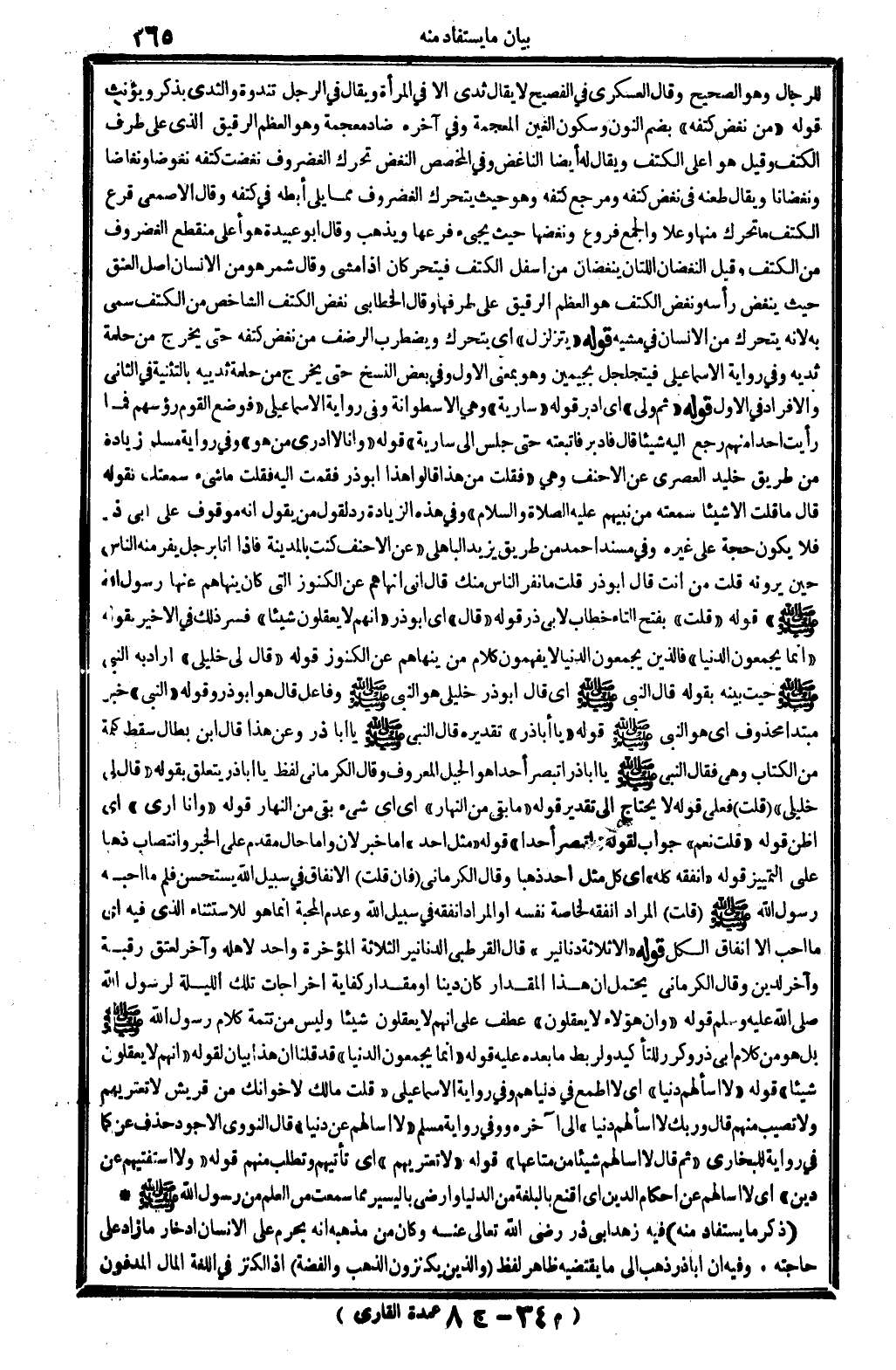 للرِّجَال وَهُوَ الصَّحِيح، وَقَالَ العسكري فِي (الفصيح) ؛ لَا يُقَال ثدي إلاَّ فِي الْمَرْأَة، وَيُقَال فِي الرجل تندوة، والثدي يذكر وَيُؤَنث قَوْله: (من نغض كتفه) ، بِضَم النُّون وَسُكُون الْغَيْن الْمُعْجَمَة وَفِي آخِره ضاد مُعْجمَة: وَهُوَ الْعظم الرَّقِيق الَّذِي على طرف الْكَتف، وَقيل: هُوَ أَعلَى الْكَتف، وَيُقَال لَهُ أَيْضا: الناغض. وَفِي (الْمُخَصّص) : النغض تحرّك الغضروف، نغضت كتفه نغوضا ونغاضا ونغضانا. وَيُقَال: طعنه فِي نغض كتفه، ومرجع كتفه وَهُوَ حَيْثُ يَتَحَرَّك الغضروف مِمَّا يَلِي إبطه فِي كتفه. وَقَالَ الْأَصْمَعِي: قرع الْكَتف مَا تحرّك مِنْهَا وَعلا، وَالْجمع فروع، ونغضها حَيْثُ يَجِيء فرعها، وَيذْهب. وَقَالَ أَبُو عُبَيْدَة: هُوَ أَعلَى مُنْقَطع الغضروف من الْكَتف. وَقيل: النغضان اللَّتَان ينغضان من أَسْفَل الْكَتف فيتحركان إِذا مَشى. وَقَالَ شمر: هُوَ من الْإِنْسَان أصل الْعُنُق حَيْثُ ينغض رَأسه، ونغض الْكَتف هُوَ الْعظم الرَّقِيق على طرفها. وَقَالَ الْخطابِيّ: نغض الْكَتف الشاخص من الْكَتف، سمي بِهِ لِأَنَّهُ يَتَحَرَّك من الْإِنْسَان فِي مَشْيه. قَوْله: (يتزلزل) أَي: يَتَحَرَّك ويضطرب الرضف من نغض كتفه حَتَّى يخرج من حلمة ثديه، وَفِي رِوَايَة الْإِسْمَاعِيلِيّ: فيتجلجل بجيمين، وَهُوَ بِمَعْنى الأول، وَفِي بعض النّسخ حَتَّى يخرج من حلمة ثدييه، بالتثنية فِي الثَّانِي والإفراد فِي الأول. قَوْله: (ثمَّ ولى) أَي: أدبر قَوْله (سَارِيَة) وَهِي الاسطوانة وَفِي رِوَايَة الْإِسْمَاعِيلِيّ فَوضع الْقَوْم رُؤْسهمْ فَمَا رَأَيْت أحدا مِنْهُم رَجَعَ إِلَيْهِ شَيْئا قَالَ فادبر فاتبعته حَتَّى جلس إِلَى سَارِيَة) . قَوْله: (وَأَنا لَا أَدْرِي من هُوَ) ، وَفِي رِوَايَة مُسلم زِيَادَة من طَرِيق خُلَيْد العصري عَن الْأَحْنَف، وَهِي: (فَقلت: من هَذَا؟ قَالُوا: هَذَا أَبُو ذَر، فَقُمْت إِلَيْهِ فَقلت: مَا شَيْء سَمِعتك تَقوله؟ قَالَ: مَا قلت إلاَّ شَيْئا سمعته من نَبِيّهم، صلى الله عَلَيْهِ وَسلم) . وَفِي هَذِه الزِّيَادَة رد لقَوْل من يَقُول: إِنَّه مَوْقُوف على أبي ذَر، فَلَا يكون حجَّة على غَيره. وَفِي (مُسْند أَحْمد) من طَرِيق يزِيد الْبَاهِلِيّ: (عَن الْأَحْنَف: كنت بِالْمَدِينَةِ فَإِذا أَنا بِرَجُل يفر مِنْهُ النَّاس حِين يرونه، قلت: من أَنْت؟ قَالَ: أَبُو ذَر. قلت: مَا نفر النَّاس مِنْك؟ قَالَ: إِنِّي أنهاهم عَن الْكُنُوز الَّتِي كَانَ ينهاهم عَنْهَا رَسُول الله، صلى الله عَلَيْهِ وَسلم) . قَوْله: قلت: بِفَتْح التَّاء، خطاب لأبي ذَر. قَوْله: (قَالَ) أَي: أَبُو ذَر: (إِنَّهُم لَا يعْقلُونَ شَيْئا) ، فسر ذَلِك فِي الْأَخير بقوله: (إِنَّمَا يجمعُونَ الدُّنْيَا) ، فَالَّذِينَ يجمعُونَ الدُّنْيَا لَا يفهمون كَلَام من ينهاهم عَن الْكُنُوز. قَوْله: (قَالَ لي خليلي) أَرَادَ بِهِ النَّبِي صلى الله عَلَيْهِ وَسلم حَيْثُ بَينه بقوله، قَالَ النَّبِي صلى الله عَلَيْهِ وَسلم أَي: قَالَ أَبُو ذَر: خليلي هُوَ النَّبِي صلى الله عَلَيْهِ وَسلم، وفاعل: قَالَ، هُوَ أَبُو ذَر. وَقَوله: (النَّبِي) ، خبر مُبْتَدأ مَحْذُوف أَي: هُوَ النَّبِي صلى الله عَلَيْهِ وَسلم. قَوْله: (يَا أَبَا ذَر) ، تَقْدِيره: قَالَ النَّبِي صلى الله عَلَيْهِ وَسلم: يَا أَبَا ذَر، وَعَن هَذَا قَالَ ابْن بطال: سقط كلمة من الْكتاب، وَهِي: فَقَالَ النَّبِي صلى الله عَلَيْهِ وَسلم يَا أَبَا ذَر أتبصر أُحدا؟ هُوَ الْجَبَل الْمَعْرُوف. وَقَالَ الْكرْمَانِي: لفظ يَا أَبَا ذَر يتَعَلَّق بقوله: (قَالَ لي خليلي) . قلت: فعلى قَوْله لَا يحْتَاج إِلَى تَقْدِير. قَوْله: (مَا بَقِي من النَّهَار) ، أَي: أَي شَيْء بَقِي من النَّهَار. قَوْله: (وَأَنا أرى) ، أَي: أَظن. قَوْله: (قلت: نعم) ، جَوَاب لقَوْله: (أتبصر أُحُدا) قَوْله: (مثل أحد) إِمَّا خبر لِأَن، وَإِمَّا حَال مقدم على الْخَبَر. وانتصاب (ذَهَبا) ع