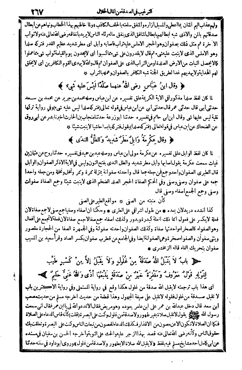 لما كَانَ لفظ الوابل علق تَفْسِيره عَن عِكْرِمَة مولى ابْن عَبَّاس، وَوَصله عبد بن حميد فِي (تَفْسِيره) : حَدثنَا روح عَن عُثْمَان بن غياث، سَمِعت عِكْرِمَة يَقُول: أَصَابَهَا وابل مطر شَدِيد، والطل: الندى، بِفَتْح النُّون، وَلَيْسَ فِي الْآيَة إلاَّ ذكر الصفوان والوابل. قَالَ الطَّبَرِيّ: الصفوان وَاحِد وَجمع، فَمن جعله جمعا قَالَ: واحدته صفوانة بِمَنْزِلَة: تَمْرَة وتمر ونخل ونخلة، وَمن جعله وَاحِدًا جمعه على صَفْوَان وصفى وصفى. وَفِي (الْمُحكم) : الصفاة الْحجر الصلد الضخم الَّذِي لَا ينْبت شَيْئا وَجمع الصفاة صغوات وصفى، وَجمع الْجمع: أصفاء وصفي، قَالَ: