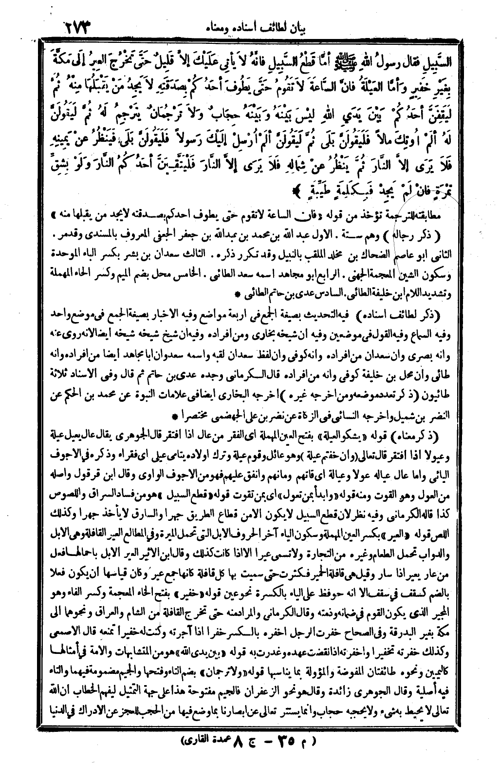 السَّبِيل فَقَالَ رَسُول الله - صَلَّى اللَّهُ عَلَيْهِ وَسَلَّم َ - أما قطع السَّبِيل فَإِنَّهُ لَا يَأْتِي عَلَيْك إِلَّا قَلِيل حَتَّى تخرج العير إِلَى مَكَّة بِغَيْر خفير وَأما الْعيلَة فَإِن السَّاعَة لَا تقوم حَتَّى يطوف أحدكُم بِصَدَقَتِهِ لَا يجد من يقبلهَا مِنْهُ ثمَّ ليقفن أحدكُم بَين يَدي الله لَيْسَ بَينه وَبَينه حجاب وَلَا ترجمان يترجم لَهُ ثمَّ ليَقُولن لَهُ أم أوتك مَالا فليقولن بلَى ثمَّ ليَقُولن ألم أرسل إِلَيْك رَسُولا فليقولن بلَى فَينْظر عَن يَمِينه فَلَا يرى إِلَّا النَّار ثمَّ ينظر عَن شِمَاله فَلَا يرى إِلَّا النَّار فليتقين أحدكُم النَّار وَلَو بشق تَمْرَة فَإِن لم يجد فبكلمة طيبَة) مطابقته للتَّرْجَمَة تُؤْخَذ من قَوْله " فَإِن السَّاعَة لَا تقوم حَتَّى يطوف أحدكُم بِصَدَقَتِهِ لَا يجد من يقبلهَا مِنْهُ ". (ذكر رِجَاله) وهم سِتَّة. الأول عبد الله بن مُحَمَّد بن عبد الله بن جَعْفَر الْجعْفِيّ الْمَعْرُوف بالمسندي وَقد مر. الثَّانِي أَبُو عَاصِم الضَّحَّاك بن مخلد الملقب بالنبيل وَقد تكَرر ذكره. الثَّالِث سَعْدَان بن بشر بِكَسْر الْبَاء الْمُوَحدَة وَسُكُون الشين الْمُعْجَمَة الْجُهَنِيّ. الرَّابِع أَبُو مُجَاهِد اسْمه سعد الطَّائِي. الْخَامِس مَحل بِضَم الْمِيم وَكسر الْحَاء الْمُهْملَة وَتَشْديد اللَّام ابْن خَليفَة الطَّائِي. السَّادِس عدي بن حَاتِم الطَّائِي (ذكر لطائف إِسْنَاده) فِيهِ التحديث بِصِيغَة الْجمع فِي أَرْبَعَة مَوَاضِع وَفِيه الْإِخْبَار بِصِيغَة الْجمع فِي مَوضِع وَاحِد وَفِيه السماع وَفِيه القَوْل فِي موضِعين وَفِيه أَن شَيْخه بخاري وَمن أَفْرَاده وَفِيه أَن شيخ شَيْخه شَيْخه أَيْضا لِأَنَّهُ روى عَنهُ وَأَنه بَصرِي وَأَن سَعْدَان من أَفْرَاده وَأَنه كُوفِي وَأَن لفظ سَعْدَان لقبه واسْمه سعدوان أَبَا مُجَاهِد أَيْضا من أَفْرَاده وَأَنه طائي وَأَن مَحل بن خَليفَة كُوفِي وَأَنه من أَفْرَاده قَالَ الْكرْمَانِي وجده عدي بن حَاتِم ثمَّ قَالَ وَفِي الْإِسْنَاد ثَلَاثَة طائيون. (ذكر تعدد مَوْضِعه وَمن أخرجه غَيره) أخرجه البُخَارِيّ أَيْضا فِي عَلَامَات النُّبُوَّة عَن مُحَمَّد بن الحكم عَن النَّضر بن شُمَيْل وَأخرجه النَّسَائِيّ فِي الزَّكَاة عَن نضر بن عَليّ الْجَهْضَمِي مُخْتَصرا (ذكر مَعْنَاهُ) قَوْله " يشكو الْعيلَة " بِفَتْح الْعين الْمُهْملَة أَي الْفقر من عَال إِذا افْتقر قَالَ الْجَوْهَرِي يُقَال عَال يعيل عيلة وعيولا إِذا افْتقر قَالَ تَعَالَى {وَإِن خِفْتُمْ عيلة} وَهُوَ عائل وَقوم عيلة وَترك أَوْلَاده يتامى عيلى أَي فُقَرَاء وَذكره فِي الأجوف اليائي وَأما عَال عِيَاله عولا وعيالة أَي قاتهم ومأنهم وَأنْفق عَلَيْهِم فَهُوَ من الأجوف الواوي وَقَالَ ابْن قرقول وَأَصله من الْعَوْل وَهُوَ الْقُوت وَمِنْه قَوْله " وابدأ بِمن تعول " أَي بِمن تقوت قَوْله " قطع السَّبِيل " هُوَ من فَسَاد السراق واللصوص كَذَا قَالَه الْكرْمَانِي وَفِيه نظر لِأَن قطع السَّبِيل لَا يكون إِلَّا من قطاع الطَّرِيق جَهرا وَالسَّارِق لَا يَأْخُذ جَهرا وَكَذَلِكَ اللص قَوْله " العير " بِكَسْر الْعين الْمُهْملَة وَسُكُون الْيَاء آخر الْحُرُوف الْإِبِل الَّتِي تحمل الْميرَة وَفِي الْمطَالع العير الْقَافِلَة وَهِي الْإِبِل وَالدَّوَاب تحمل الطَّعَام وَغَيره من التِّجَارَة وَلَا تسمى عيرًا إِلَّا إِذا كَانَت كَذَلِك وَقَالَ ابْن الْأَثِير العير الْإِبِل بأحمالها فعل من عَار يعير إِذا سَار وَقيل هِيَ قافلة الْحمير فكثرت حَتَّى سميت بهَا كل قافلة كَأَنَّهَا جمع عير وَكَانَ قياسها أَن يكون فعلا بِالضَّمِّ كسقف فِي سقف إِلَّا أَنه حوفظ على الْيَاء بالكسرة نَحْو عين قَوْله " خفير " بِفَتْح الْخَاء الْمُعْجَمَة وَكسر الْفَاء وَهُوَ المجير الَّذِي يكون الْقَوْم فِي ضَمَانه وذمته وَقَالَ الْكرْمَانِي وَالْ