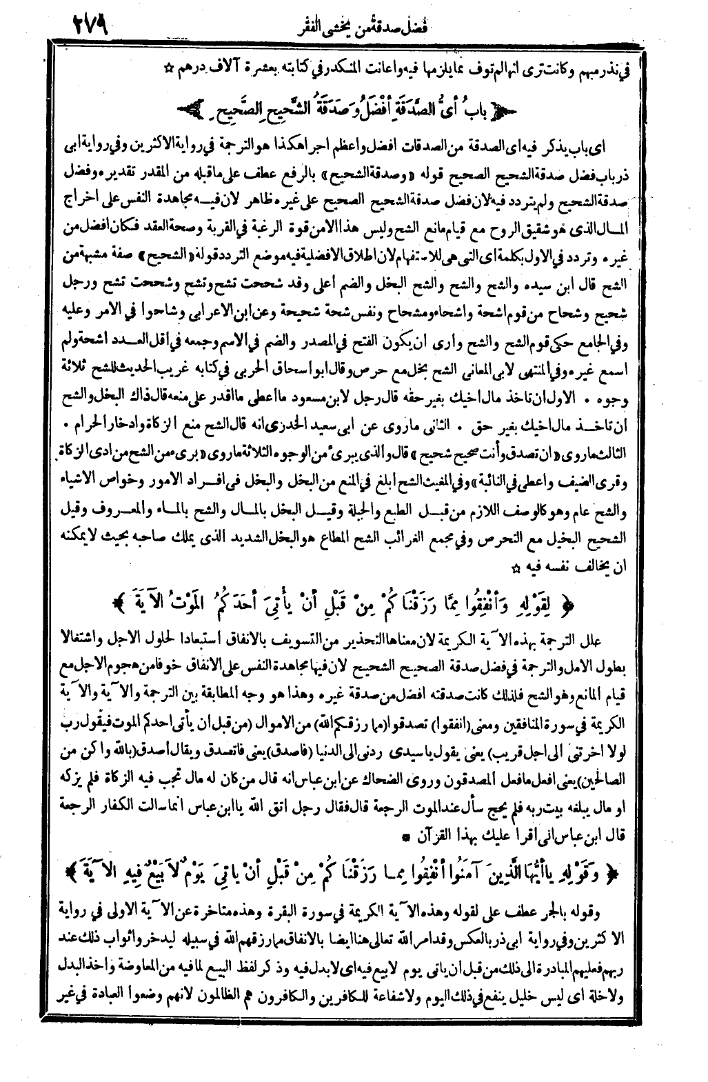علل التَّرْجَمَة بِهَذِهِ الْآيَة الْكَرِيمَة لِأَن مَعْنَاهَا التحذير من التسويف بِالْإِنْفَاقِ استبعادا لحلول الْأَجَل واشتغالاً بطول الأمل، والترجمة فِي فضل صَدَقَة الصَّحِيح الشحيح لِأَن فِيهَا مجاهدة النَّفس على الأنفاق خوفًا من هجوم الْأَجَل مَعَ قيام الْمَانِع، وَهُوَ الشُّح. فَلذَلِك كَانَت صدقته أفضل من صَدَقَة غَيره، وَهَذَا هُوَ وَجه الْمُطَابقَة بَين التَّرْجَمَة وَالْآيَة، وَالْآيَة الْكَرِيمَة فِي سُورَة الْمُنَافِقين، وَمعنى: {انفقوا} (المُنَافِقُونَ: 01) . تصدقوا مِمَّا رزقكم الله من الْأَمْوَال {من قبل أَن يَأْتِي أحدكُم الْمَوْت فَيَقُول رب لَوْلَا أخرتني إِلَى أجل قريب} (المُنَافِقُونَ: 01) . يَعْنِي: يَقُول: يَا سَيِّدي ردني إِلَى الدُّنْيَا: {فَأَصدق} يَعْنِي: فأتصدق وَيُقَال أصدق {بِاللَّه وأكن من الصَّالِحين} (المُنَافِقُونَ: 01) . يَعْنِي: أفعل مَا فعل المصدقون. وروى الضَّحَّاك عَن ابْن عَبَّاس أَنه قَالَ: من كَانَ لَهُ مَال تجب فِيهِ الزَّكَاة فَلم يزكه، أَو مَال يبلغهُ بَيت ربه فَلم يحجّ، سَأَلَ عِنْد الْمَوْت الرّجْعَة، قَالَ: فَقَالَ رجل: اتَّقِ الله يَا ابْن عَبَّاس، إِنَّمَا سَأَلت الْكفَّار الرّجْعَة. قَالَ ابْن عَبَّاس: إِنِّي أَقرَأ عَلَيْك بِهَذَا الْقُرْآن.