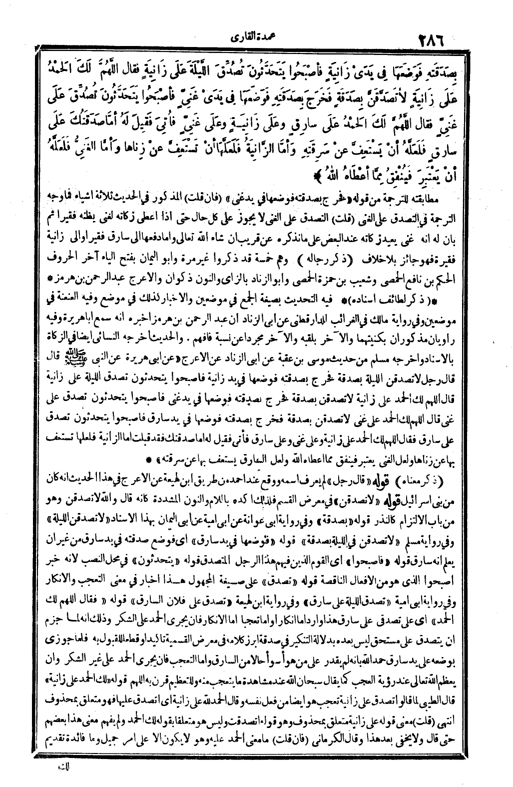 بِصَدَقَتِهِ فوضعها فِي يَدي زَانِيَة فَأَصْبحُوا يتحدثون تصدق اللَّيْلَة على زَانِيَة فَقَالَ اللَّهُمَّ لَك الْحَمد على زَانِيَة لأتصدقن بِصَدقَة فَخرج بِصَدَقَتِهِ فوضعها فِي يَدي غَنِي فَأَصْبحُوا يتحدثون تصدق على غَنِي فَقَالَ اللَّهُمَّ لَك الْحَمد على سَارِق وعَلى زَانِيَة وعَلى غَنِي فَأتي فَقيل لَهُ أما صدقتك على سَارِق فَلَعَلَّهُ أَن يستعف عَن سَرقته وَأما الزَّانِيَة فلعلها أَن تستعف عَن زنَاهَا وَأما الْغَنِيّ فَلَعَلَّهُ أَن يعْتَبر فينفق مِمَّا أعطَاهُ الله) مطابقته للتَّرْجَمَة من قَوْله " فَخرج بِصَدَقَتِهِ فوضعها فِي يَد غَنِي " (فَإِن قلت) الْمَذْكُور فِي الحَدِيث ثَلَاثَة أَشْيَاء فَمَا وَجه التَّرْجَمَة فِي التَّصَدُّق على الْغَنِيّ (قلت) التَّصَدُّق على الْغَنِيّ لَا يجوز على كل حَال حَتَّى إِذا أعْطى زَكَاته لَغَنِيّ يَظُنّهُ فَقِيرا ثمَّ بَان لَهُ أَنه غَنِي يُعِيد زَكَاته عِنْد الْبَعْض على مَا نذكرهُ عَن قريب إِن شَاءَ الله تَعَالَى وَأما دَفعهَا إِلَى سَارِق فَقِيرا وَإِلَى زَانِيَة فقيرة فَهُوَ جَائِز بِلَا خلاف. (ذكر رِجَاله) وهم خَمْسَة قد ذكرُوا غير مرّة وَأَبُو الْيَمَان بِفَتْح الْيَاء آخر الْحُرُوف الحكم بن نَافِع الْحِمصِي وَشُعَيْب بن حَمْزَة الْحِمصِي وَأَبُو الزِّنَاد بالزاي وَالنُّون ذكْوَان والأعرج عبد الرَّحْمَن بن هُرْمُز (ذكر لطائف إِسْنَاده) فِيهِ التحديث بِصِيغَة الْجمع فِي موضِعين والإخبار كَذَلِك فِي مَوضِع وَفِيه العنعنة فِي موضِعين وَفِي رِوَايَة مَالك فِي الغرائب للدارقطني عَن أبي الزِّنَاد أَن عبد الرَّحْمَن بن هُرْمُز أخبرهُ أَنه سمع أَبَا هُرَيْرَة وَفِيه راويان مذكوران بكنيتهما وَالْآخر بلقبه وَالْآخر مُجَردا عَن نِسْبَة فَافْهَم. والْحَدِيث أخرجه النَّسَائِيّ أَيْضا فِي الزَّكَاة بِالْإِسْنَادِ وَأخرجه مُسلم من حَدِيث مُوسَى بن عقبَة عَن أبي الزِّنَاد عَن الْأَعْرَج " عَن أبي هُرَيْرَة عَن النَّبِي - صَلَّى اللَّهُ عَلَيْهِ وَسَلَّم َ - قَالَ قَالَ رجل لأتصدقن اللَّيْلَة بِصَدقَة فَخرج بِصَدَقَتِهِ فوضعها فِي يَد زَانِيَة فَأَصْبحُوا يتحدثون تصدق اللَّيْلَة على زَانِيَة قَالَ اللَّهُمَّ لَك الْحَمد على زَانِيَة لأتصدقن بِصَدقَة فَخرج بِصَدَقَتِهِ فوضعها فِي يَد غَنِي فَأَصْبحُوا يتحدثون تصدق على غَنِي قَالَ اللَّهُمَّ لَك الْحَمد على غَنِي لأتصدقن بِصَدقَة فَخرج بِصَدَقَتِهِ فوضعها فِي يَد سَارِق فَأَصْبحُوا يتحدثون تصدق على سَارِق فَقَالَ اللَّهُمَّ لَك الْحَمد على زَانِيَة وعَلى غَنِي وعَلى سَارِق فَأتى فَقيل لَهُ أما صدقتك فقد قبلت أما الزَّانِيَة فلعلها تستعف بهَا عَن زنَاهَا وَلَعَلَّ الْغَنِيّ يعْتَبر فينفق مِمَّا أعطَاهُ الله وَلَعَلَّ السَّارِق يستعف بهَا عَن سَرقته " (ذكر مَعْنَاهُ) قَوْله " قَالَ رجل " لم يعرف اسْمه وَوَقع عِنْد أَحْمد من طَرِيق ابْن لَهِيعَة عَن الْأَعْرَج فِي هَذَا الحَدِيث أَنه كَانَ من بني إِسْرَائِيل قَوْله " لأتصدقن " فِي معرض الْقسم فَلذَلِك أكده بِاللَّامِ وَالنُّون الْمُشَدّدَة كَأَنَّهُ قَالَ وَالله لأتصدقن وَهُوَ من بَاب الِالْتِزَام كالنذر قَوْله " بِصَدقَة " وَفِي رِوَايَة أبي عوَانَة عَن أبي أُميَّة عَن أبي الْيَمَان بِهَذَا الْإِسْنَاد " لأتصدقن اللَّيْلَة " وَفِي رِوَايَة مُسلم " لأتصدقن فِي اللَّيْلَة بِصَدقَة " قَوْله " فوضعها فِي يَد سَارِق " أَي فَوضع صدقته فِي يَد سَارِق من غير أَن يعلم أَنه سَارِق قَوْله " فَأَصْبحُوا " أَي الْقَوْم الَّذين فيهم هَذَا الرجل الْمُتَصَدّق قَوْله " يتحدثون " فِي مَحل النصب لِأَنَّهُ خبر أَصْبحُوا الَّذِي هُوَ من الْأَفْعَال النَّاقِصَة قَوْله " تصدق " على صِيغَة الْمَجْهُول هَذَا إِخْبَار فِي معنى التَّعَجُّب وَالْإِنْكَار وَفِي رِوَايَة أبي أُميَّة " تصدق اللَّيْلَة على 