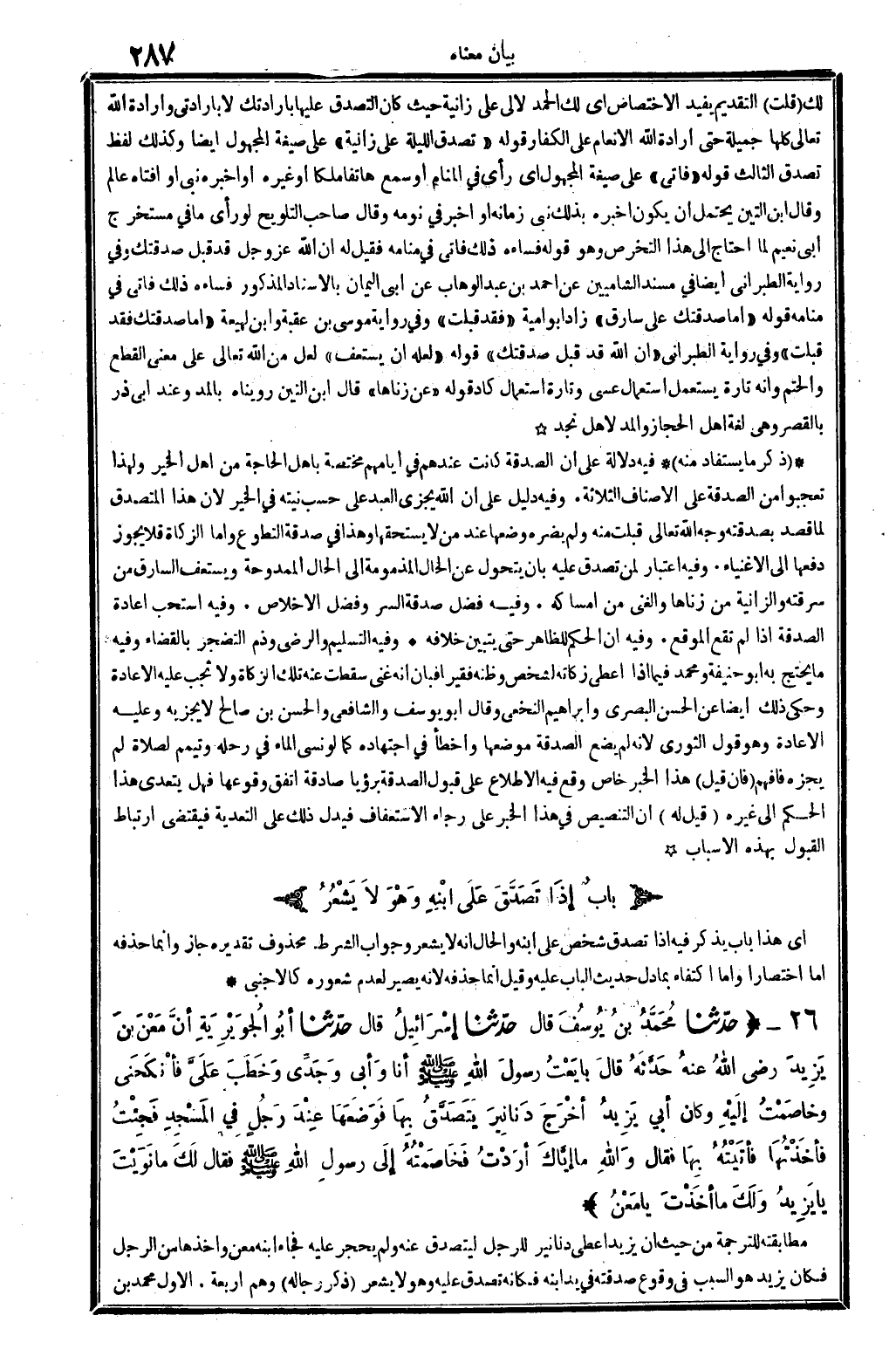 26 - (حَدثنَا مُحَمَّد بن يُوسُف قَالَ حَدثنَا إِسْرَائِيل قَالَ حَدثنَا أَبُو الجويرية أَن معن بن يزِيد رَضِي الله عَنهُ حَدثهُ قَالَ بَايَعت رَسُول الله - صَلَّى اللَّهُ عَلَيْهِ وَسَلَّم َ - أَنا وَأبي وجدي وخطب عَليّ فأنكحني وخاصمت إِلَيْهِ وَكَانَ أبي يزِيد أخرج دَنَانِير يتَصَدَّق بهَا فوضعها عِنْد رجل فِي الْمَسْجِد فَجئْت فأخذتها فَأَتَيْته بهَا فَقَالَ وَالله مَا إياك أردْت فَخَاصَمته إِلَى رَسُول الله - صَلَّى اللَّهُ عَلَيْهِ وَسَلَّم َ - فَقَالَ لَك مَا نَوَيْت يَا يزِيد وَلَك مَا أخذت يَا معن) مطابقته للتَّرْجَمَة من حَيْثُ أَن يزِيد أعْطى دَنَانِير للرجل ليتصدق عَنهُ وَلم يحْجر عَلَيْهِ فجَاء ابْنه معن وَأَخذهَا من الرجل فَكَانَ يزِيد هُوَ السَّبَب فِي وُقُوع صدقته فِي يَد ابْنه فَكَأَنَّهُ تصدق عَلَيْهِ وَهُوَ لَا يشْعر. (ذكر رِجَاله) وهم أَرْبَعَة. الأول مُحَمَّد بن