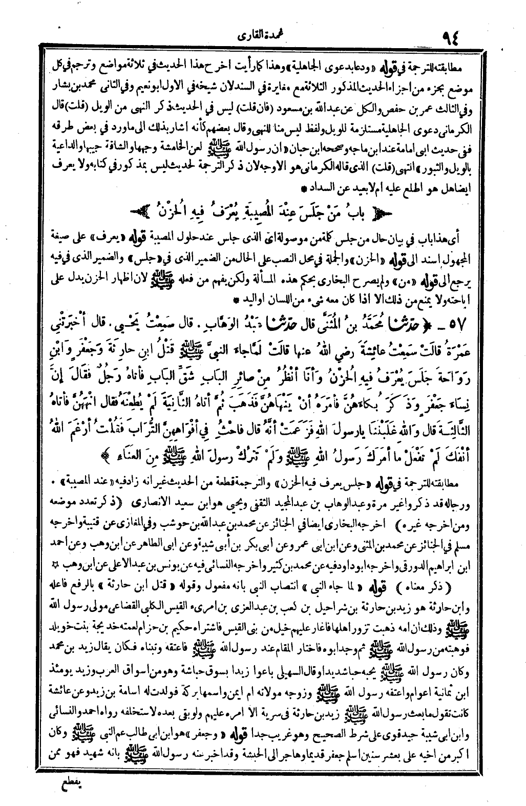 9921 - حدَّثنا مُحَمَّدُ بنُ المُثَنَّى قَالَ حدَّثنا عَبْدُ الوَهَّابِ، قَالَ سَمِعْتُ يَحْيَى. قَالَ أخبرَتْنِي عَمْرَةُ قالَتْ سَمِعْتُ عائِشَةَ رَضِي الله تَعَالَى عَنْهَا قالَتْ لَمَّا جاءَ النبيُّ صلى الله عَلَيْهِ وَسلم قَتْلُ ابنِ حَارِثَةَ وَجَعْفَرٍ وَابْنِ رَوَاحَةَ جَلَسَ يُعْرَفُ فِيهِ الحُزْنُ وَأنَا أنْظُرُ مِنْ صائِرِ البَابِ شَقِّ البَابِ فأتَاهُ رَجُلٌ فقالَ إنَّ نِسَاءَ جَعْفَرٍ وذَكَرَ بُكَاءَهُنَّ فأمَرَهُ أنْ يَنْهَاهُنَّ فَذَهَبَ ثُمَّ أتَاهُ الثَّانِيَةَ لَمْ يُطِعْنَهُ فَقَالَ انْهَهُنَّ فأتَاهُ الثَّالِثَةَ قَالَ وَالله غَلَبْنَنَا يَا رسولَ الله فَزَعمَتْ أنَّهُ قَالَ فاحْثُ فِي أفْوَاهِهِنَّ التُّرَابَ فَقُلْتُ أرْغَمَ الله أنْفَكَ لَمْ تَفْعَلْ مَا أمَرَكَ رسولُ الله صلى الله عَلَيْهِ وَسلم ولَمْ تَترُكْ رسولَ الله صلى الله عَلَيْهِ وَسلم مِنَ العَنَاءِ.
