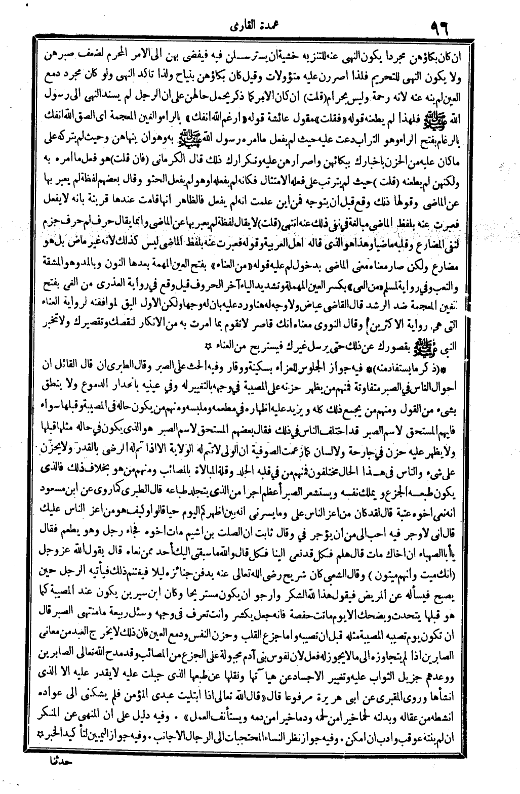 ذكر مَا يُسْتَفَاد مِنْهُ: فِيهِ: جَوَاز الْجُلُوس للعزاء بسكينة ووقار. وَفِيه: الْحَث على الصَّبْر، وَقَالَ الطَّبَرِيّ: إِن قَالَ الْقَائِل: إِن أَحْوَال النَّاس فِي الصَّبْر مُتَفَاوِتَة فَمنهمْ من يظْهر حزنه على الْمُصِيبَة فِي وَجهه بالتغيير لَهُ، وَفِي عَيْنَيْهِ بانحدار الدُّمُوع وَلَا ينْطق بِشَيْء من القَوْل، وَمِنْهُم من يجمع ذَلِك كُله، وَيزِيد عَلَيْهِ إِظْهَاره فِي مطعمه وملبسه، وَمِنْهُم من يكون حَاله فِي الْمُصِيبَة وَقبلهَا سَوَاء فَأَيهمْ الْمُسْتَحق لاسم الصَّبْر، قد اخْتلف النَّاس فِي ذَلِك فَقَالَ بَعضهم: الْمُسْتَحق لاسم الصَّبْر هُوَ الَّذِي يكون فِي حَاله مثلهَا قبلهَا، وَلَا يظْهر عَلَيْهِ حزن فِي جارحة وَلَا لِسَان، كَمَا زعمت الصُّوفِيَّة، أَن الْوَلِيّ لَا تتمّ لَهُ الْولَايَة إلاَّ إِذا تمّ لَهُ الرضى بِالْقدرِ، وَلَا يحزن على شَيْء، وَالنَّاس فِي هَذَا الْحَال مُخْتَلفُونَ، فَمنهمْ من فِي قلبه الْجلد وَقلة المبالاة بالمصائب، وَمِنْهُم من هُوَ بِخِلَاف ذَلِك، فَالَّذِي يكون طبعه الْجزع وَيملك نَفسه ويستشعر الصَّبْر أعظم أجرا من الَّذِي يتجلد طباعه. قَالَ الطَّبَرِيّ: كَمَا رُوِيَ عَن ابْن مَسْعُود أَنه نعى أَخُوهُ عتبَة. قَالَ: لقد كَانَ من أعز النَّاس عَليّ وَمَا يسرني أَنه بَين أظْهركُم الْيَوْم حَيا. قَالُوا: وَكَيف هُوَ من أعز النَّاس عَلَيْك؟ قَالَ: إِنِّي لأوجر فِيهِ أحب إِلَيّ من أَن يُؤجر فِي. وَقَالَ ثَابت: إِن الصَّلْت بن أَشْيَم مَاتَ أَخُوهُ، فجَاء رجل وَهُوَ يطعم، فَقَالَ: يَا أَبَا الصَّهْبَاء إِن أَخَاك مَاتَ} قَالَ: هَلُمَّ فَكل قد نعي إِلَيْنَا، فَكل. قَالَ: وَالله مَا سبقني إِلَيْك أحد مِمَّن نعاه، قَالَ: يَقُول الله عز وَجل: {إِنَّك ميت وَإِنَّهُم ميتون} (الزمر: 03) . وَقَالَ الشّعبِيّ: كَانَ شُرَيْح، رَضِي الله تَعَالَى عَنهُ، يدْفن جنائزه لَيْلًا، فيغتنم ذَلِك فيأتيه الرجل حِين يصبح فيسأله عَن الْمَرِيض، فَيَقُول: هَذَا لله الشُّكْر وَأَرْجُو أَن يكون مستريحا. وَكَانَ ابْن سِيرِين يكون عِنْد الْمُصِيبَة كَمَا هُوَ قبلهَا يتحدث ويضحك إلاَّ يَوْم مَاتَت حَفْصَة فَإِنَّهُ جعل يكشر، وإنت تعرف فِي وَجهه، وَسُئِلَ ربيعَة: مَا مُنْتَهى الصَّبْر؟ قَالَ: أَن تكون يَوْم تصيبه الْمُصِيبَة مثله قبل أَن تصيبه وَأما جزع الْقلب وحزن النَّفس ودمع الْعين فَإِن ذَلِك لَا يخرج العَبْد من مَعَاني الصابرين إِذا لم يتجاوزه إِلَى مَا لَا يجوز لَهُ فعل، لِأَن نفوس بني آدم مجبولة على الْجزع من المصائب، وَقد مدح الله تَعَالَى الصابرين وَوَعدهمْ جزيل الثَّوَاب عَلَيْهِ، وتغيير الأجساد عَن هيآتها ونقلها عَن طبعها الَّذِي جبلت عَلَيْهِ، لَا يقدر عَلَيْهِ إِلَّا الَّذِي أَنْشَأَهَا. وروى المَقْبُري عَن أبي هُرَيْرَة مَرْفُوعا، قَالَ: (قَالَ الله تَعَالَى: إِذا ابْتليت عَبدِي الْمُؤمن فَلم يشكني إِلَى عواده أنشطه من عقاله وبدلته لَحْمًا خيرا من لَحْمه ودما خيرا من دَمه، ويستأنف الْعَمَل) . وَفِيه: دَلِيل على أَن الْمنْهِي عَن الْمُنكر إِن لم ينْتَه عُوقِبَ وأدب إِن أمكن. وَفِيه: جَوَاز نظر النِّسَاء المحتجبات إِلَى الرِّجَال الْأَجَانِب. وَفِيه: جَوَاز التميين لتأكيد الْخَبَر.