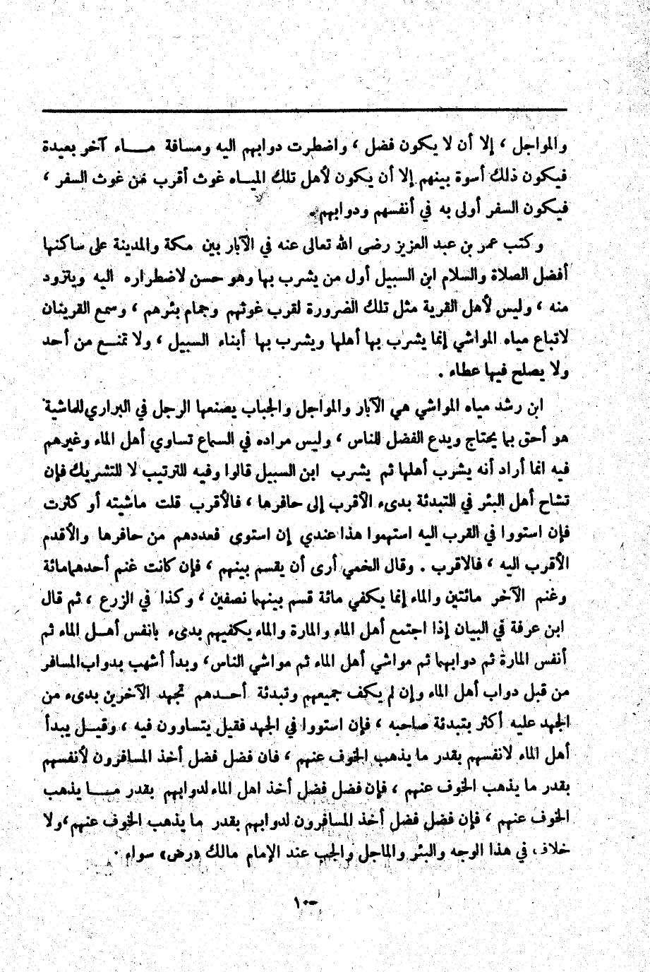 ابْنُ رُشْدٍ مِيَاهُ الْمَوَاشِي هِيَ الْآبَارُ وَالْمَوَاجِلُ وَالْجِبَابُ يَصْنَعُهَا الرَّجُلُ فِي الْبَرَارِي لِلْمَاشِيَةِ هُوَ أَحَقُّ بِمَا يَحْتَاجُ وَيَدَعُ الْفَضْلَ لِلنَّاسِ، وَلَيْسَ مُرَادُهُ فِي السَّمَاعِ تَسَاوِي أَهْلِ الْمَاءِ وَغَيْرِهِمْ فِيهِ إنَّمَا أَرَادَ أَنَّهُ يَشْرَبُ أَهْلُهَا ثُمَّ يَشْرَبُ ابْنُ السَّبِيلِ قَالُوا وَفِيهِ لِلتَّرْتِيبِ لَا لِلتَّشْرِيكِ فَإِنْ تَشَاحَّ أَهْلُ الْبِئْرِ فِي التَّبْدِئَةِ بُدِئَ الْأَقْرَبُ إلَى حَافِرِهَا، فَالْأَقْرَبُ قُلْت مَاشِيَتُهُ أَوْ كَثُرَتْ فَإِنْ اسْتَوَوْا فِي الْقُرْبِ إلَيْهِ اسْتَهَمُوا هَذَا عِنْدِي إنْ اسْتَوَى فَعَدَدُهُمْ مِنْ حَافِرِهَا وَالْأَقْدَمُ الْأَقْرَبُ إلَيْهِ، فَالْأَقْرَبُ. وَقَالَ اللَّخْمِيُّ أَرَى أَنْ يُقَسَّمَ بَيْنَهُمْ، فَإِنْ كَانَتْ غَنَمُ أَحَدِهِمَا مِائَةً وَغَنَمُ الْآخَرِ مِائَتَيْنِ وَالْمَاءُ إنَّمَا يَكْفِي مِائَةً قُسِّمَ بَيْنَهُمَا نِصْفَيْنِ، وَكَذَا فِي الزَّرْعِ، ثُمَّ قَالَ ابْنُ عَرَفَةَ فِي الْبَيَانِ إذَا اجْتَمَعَ أَهْلُ الْمَاءِ وَالْمَارَّةُ وَالْمَاءُ يَكْفِيهِمْ بُدِئَ بِأَنْفُسِ أَهْلِ الْمَاءِ ثُمَّ أَنْفُسِ الْمَارَّةِ ثُمَّ دَوَابِّهِمَا ثُمَّ مَوَاشِي أَهْلِ الْمَاءِ ثُمَّ مَوَاشِي النَّاسِ، وَبَدَأَ أَشْهَبُ بِدَوَابّ الْمُسَافِرِ مِنْ قَبْلِ دَوَابِّ أَهْلِ الْمَاءِ وَإِنْ لَمْ يَكْفِ جَمِيعَهُمْ وَتَبْدِئَةُ أَحَدِهِمْ تُجْهِدُ الْآخَرِينَ بُدِئَ مَنْ الْجَهْدِ عَلَيْهِ أَكْثَرُ بِتَبْدِئَةِ صَاحِبِهِ، فَإِنْ اسْتَوَوْا فِي الْجَهْدِ فَقِيلَ يَتَسَاوَوْنَ فِيهِ، وَقِيلَ يَبْدَأُ أَهْلُ الْمَاءِ لِأَنْفُسِهِمْ بِقَدْرِ مَا يُذْهِبُ الْخَوْفَ عَنْهُمْ، فَإِنْ فَضَلَ فَضْلٌ أَخَذَ الْمُسَافِرُونَ لِأَنْفُسِهِمْ بِقَدْرِ مَا يُذْهِبُ الْخَوْفَ عَنْهُمْ، فَإِنْ فَضَلَ فَضْلٌ أَخَذَ أَهْلُ الْمَاءِ لِدَوَابِّهِمْ بِقَدْرِ مَا يُذْهِبُ الْخَوْفَ عَنْهُمْ، فَإِنْ فَضَلَ فَضْلٌ أَخَذَ الْمُسَافِرُونَ لِدَوَابِّهِمْ بِقَدْرِ مَا يُذْهِبُ الْخَوْفَ عَنْهُمْ، وَلَا خِلَافَ فِي هَذَا الْوَجْهِ وَالْبِئْرُ وَالْمَاجِلُ وَالْجُبُّ عِنْدَ الْإِمَامِ مَالِكٍ " - رَضِيَ اللَّهُ عَنْهُ - " سَوَاءٌ.