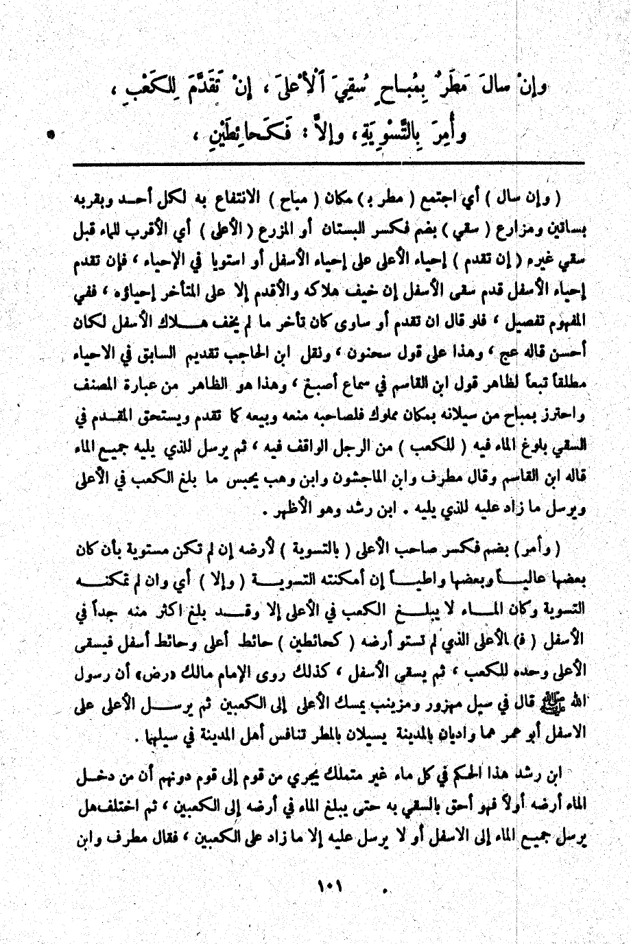 ابْنُ رُشْدٍ هَذَا الْحُكْمُ فِي كُلِّ مَاءٍ غَيْرِ مُتَمَلَّكٍ يَجْرِي مِنْ قَوْمٍ إلَى قَوْمٍ دُونَهُمْ أَنَّ مَنْ دَخَلَ الْمَاءُ أَرْضَهُ أَوَّلًا فَهُوَ أَحَقُّ بِالسَّقْيِ بِهِ حَتَّى يَبْلُغَ الْمَاءُ فِي أَرْضِهِ إلَى الْكَعْبَيْنِ، ثُمَّ اُخْتُلِفَ هَلْ يُرْسَلُ جَمِيعُ الْمَاءِ إلَى الْأَسْفَلِ أَوْ لَا يُرْسَلُ عَلَيْهِ إلَّا مَا زَادَ عَلَى الْكَعْبَيْنِ، فَقَالَ مُطَرِّفٌ وَابْنُ الْمَاجِشُونِ