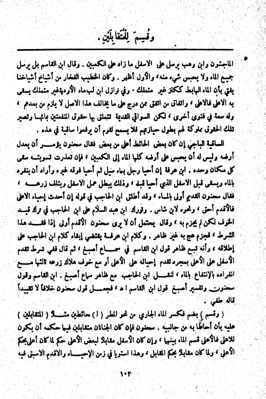 ـــــــــــــــــــــــــــــQوَابْنُ وَهْبٍ يُرْسَلُ عَلَى الْأَسْفَلِ مَا زَادَ عَلَى الْكَعْبَيْنِ. وَقَالَ ابْنُ الْقَاسِمِ بَلْ يُرْسَلُ جَمِيعُ الْمَاءِ وَلَا يُحْبَسُ شَيْءٌ مِنْهُ، وَالْأَوَّلُ أَظْهَرُ. وَكَانَ الْخَطِيبُ الْحَفَّارُ مِنْ أَشْيَاخِ أَشْيَاخِنَا يُفْتِي بِأَنَّ الْمَاءَ الْهَابِطَ كَكَنْزٍ غَيْرِ مُتَمَلَّكٍ. وَفِي نَوَازِلِ ابْنِ لُبٍّ مَاءُ الْأَوْدِيَةِ غَيْرُ مُتَمَلَّكٍ يُسْقَى بِهِ الْأَعْلَى فَالْأَعْلَى، وَاتِّفَاقُ مَنْ اتَّفَقَ مِمَّنْ دَرَجَ عَلَى مَا يُخَالِفُ هَذَا الْأَصْلَ لَا يَلْزَمُ مَنْ بَعْدَهُمْ، وَلَهُ سَعَةٌ فِي فَتْوَى أُخْرَى، لَكِنْ السَّوَاقِي الْقَدِيمَةُ تَتَعَلَّقُ بِهَا حُقُوقُ الْمُنْتَفِعِينَ بِمَائِهَا وَتَصِيرُ تِلْكَ الْحُقُوقُ مَمْلُوكَةً لَهُمْ بِطُولِ حِيَازَتِهِمْ فَلَا يُسْمَحُ لِقَوْمٍ أَنْ يَرْفَعُوا سَاقِيَةً فِي هَذِهِ.