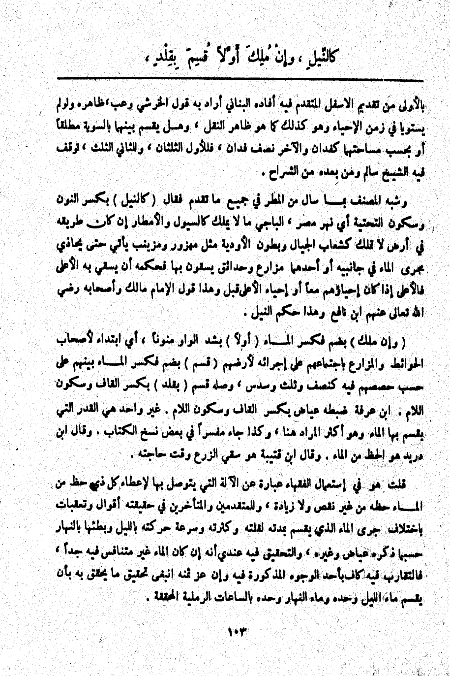 (وَإِنْ مُلِكَ) بِضَمٍّ فَكَسْرٍ الْمَاءُ (أَوَّلًا) بِشَدِّ الْوَاوِ مُنَوَّنًا، أَيْ ابْتِدَاءً لِأَصْحَابِ الْحَوَائِطِ وَالْمَزَارِعِ بِاجْتِمَاعِهِمْ عَلَى إجْرَائِهِ لِأَرْضِهِمْ (قُسِمَ) بِضَمٍّ فَكَسْرٍ الْمَاءُ بَيْنَهُمْ عَلَى حَسَبِ حِصَصِهِمْ فِيهِ كَنِصْفٍ وَثُلُثٍ وَسُدُسٍ، وَصِلَةُ قُسِمَ (بِقِلْدٍ) بِكَسْرِ الْقَافِ وَسُكُونِ اللَّامِ. ابْنُ عَرَفَةَ ضَبَطَهُ عِيَاضٌ بِكَسْرِ الْقَافِ وَسُكُونِ اللَّامِ. غَيْرَ وَاحِدٍ هِيَ الْقَدْرُ الَّتِي يُقْسَمُ بِهَا الْمَاءُ، وَهُوَ أَكْثَرُ الْمُرَادِ هُنَا، وَكَذَا جَاءَ مُفَسَّرًا فِي، بَعْضِ نُسَخِ الْكِتَابِ. وَقَالَ ابْنُ دُرَيْدٍ هُوَ الْحَظُّ مِنْ الْمَاءِ. وَقَالَ ابْنُ قُتَيْبَةَ، وَهُوَ سَقْيُ الزَّرْعِ وَقْتَ حَاجَتِهِ.