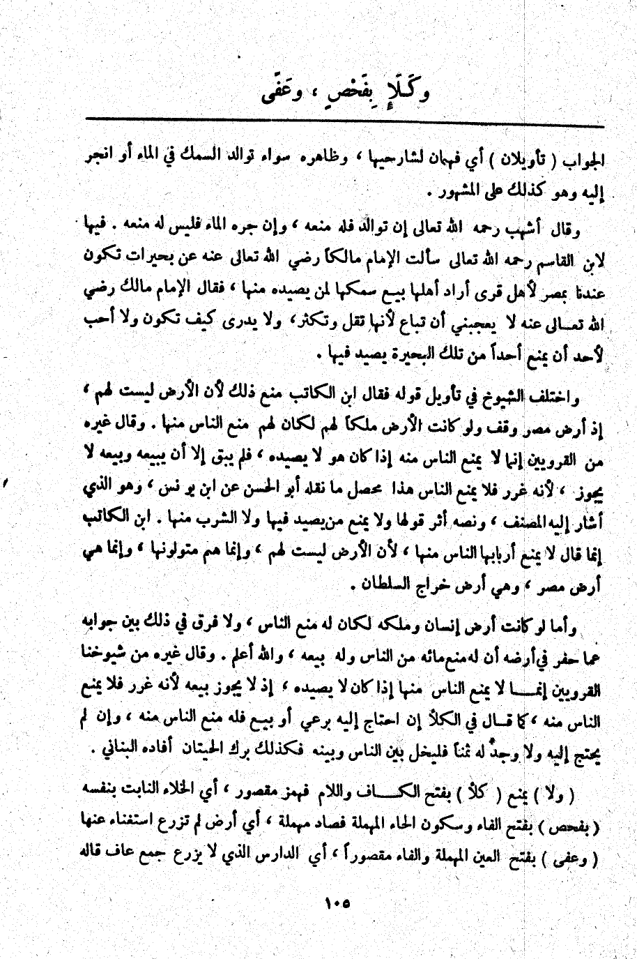 (وَلَا) يُمْنَعُ (كَلَأٌ) بِفَتْحِ الْكَافِ وَاللَّامِ فَهَمْزٌ مَقْصُورٌ، أَيْ الْخَلَاءُ النَّابِتُ بِنَفْسِهِ (بِفَحْصٍ) بِفَتْحِ الْفَاءِ وَسُكُونِ الْحَاءِ الْمُهْمَلَةِ فَصَادٍ مُهْمَلَةٍ، أَيْ أَرْضٍ لَمْ تُزْرَعْ اسْتِغْنَاءً عَنْهَا (وَعَفَا) بِفَتْحِ الْعَيْنِ الْمُهْمَلَةِ وَالْفَاءِ مَقْصُورًا، أَيْ الدَّارِسِ الَّذِي لَا يَزْرَعُ جَمْعُ عَافٍ قَالَهُ
