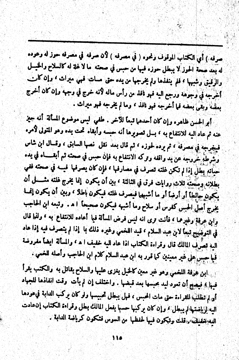 ابْنُ عَرَفَةَ اللَّخْمِيُّ، وَهُوَ غَيْرُ مُعَيَّنٍ كَالْخَيْلِ يُغْزَى عَلَيْهَا وَالسِّلَاحِ يُقَاتَلُ بِهِ وَالْكُتُبِ يُقْرَأُ فِيهَا، فَيَصِحُّ أَنْ تَعُودَ لِيَدِ مُحَبِّسِهَا بَعْدَ قَبْضِهَا. وَاخْتُلِفَ إنْ لَمْ يَأْتِ وَقْتُ إنْفَاذِهَا لِلْجِهَادِ أَوْ لَمْ تُطْلَبْ لِلْقِرَاءَةِ حَتَّى مَاتَ الْمُحَبِّسُ، فَهَلْ يَبْطُلُ تَحْبِيسُهَا، وَلَوْ كَانَ يَرْكَبُ الدَّابَّةَ فِي عَوْدِهَا إلَيْهِ لِرِيَاضَتِهَا لَمْ يَبْطُلْ، وَإِنْ كَانَ يَرْكَبُهَا حَسْبَمَا يَفْعَلُ الْمَالِكُ بَطَلَ وَقِرَاءَةُ الْكِتَابِ إنْ عَادَتْ إلَيْهِ خَفِيفٌ. قُلْت وَتَكُونُ فِيهَا لِحِفْظِهَا مِنْ السَّوْسِ فَتَكُونُ كَرِيَاضَةِ الدَّابَّةِ.