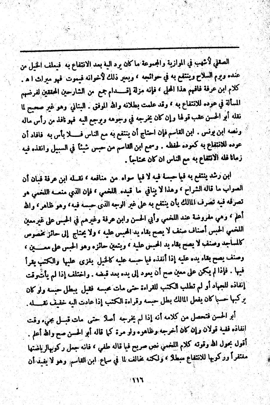 ابْنُ رُشْدٍ يَنْتَفِعُ بِهِ فِيمَا حَبَّسَهُ فِيهِ لَا فِيمَا سِوَاهُ مِنْ مَنَافِعِهِ، نَقَلَهُ ابْنُ عَرَفَةَ فَبَانَ أَنَّ الصَّوَابَ مَا قَالَهُ الشُّرَّاحُ، وَهَذَا لَا يُنَافِي مَا قَيَّدَهُ اللَّخْمِيُّ، فَإِنَّ الَّذِي مَنَعَهُ اللَّخْمِيُّ هُوَ تَصَرُّفُهُ فِيهِ تَصَرُّفَ الْمَالِكِ بِأَنْ يَنْتَفِعَ بِهِ عَلَى غَيْرِ الْوَجْهِ الَّذِي حَبَّسَهُ فِيهِ، وَهُوَ ظَاهِرٌ، وَاَللَّهُ أَعْلَمُ، وَهِيَ مَفْرُوضَةٌ عِنْدَ اللَّخْمِيِّ وَأَبِي الْحَسَنِ وَابْنِ عَرَفَةَ وَغَيْرِهِمْ فِي الْحَبْسِ عَلَى غَيْرِ مُعَيَّنٍ اللَّخْمِيُّ الْحَبْسُ أَصْنَافٌ: صِنْفٌ لَا يَصِحُّ بَقَاءُ يَدِ الْمُحَبِّسِ عَلَيْهِ، وَلَا يَحْتَاجُ إلَى حَائِزٍ مَخْصُوصٍ كَالْمَسَاجِدِ وَصِنْفٌ لَا يَصِحُّ بَقَاءُ يَدِ الْمُحَبِّسِ عَلَيْهِ، وَيَتَعَيَّنُ حَائِزُهُ، وَهُوَ الْحَبْسُ عَلَى مُعَيَّنٍ، وَصِنْفٌ يَصِحُّ بَقَاءُ يَدِهِ عَلَيْهِ إذَا أَنْفَذَهُ فِيمَا حَبَّسَهُ عَلَيْهِ كَالْخَيْلِ يُغْزَى عَلَيْهَا وَالْكُتُبِ يُقْرَأُ فِيهَا. فَإِذَا لَمْ يَكُنْ عَلَى مُعَيَّنٍ صَحَّ أَنْ يَعُودَ إلَى يَدِهِ بَعْدَ قَبْضِهِ. وَاخْتُلِفَ إذَا لَمْ يَأْتِ وَقْتُ إنْفَاذِهِ لِلْجِهَادِ أَوْ لَمْ تُطْلَبْ الْكُتُبُ لِلْقِرَاءَةِ حَتَّى مَاتَ مُحَبِّسُهُ فَقِيلَ يَبْطُلُ حَبْسُهُ، وَلَوْ كَانَ يَرْكَبُهَا حَسْبَمَا كَانَ يَفْعَلُ الْمَالِكُ بَطَلَ حَبْسُهُ وَقِرَاءَةُ الْكُتُبِ إذَا عَادَتْ إلَيْهِ خَفِيفٌ نَقَلَهُ.