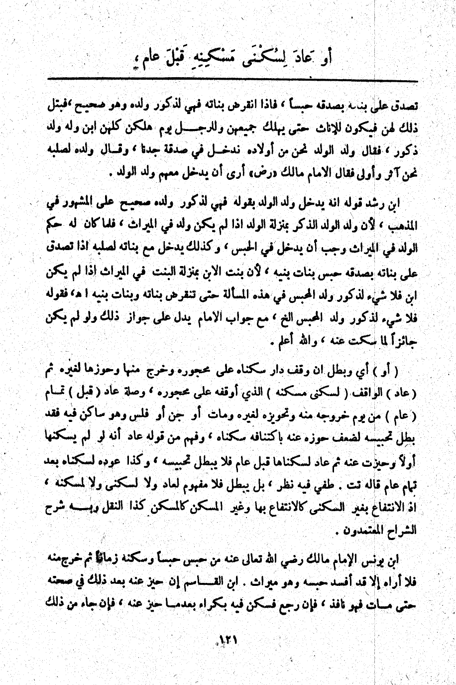 ابْنُ رُشْدٍ قَوْلُهُ أَنَّهُ يَدْخُلُ وَلَدُ الْوَلَدِ بِقَوْلِهِ فَهِيَ لِذُكُورِ وَلَدِهِ صَحِيحٌ عَلَى الْمَشْهُورِ فِي الْمَذْهَبِ؛ لِأَنَّ وَلَدَ الْوَلَدِ الذَّكَرَ بِمَنْزِلَةِ الْوَلَدِ إذَا لَمْ يَكُنْ وَلَدٌ فِي الْمِيرَاثِ، فَلَمَّا كَانَ لَهُ حُكْمُ الْوَلَدِ فِي الْمِيرَاثِ وَجَبَ أَنْ يَدْخُلَ فِي الْحَبْسِ، وَكَذَلِكَ يَدْخُلُ مَعَ بَنَاتِهِ لِصُلْبِهِ إذَا تَصَدَّقَ عَلَى بَنَاتِهِ بِصَدَقَةٍ حَبَّسَ بَنَاتِ بَنِيهِ؛ لِأَنَّ بِنْتَ الِابْنِ بِمَنْزِلَةِ الْبِنْتِ فِي الْمِيرَاثِ إذَا لَمْ يَكُنْ ابْنٌ فَلَا شَيْءَ لِذُكُورِ وَلَدِ الْمُحَبِّسِ فِي هَذِهِ الْمَسْأَلَةِ حَتَّى تَنْقَرِضَ بَنَاتُهُ وَبَنَاتُ بَنِيهِ. اهـ. فَقَوْلُهُ فَلَا شَيْءَ لِذُكُورِ وَلَدِ الْمُحَبِّسِ إلَخْ، مَعَ جَوَابِ الْإِمَامِ يَدُلُّ عَلَى جَوَازِ ذَلِكَ، وَلَوْ لَمْ يَكُنْ جَائِزًا لَمَا سَكَتَ عَنْهُ، وَاَللَّهُ أَعْلَمُ.