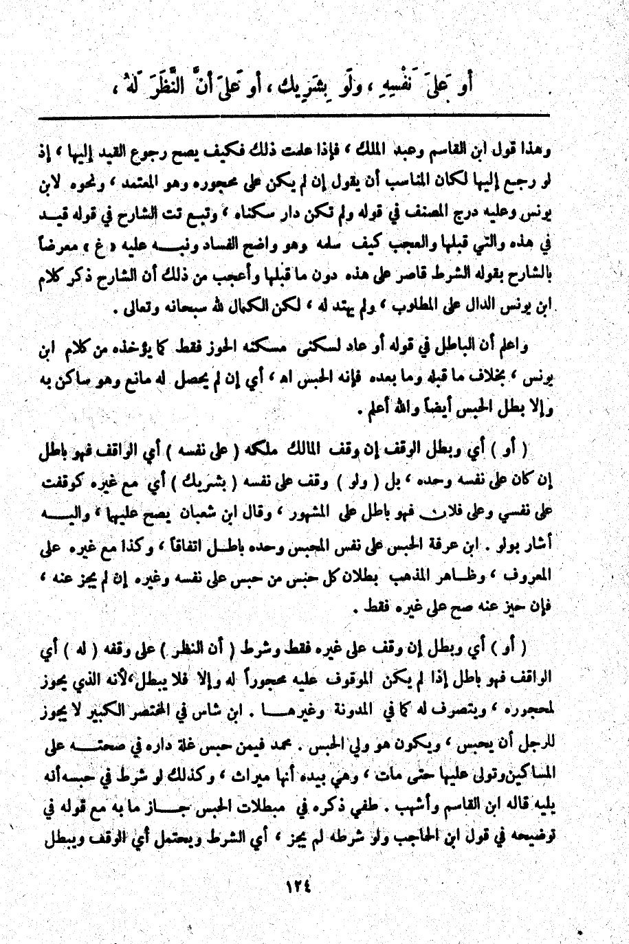(أَوْ) أَيْ وَبَطَلَ الْوَقْفُ إنْ وَقَفَ الْمَالِكُ مِلْكَهُ (عَلَى نَفْسِهِ) أَيْ الْوَاقِفِ فَهُوَ بَاطِلٌ إنْ كَانَ عَلَى نَفْسِهِ وَحْدَهُ، بَلْ (وَلَوْ) وَقَفَ عَلَى نَفْسِهِ (بِشَرِيكٍ) أَيْ مَعَ غَيْرِهِ كَوَقَفْتُ عَلَى نَفْسِي وَعَلَى فُلَانٍ فَهُوَ بَاطِلٌ عَلَى الْمَشْهُورِ، وَقَالَ ابْنُ شَعْبَانَ يَصِحُّ عَلَيْهِمَا، وَإِلَيْهِ أَشَارَ بِ وَلَوْ. ابْنُ عَرَفَةَ الْحَبْسُ عَلَى نَفْسِ الْمُحَبِّسِ وَحْدَهُ بَاطِلٌ اتِّفَاقًا، وَكَذَا مَعَ غَيْرِهِ عَلَى الْمَعْرُوفِ وَظَاهِرُ الْمَذْهَبِ بُطْلَانُ كُلِّ حَبْسِ مَنْ حَبَّسَ عَلَى نَفْسِهِ وَغَيْرِهِ إنْ لَمْ يُحَزْ عَنْهُ، فَإِنْ حِيزَ عَنْهُ صَحَّ عَلَى غَيْرِهِ فَقَطْ.