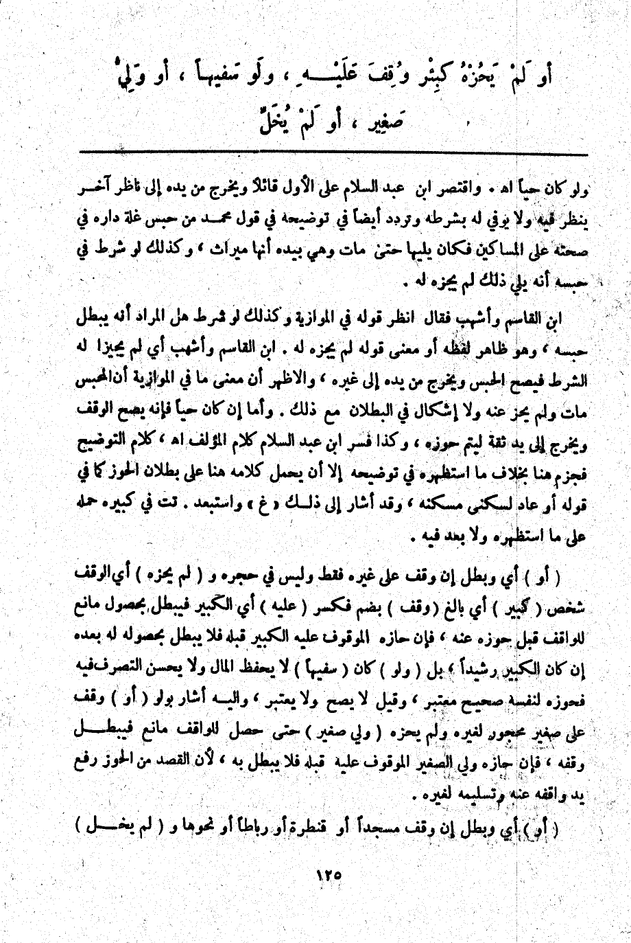(أَوْ) أَيْ وَبَطَلَ إنْ وَقَفَ عَلَى غَيْرِهِ فَقَطْ وَلَيْسَ فِي حِجْرِهِ وَ (لَمْ يَحُزْهُ) أَيْ الْوَقْفُ شَخْصٌ (كَبِيرٌ) أَيْ بَالِغٌ (وُقِفَ) بِضَمٍّ فَكَسْرٍ (عَلَيْهِ) أَيْ الْكَبِيرِ فَيَبْطُلُ بِحُصُولِ مَانِعٍ لِلْوَاقِفِ قَبْلَ حَوْزِهِ عَنْهُ، فَإِنْ حَازَهُ الْمَوْقُوفُ عَلَيْهِ الْكَبِيرُ قَبْلَهُ فَلَا يَبْطُلُ بِحُصُولِهِ لَهُ بَعْدَهُ إنْ كَانَ الْكَبِيرُ رَشِيدًا، بَلْ (وَلَوْ) كَانَ (سَفِيهًا) لَا يَحْفَظُ الْمَالَ وَلَا يُحْسِنُ التَّصَرُّفَ فِيهِ فَحَوْزُهُ لِنَفْسِهِ صَحِيحٌ مُعْتَبَرٌ، وَقِيلَ لَا يَصِحُّ وَلَا يُعْتَبَرُ، وَإِلَيْهِ أَشَارَ بِ وَلَوْ (أَوْ) وُقِفَ عَلَى صَغِيرٍ مَحْجُورٍ لِغَيْرِهِ وَلَمْ يَحُزْهُ (وَلِيُّ صَغِيرٌ) حَتَّى حَصَلَ لِلْوَاقِفِ مَانِعٌ فَيَبْطُلُ وَقْفُهُ، فَإِنْ حَازَهُ وَلِيُّ الصَّغِيرِ الْمَوْقُوفِ عَلَيْهِ قَبْلَهُ فَلَا يَبْطُلُ بِهِ؛ لِأَنَّ الْقَصْدَ مِنْ الْحَوْزِ رَفْعُ يَدِ وَاقِفِهِ عَنْهُ وَتَسْلِيمُهُ لِغَيْرِهِ.