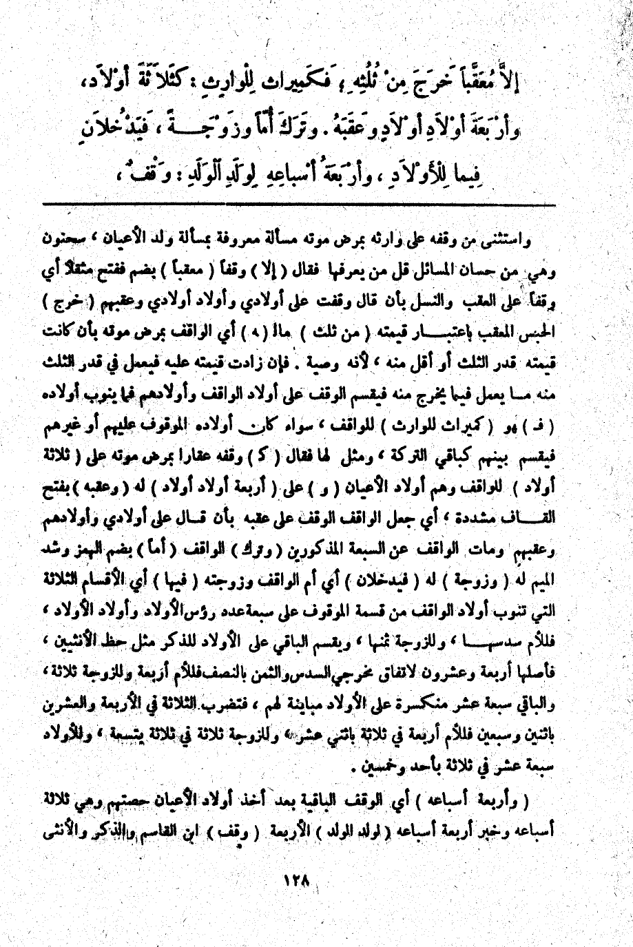 ـــــــــــــــــــــــــــــQوَاسْتَثْنَى مَنْ وَقَفَهُ عَلَى وَارِثِهِ بِمَرَضِ مَوْتِهِ مَسْأَلَةً مَعْرُوفَةً بِمَسْأَلَةِ وَلَدِ الْأَعْيَانِ سَحْنُونٌ وَهِيَ مِنْ حِسَانِ الْمَسَائِلِ قَلَّ مَنْ يَعْرِفُهَا فَقَالَ (إلَّا) وَقْفًا (مُعَقَّبًا) بِضَمٍّ فَفَتْحٍ مُثَقَّلًا أَيْ وَقْفًا عَلَى الْعَقِبِ وَالنَّسْلِ بِأَنْ قَالَ وَقَفْت عَلَى أَوْلَادِي وَأَوْلَادِ أَوْلَادِي وَعَقِبِهِمْ (خَرَجَ) الْحَبْسُ الْمُعَقَّبُ بِاعْتِبَارِ قِيمَتِهِ (مِنْ ثُلُثِ) مَالِ (هـ) أَيْ الْوَاقِفِ بِمَرَضِ مَوْتِهِ بِأَنْ كَانَتْ قِيمَتُهُ قَدْرَ الثُّلُثِ أَوْ أَقَلَّ مِنْهُ؛ لِأَنَّهُ وَصِيَّةٌ. فَإِنْ زَادَتْ قِيمَتُهُ عَلَيْهِ فَيُعْمَلُ فِي قَدْرِ الثُّلُثِ مِنْهُ مَا يُعْمَلُ فِيمَا يَخْرُجُ مِنْهُ فَيُقْسَمُ الْوَقْفُ عَلَى أَوْلَادِ الْوَاقِفِ وَأَوْلَادِهِمْ فَمَا يَنُوبُ أَوْلَادُهُ (فَ) هُوَ (كَمِيرَاثٍ لِلْوَارِثِ) لِلْوَاقِفِ، سَوَاءٌ كَانَ أَوْلَادُهُ الْمَوْقُوفَ عَلَيْهِمْ أَوْ غَيْرُهُمْ فَيُقْسَمُ بَيْنَهُمْ كَبَاقِي التَّرِكَةِ، وَمَثَّلَ لَهَا فَقَالَ (كَ) وَقْفِهِ عَقَارًا بِمَرَضِ مَوْتِهِ عَلَى (ثَلَاثَةِ أَوْلَادٍ) لِلْوَاقِفِ وَهُمْ أَوْلَادُ الْأَعْيَانِ (وَ) عَلَى (أَرْبَعَةِ أَوْلَادِ أَوْلَادٍ) لَهُ (وَعَقَّبَهُ) بِفَتْحِ الْقَافِ مُشَدَّدَةً، أَيْ جَعَلَ الْوَاقِفُ الْوَقْفَ عَلَى عَقِبِهِ بِأَنْ قَالَ عَلَى أَوْلَادِي وَأَوْلَادِهِمْ وَعَقِبِهِمْ وَمَاتَ الْوَاقِفُ عَنْ السَّبْعَةِ الْمَذْكُورِينَ (وَتَرَكَ) الْوَاقِفُ (أُمًّا) بِضَمِّ الْهَمْزِ وَشَدِّ الْمِيمِ لَهُ (وَزَوْجَةً) لَهُ (فَيَدْخُلَانِ) أَيْ أُمِّ الْوَاقِفِ وَزَوْجَتِهِ (فِيهَا) أَيْ الْأَقْسَامِ الثَّلَاثَةِ الَّتِي تَنُوبُ أَوْلَادُ الْوَاقِفِ مِنْ قِسْمَةِ الْمَوْقُوفِ عَلَى سَبْعَةٍ عَدَدِ رُءُوسِ الْأَوْلَادِ وَأَوْلَادِ الْأَوْلَادِ، فَلِلْأُمِّ سُدُسُهَا، وَلِلزَّوْجَةِ ثُمُنُهَا، وَيُقْسَمُ الْبَاقِي عَلَى الْأَوْلَادِ لِلذَّكَرِ مِثْلُ حَظِّ الْأُنْثَيَيْنِ، فَأَصْلُهَا أَرْبَعَةٌ وَعِشْرُونَ لِاتِّفَاقِ مُخْرِجِي السُّدُسِ وَالثُّمُنِ بِالنِّصْفِ فَلِلْأُمِّ أَرْبَعَةٌ وَلِلزَّوْجَةِ ثَلَاثَةٌ، وَالْبَاقِي سَبْعَةَ عَشْرَ مُنْكَسِرَةً عَلَى الْأَوْلَادِ مُبَايِنَةً لَهُمْ، فَتُضْرَبُ الثَّلَاثَةُ فِي الْأَرْبَعَةِ وَالْعِشْرِينَ بِاثْنَيْنِ وَسَبْعِينَ فَلِلْأُمِّ أَرْبَعَةٌ فِي ثَلَاثَةٍ بِاثْنَيْ عَشَرَ، وَلِلزَّوْجَةِ ثَلَاثَةٌ فِي ثَلَاثَةٍ بِتِسْعَةٍ، وَلِلْأَوْلَادِ سَبْعَةَ عَشَرَ فِي ثَلَاثَةٍ بِأَحَدٍ وَخَمْسِينَ.