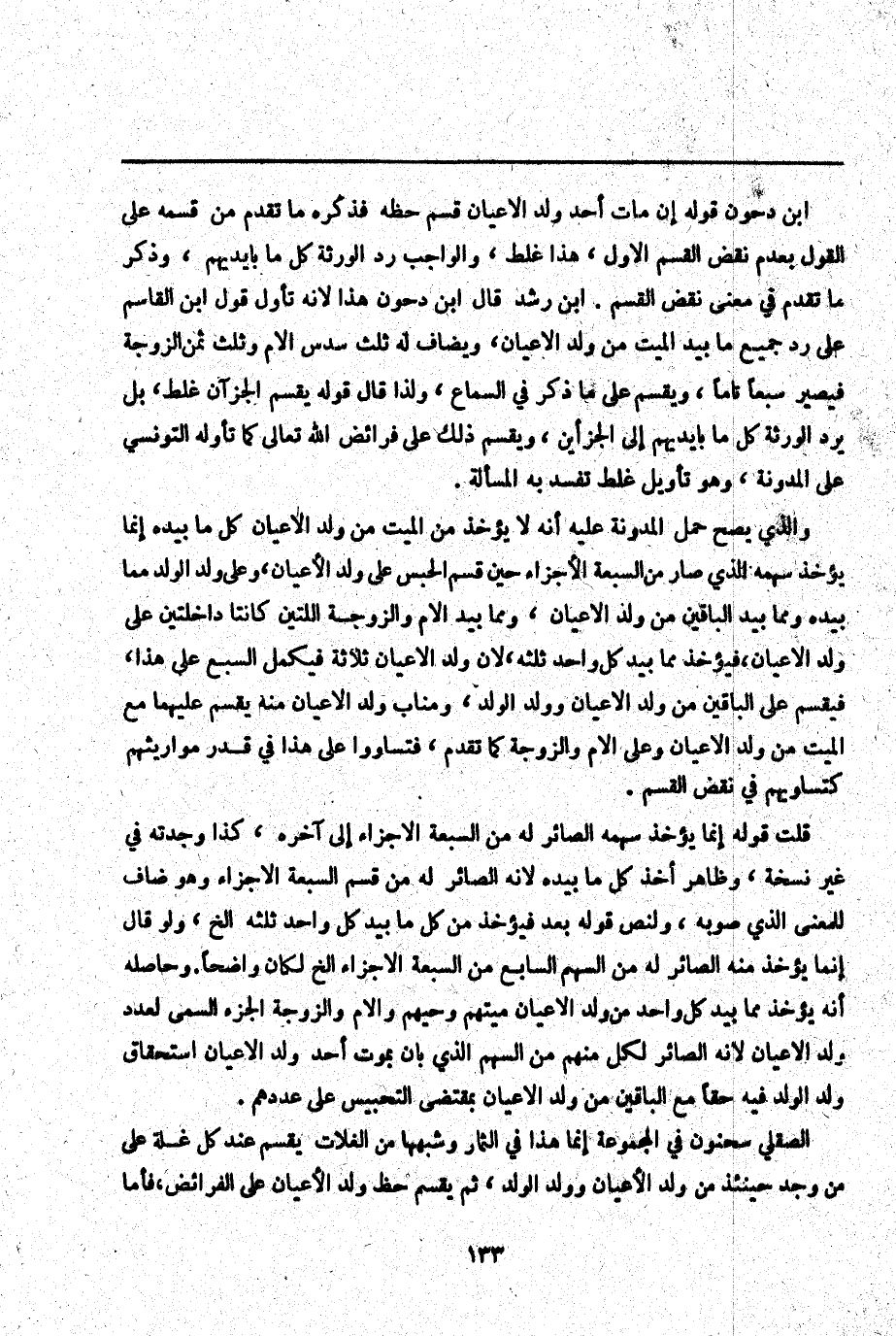 ـــــــــــــــــــــــــــــQابْنُ دَحُونٍ قَوْلُهُ إنْ مَاتَ أَحَدُ وَلَدِ الْأَعْيَانِ قُسِمَ حَظُّهُ فَذَكَرَهُ مَا تَقَدَّمَ مِنْ قَسْمِهِ عَلَى الْقَوْلِ بِعَدَمِ نَقْضِ الْقَسْمِ الْأَوَّلِ، هَذَا غَلَطٌ، وَالْوَاجِبُ رَدُّ الْوَرَثَةِ كُلَّ مَا بِأَيْدِيهِمْ وَذَكَرَ مَا تَقَدَّمَ فِي مَعْنَى نَقْضِ الْقَسْمِ. ابْنُ رُشْدٍ قَالَ ابْنُ دَحُونٍ هَذَا؛ لِأَنَّهُ تَأَوَّلَ قَوْلَ ابْنِ الْقَاسِمِ عَلَى رَدِّ جَمِيعِ مَا بِيَدِ الْمَيِّتِ مِنْ وَلَدِ الْأَعْيَانِ، وَيُضَافُ لَهُ ثُلُثُ سُدُسِ الْأُمِّ وَثُلُثُ ثُمُنِ الزَّوْجَةِ فَيَصِيرُ سُبْعًا تَامًّا، وَيُقْسَمُ عَلَى مَا ذُكِرَ فِي السَّمَاعِ، وَلِذَا قَالَ قَوْلُهُ يُقْسَمُ الْجُزْءَانِ غَلَطٌ، بَلْ يَرُدُّ الْوَرَثَةُ كُلَّ مَا بِأَيْدِيهِمْ إلَى الْجُزْأَيْنِ، وَيُقْسَمُ ذَلِكَ عَلَى فَرَائِضِ اللَّهِ تَعَالَى كَمَا تَأَوَّلَهُ التُّونُسِيُّ عَلَى الْمُدَوَّنَةِ، وَهُوَ تَأْوِيلٌ غَلَطٌ تَفْسُدُ بِهِ الْمَسْأَلَةُ.