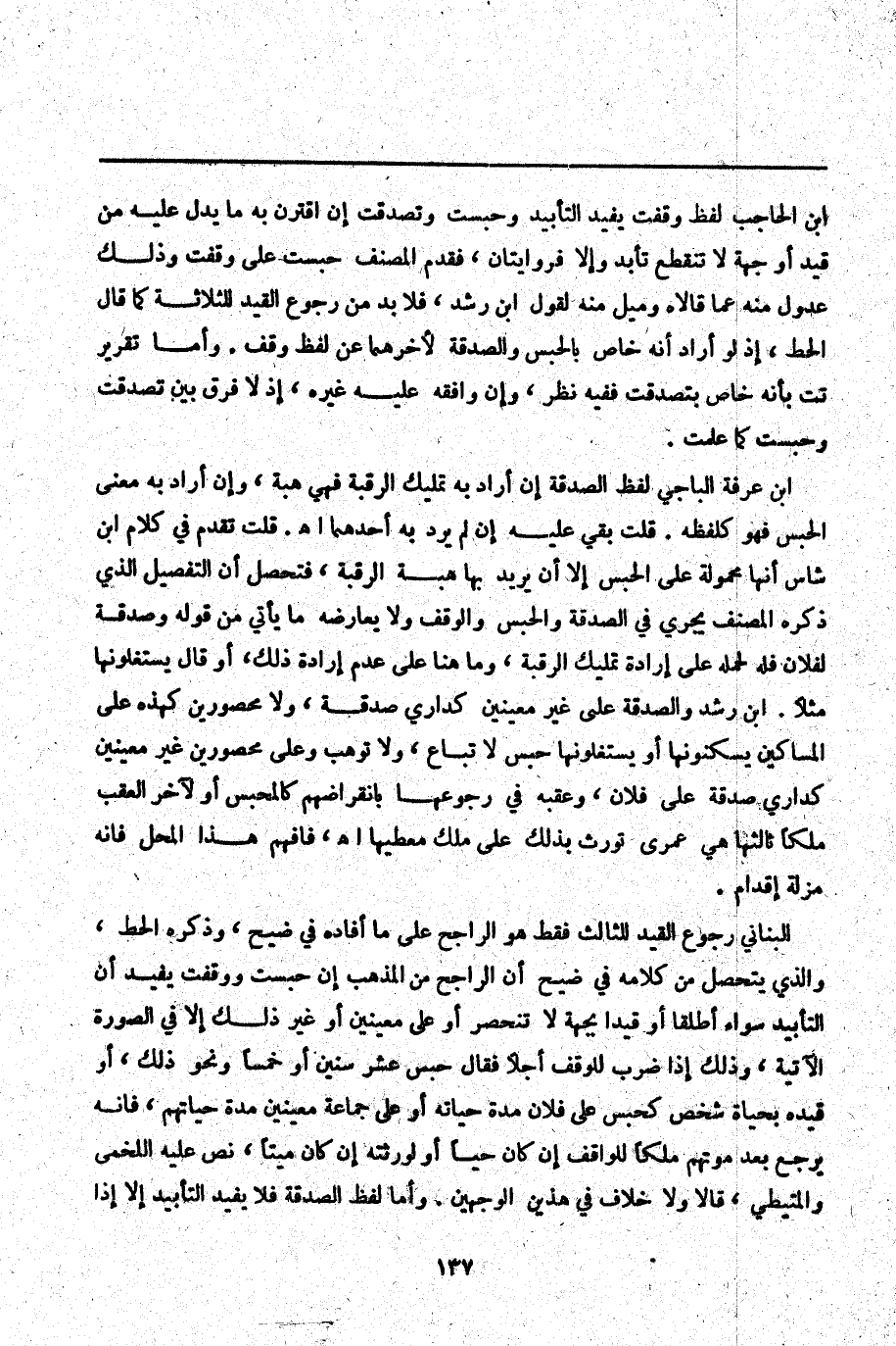 ـــــــــــــــــــــــــــــQابْنُ الْحَاجِبِ لَفْظَ وَقَفْت يُفِيدُ التَّأْبِيدَ وَحَبَسْت وَتَصَدَّقْت إنْ اقْتَرَنَ بِهِ مَا يَدُلُّ عَلَيْهِ مِنْ قَيْدٍ أَوْ جِهَةٍ لَا تَنْقَطِعُ تَأَبَّدَ وَإِلَّا فَرِوَايَتَانِ، فَقَدَّمَ الْمُصَنِّفُ حَبَسْت عَلَى وَقَفْت وَذَلِكَ عُدُولٌ مِنْهُ عَمَّا قَالَاهُ وَمَيْلٌ مِنْهُ لِقَوْلِ ابْنِ رُشْدٍ، فَلَا بُدَّ مِنْ رُجُوعِ الْقَيْدِ لِلثَّلَاثَةِ كَمَا قَالَ الْحَطّ، إذْ لَوْ أَرَادَ أَنَّهُ خَاصٌّ بِالْحَبْسِ وَالصَّدَقَةِ لَأَخَّرَهُمَا عَنْ لَفْظِ وَقَفَ. وَأَمَّا تَقْرِيرُ تت بِأَنَّهُ خَاصٌّ بِتَصَدَّقْتُ فَفِيهِ نَظَرٌ، وَإِنْ وَافَقَهُ عَلَيْهِ غَيْرُهُ، إذْ لَا فَرْقَ بَيْنَ تَصَدَّقْت وَحَبَسْت كَمَا عَلِمْت.