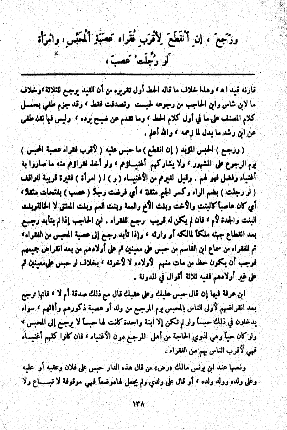 ابْنُ عَرَفَةَ فِيهَا إنْ قَالَ حَبْسٌ عَلَيْك وَعَلَى عَقِبِك قَالَ مَعَ ذَلِكَ صَدَقَةٌ أَمْ لَا، فَإِنَّهَا تَرْجِعُ بَعْدَ انْقِرَاضِهِمْ لِأَوْلَى النَّاسِ بِالْمُحَبِّسِ يَوْمَ الْمَرْجِعِ مِنْ وَلَدٍ أَوْ عَصَبَةٍ ذُكُورِهِمْ وَإِنَاثِهِمْ، سَوَاءٌ يَدْخُلُونَ فِي ذَلِكَ حَبْسًا، وَلَوْ لَمْ تَكُنْ إلَّا ابْنَةٌ وَاحِدَةٌ كَانَتْ لَهَا حَبْسًا لَا يَرْجِعُ إلَى الْمُحَبِّسِ،، وَلَوْ كَانَ حَيًّا وَهِيَ لِذَوِي الْحَاجَةِ مِنْ أَهْلِ الْمَرْجِعِ دُونَ الْأَغْنِيَاءِ، فَإِنْ كَانُوا كُلُّهُمْ أَغْنِيَاءَ فَهِيَ لِأَقْرَبِ النَّاسِ بِهِمْ مِنْ الْفُقَرَاءِ.