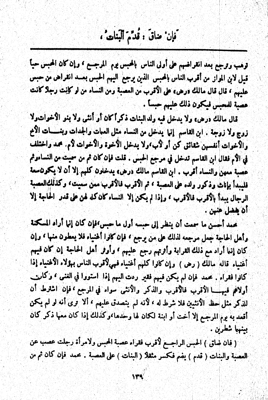 (فَإِنْ ضَاقَ) الْحَبْسُ الرَّاجِعُ لِأَقْرَبِ فُقَرَاءِ عَصَبَةِ الْمُحَبِّسِ وَلِامْرَأَةٍ رُجِّلَتْ عَصَّبَ عَنْ الْعَصَبَةِ وَالْبَنَاتِ (قُدِّمَ) بِضَمٍّ فَكَسْرٍ مُثَقَّلًا (الْبَنَاتُ) عَلَى الْعَصَبَةِ. مُحَمَّدٌ فَإِنْ كَانَ ثَمَّ مَنْ
