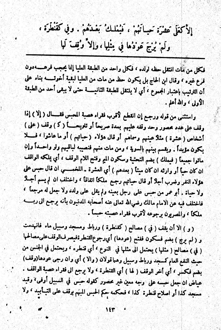 وَاسْتَثْنَى مِنْ قَوْلِهِ وَرَجَعَ إنْ انْقَطَعَ لِأَقْرَبِ فُقَرَاءِ عَصَبَةِ الْمُحَبِّسِ فَقَالَ (إلَّا) إذَا وَقَفَ عَلَى عَدَدٍ مَحْصُورٍ، وَحَدُّ وَقْفِهِ عَلَيْهِمْ بِمُدَّةٍ صَرِيحًا أَوْ تَلْوِيحًا (كَ) وَقْفٍ (عَلَى) أَشْخَاصٍ (عَشْرَةٍ) مَثَلًا عَيَّنَهُمْ وَسَمَّاهُمْ أَوْ قَالَ هَؤُلَاءِ (حَيَاتَهُمْ) أَوْ مَا عَاشُوا، فَلَا يَكُونُ مُؤَبَّدًا. وَيُقْسَمُ بَيْنَهُمْ بِالسَّوِيَّةِ، وَمَنْ مَاتَ مِنْهُمْ فَنَصِيبُهُ لِبَاقِيهِمْ، وَلَوْ وَاحِدًا وَإِنْ مَاتُوا جَمِيعًا (فَيُمْلَكُ) بِضَمِّ التَّحْتِيَّةِ وَسُكُونِ الْمِيمِ وَفَتْحِ اللَّامِ الْوَقْفُ، أَيْ يَمْلِكُهُ الْوَاقِفُ إنْ كَانَ حَيًّا أَوْ وَارِثُهُ إنْ كَانَ مَيِّتًا (بَعْدَهُمْ) أَيْ الْعَشَرَةِ. اللَّخْمِيُّ إنْ قَالَ حَبْسٌ عَلَى هَؤُلَاءِ النَّفَرِ وَضَرَبَ أَجَلًا أَوْ قَالَ حَيَاتَهُمْ رَجَعَ مِلْكًا اتِّفَاقًا، وَاخْتُلِفَ إنْ لَمْ يُسَمِّ أَجَلًا وَلَا حَيَاةً. أَبُو عُمَرَ مَنْ حَبَّسَ عَلَى رَجُلٍ بِعَيْنِهِ وَلَمْ يَقُلْ عَلَى وَلَدِهِ وَلَا جَعَلَ لَهُ مَرْجِعًا، فَاخْتَلَفَ فِيهِ عَنْ الْإِمَامِ مَالِكٍ - رَضِيَ اللَّهُ تَعَالَى عَنْهُ - أَصْحَابُهُ الْمَدَنِيُّونَ بِأَنَّهُ يَرْجِعُ إلَى رَبِّهِ مِلْكًا وَالْمِصْرِيُّونَ بِرُجُوعِهِ لِأَقْرَبِ فُقَرَاءِ عَصَبَتِهِ حَبْسًا.
