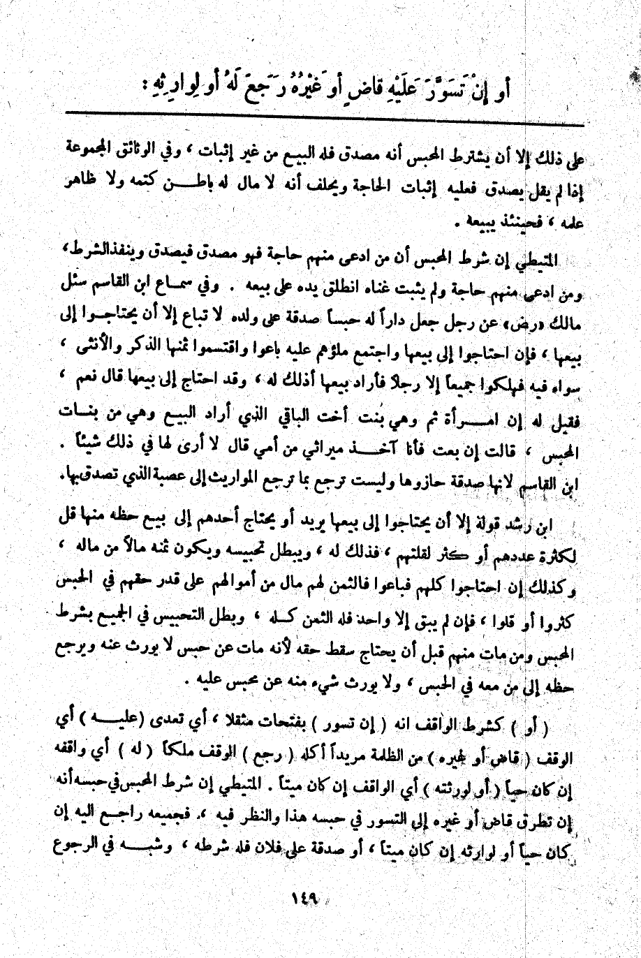 ابْنُ رُشْدٍ قَوْلُهُ إلَّا أَنْ يَحْتَاجُوا إلَى بَيْعِهَا يُرِيدُ أَوْ يَحْتَاجَ أَحَدُهُمْ إلَى بَيْعِ حَظِّهِ مِنْهَا قَلَّ لِكَثْرَةِ عَدَدِهِمْ أَوْ كَثُرَ لِقِلَّتِهِمْ، فَذَلِكَ لَهُ، وَيَبْطُلُ تَحْبِيسُهُ وَيَكُونُ ثَمَنُهُ مَالًا مِنْ مَالِهِ، وَكَذَلِكَ إنْ احْتَاجُوا كُلُّهُمْ فَبَاعُوا فَالثَّمَنُ لَهُمْ مَالٌ مِنْ أَمْوَالِهِمْ عَلَى قَدْرِ حَقِّهِمْ فِي الْحَبْسِ كَثُرُوا أَوْ قَلُّوا، فَإِنْ لَمْ يَبْقَ إلَّا وَاحِدٌ فَلَهُ الثَّمَنُ كُلُّهُ، وَبَطَلَ التَّحْبِيسُ فِي الْجَمِيعِ بِشَرْطِ الْمُحَبِّسِ وَمَنْ مَاتَ مِنْهُمْ قَبْلَ أَنْ يَحْتَاجَ سَقَطَ حَقُّهُ؛ لِأَنَّهُ مَاتَ عَنْ حَبْسٍ لَا يُورَثُ عَنْهُ وَيَرْجِعُ حَظُّهُ إلَى مَنْ مَعَهُ فِي الْحَبْسِ، وَلَا يُورَثُ شَيْءٌ مِنْهُ عَنْ مُحَبِّسٍ عَلَيْهِ.