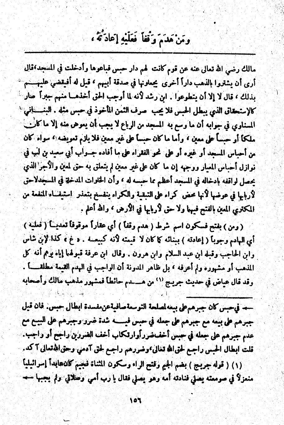 ـــــــــــــــــــــــــــــQمَالِكٌ - رَضِيَ اللَّهُ تَعَالَى عَنْهُ - عَنْ قَوْمٍ كَانَتْ لَهُمْ دَارٌ حَبْسٌ فَبَاعُوهَا وَأُدْخِلَتْ فِي الْمَسْجِدِ، قَالَ أَرَى أَنْ يَشْتَرُوا بِالذَّهَبِ دَارًا أُخْرَى يَجْعَلُونَهَا فِي صَدَقَةِ أَبِيهِمْ، قِيلَ لَهُ: أَفَيُقْضَى عَلَيْهِمْ بِذَلِكَ؟ قَالَ لَا إلَّا أَنْ يَتَطَوَّعُوا. ابْنُ رُشْدٍ؛ لِأَنَّهُ لَمَّا أَوْجَبَ الْحَقَّ أَخَذَهَا مِنْهُمْ جَبْرًا صَارَ كَالِاسْتِحْقَاقِ الَّذِي يُبْطِلُ الْحَبْسَ لَا يَجِبُ صَرْفُ الثَّمَنِ الْمَأْخُوذِ فِي حَبْسِ مِثْلِهِ الْبُنَانِيُّ الْمِسْنَاوِيُّ فِي جَوَابِهِ أَنَّ مَا وُسِّعَ بِهِ الْمَسْجِدُ مِنْ الرِّبَاعِ لَا يَجِبُ أَنْ يُعَوَّضَ مِنْهُ إلَّا مَا كَانَ مِلْكًا أَوْ حَبْسًا عَلَى مُعَيَّنٍ، وَأَمَّا مَا كَانَ حَبْسًا عَلَى غَيْرِ مُعَيَّنٍ فَلَا يَلْزَمُ تَعْوِيضُهُ، سَوَاءٌ كَانَ مِنْ أَجْنَاسِ الْمَسْجِدِ أَوْ غَيْرِهِ أَوْ عَلَى نَحْوِ الْفُقَرَاءِ عَلَى مَا أَفَادَهُ جَوَابُ أَبِي سَعِيدِ بْنِ لُبٍّ فِي نَوَازِلِ أَحْبَاسِ الْمِعْيَارِ وَوَجْهُهُ إنْ كَانَ عَلَى غَيْرِ مُعَيَّنٍ لَمْ يَتَعَلَّقْ بِهِ حَقٌّ لِمُعَيَّنٍ، وَالْأَجْرُ الَّذِي يَحْصُلُ لِوَاقِفِهِ بِإِدْخَالِهِ فِي الْمَسْجِدِ أَعْظَمُ مِمَّا حَبَّسَهُ لَهُ، وَإِنَّ الْخَلَوَاتِ الْمُدْخَلَةِ فِي الْمَسْجِدِ لَا حَقَّ لِأَرْبَابِهَا فِي عِوَضِهَا؛ لِأَنَّهَا مَحْضُ كِرَاءٍ عَلَى التَّبْقِيَةِ وَالْكِرَاءُ يَنْفَسِخُ بِتَعَذُّرِ اسْتِيفَاءِ الْمَنْفَعَةِ مِنْ الْمُكْتَرِي الْمُعَيَّنِ بِالْفَتْحِ فِيهِمَا وَلَا حَقَّ لِأَرْبَابِهَا فِي الْأَرْضِ، وَاَللَّهُ أَعْلَمُ.