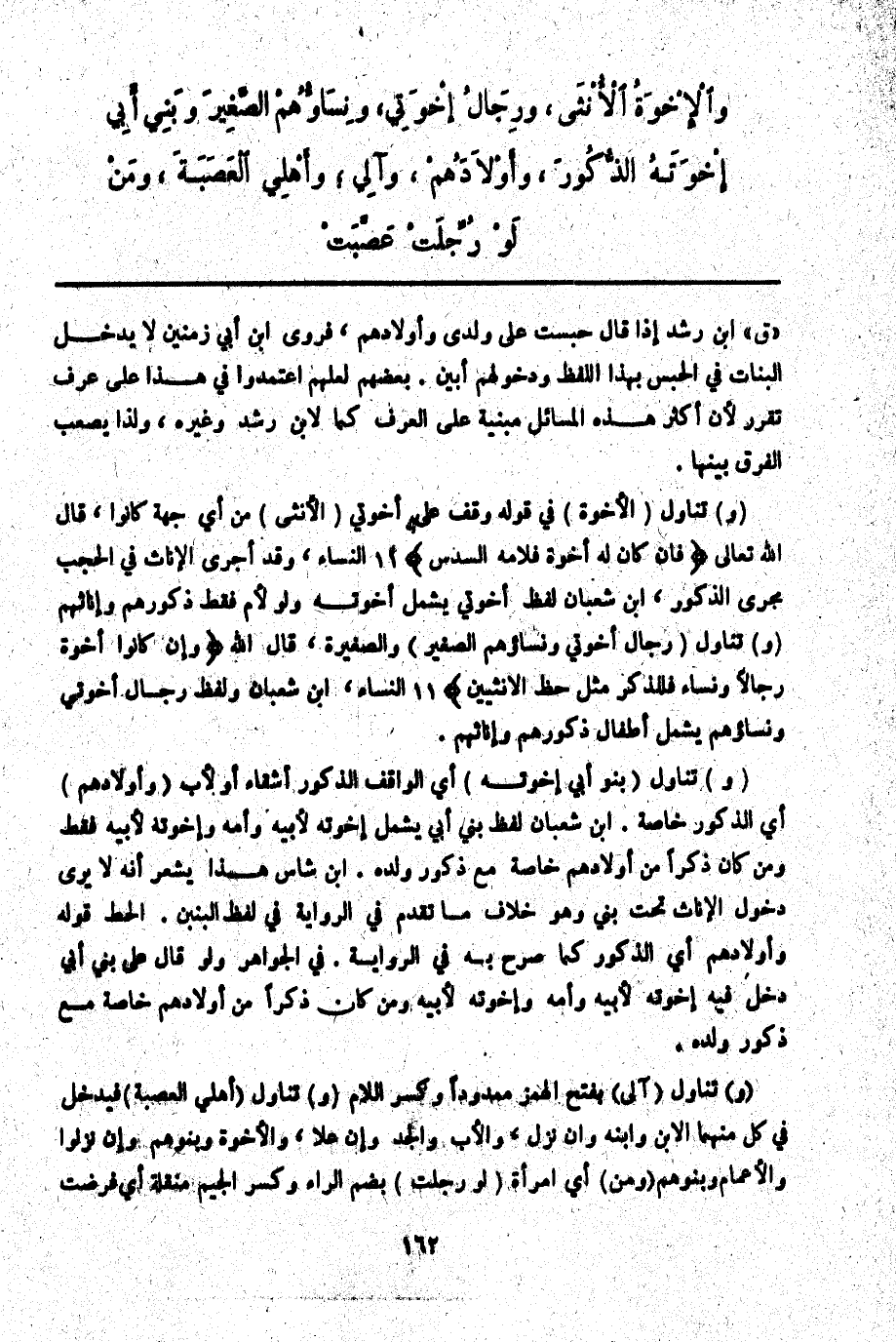 وَالْإِخْوَةُ الْأُنْثَى، وَرِجَالُ إخْوَتِي، وَنِسَاؤُهُمْ الصَّغِيرَ وَبَنِي أَبِي إخْوَتَهُ الذُّكُورَ، وَأَوْلَادَهُمْ، وَآلِي؛ وَأَهْلِي الْعَصَبَةَ، وَمَنْ لَوْ رُجِّلَتْ عَصَّبَتْ