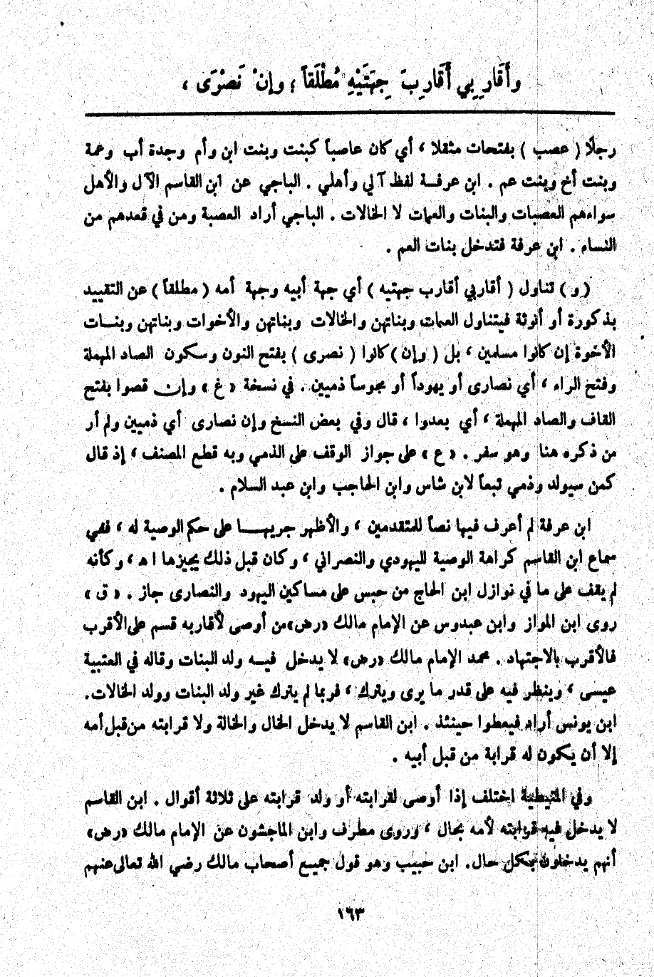 ابْنُ عَرَفَةَ لَمْ أَعْرِفْ فِيهَا نَصًّا لِلْمُتَقَدِّمِينَ وَالْأَظْهَرُ جَرْيُهَا عَلَى حُكْمِ الْوَصِيَّةِ لَهُ، فَفِي سَمَاعِ ابْنِ الْقَاسِمِ كَرَاهَةُ الْوَصِيَّةِ لِلْيَهُودِيِّ وَالنَّصْرَانِيِّ، وَكَانَ قَبْلَ ذَلِكَ يُجِيزُهَا. اهـ. وَكَأَنَّهُ لَمْ يَقِفْ عَلَى مَا فِي نَوَازِلِ ابْنِ الْحَاجِّ مَنْ حَبَّسَ عَلَى مَسَاكِينِ الْيَهُودِ وَالنَّصَارَى جَازَ. " ق " رَوَى ابْنُ الْمَوَّازِ وَابْنُ عَبْدُوسٍ عَنْ الْإِمَامِ مَالِكٍ " - رَضِيَ اللَّهُ عَنْهُ - " مَنْ أَوْصَى لِأَقَارِبِهِ قُسِمَ عَلَى الْأَقْرَبِ فَالْأَقْرَبِ بِالِاجْتِهَادِ. مُحَمَّدٌ الْإِمَامُ مَالِكٌ " - رَضِيَ اللَّهُ عَنْهُ - " لَا يَدْخُلُ فِيهِ وَلَدُ الْبَنَاتِ وَقَالَهُ فِي الْعُتْبِيَّةِ عِيسَى، وَيُنْظَرُ فِيهِ عَلَى قَدْرِ مَا يَرَى وَيَتْرُكُ، فَرُبَّمَا لَمْ يَتْرُكْ غَيْرَ وَلَدِ الْبَنَاتِ وَوَلَدِ الْخَالَاتِ ابْنُ يُونُسَ أَرَادَ فَيُعْطَوْا حِينَئِذٍ. ابْنُ الْقَاسِمِ لَا يَدْخُلُ الْخَالُ وَالْخَالَةُ وَلَا قَرَابَتُهُ مِنْ قِبَلِ أُمِّهِ إلَّا أَنْ يَكُونَ لَهُ قَرَابَةٌ مِنْ قِبَلِ أَبِيهِ.