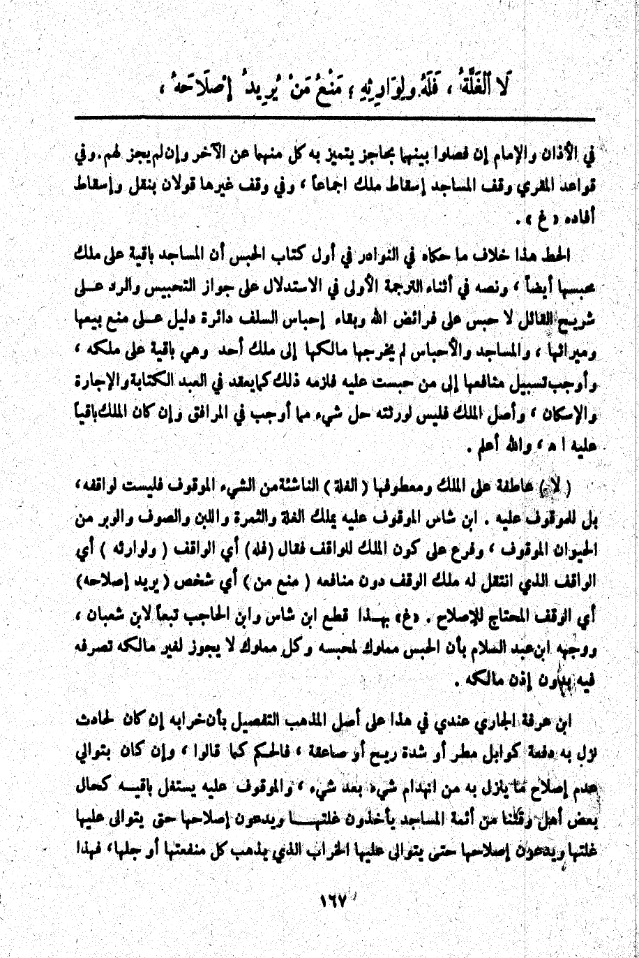 ابْنُ عَرَفَةَ الْجَارِي عِنْدِي فِي هَذَا عَلَى أَصْلِ الْمَذْهَبِ التَّفْصِيلُ بِأَنَّ خَرَابَهُ إنْ كَانَ لِحَادِثٍ نَزَلَ بِهِ دَفْعَةً كَوَابِلِ مَطَرٍ أَوْ شِدَّةِ رِيحٍ أَوْ صَاعِقَةٍ، فَالْحُكْمُ كَمَا قَالُوا، وَإِنْ كَانَ يَتَوَالَى عَدَمَ إصْلَاحِ مَا يَنْزِلُ بِهِ مِنْ انْهِدَامِ شَيْءٍ بَعْدَ شَيْءٍ، وَالْمَوْقُوفُ عَلَيْهِ يَسْتَعْلِ بَاقِيهِ كَحَالِ بَعْضِ أَهْلِ وَقْتِنَا مِنْ أَئِمَّةِ الْمَسَاجِدِ يَأْخُذُونَ غَلَّتَهَا وَيَدَّعُونَ إصْلَاحَهَا حَتَّى يَتَوَالَى عَلَيْهَا غَلَّتَهَا وَيَدَّعُونَ إصْلَاحَهَا حَتَّى يَتَوَالَى عَلَيْهَا الْخَرَابُ الَّذِي يُذْهِبُ كُلَّ مَنْفَعَتِهَا أَوْ جُلَّهَا، فَهَذَا