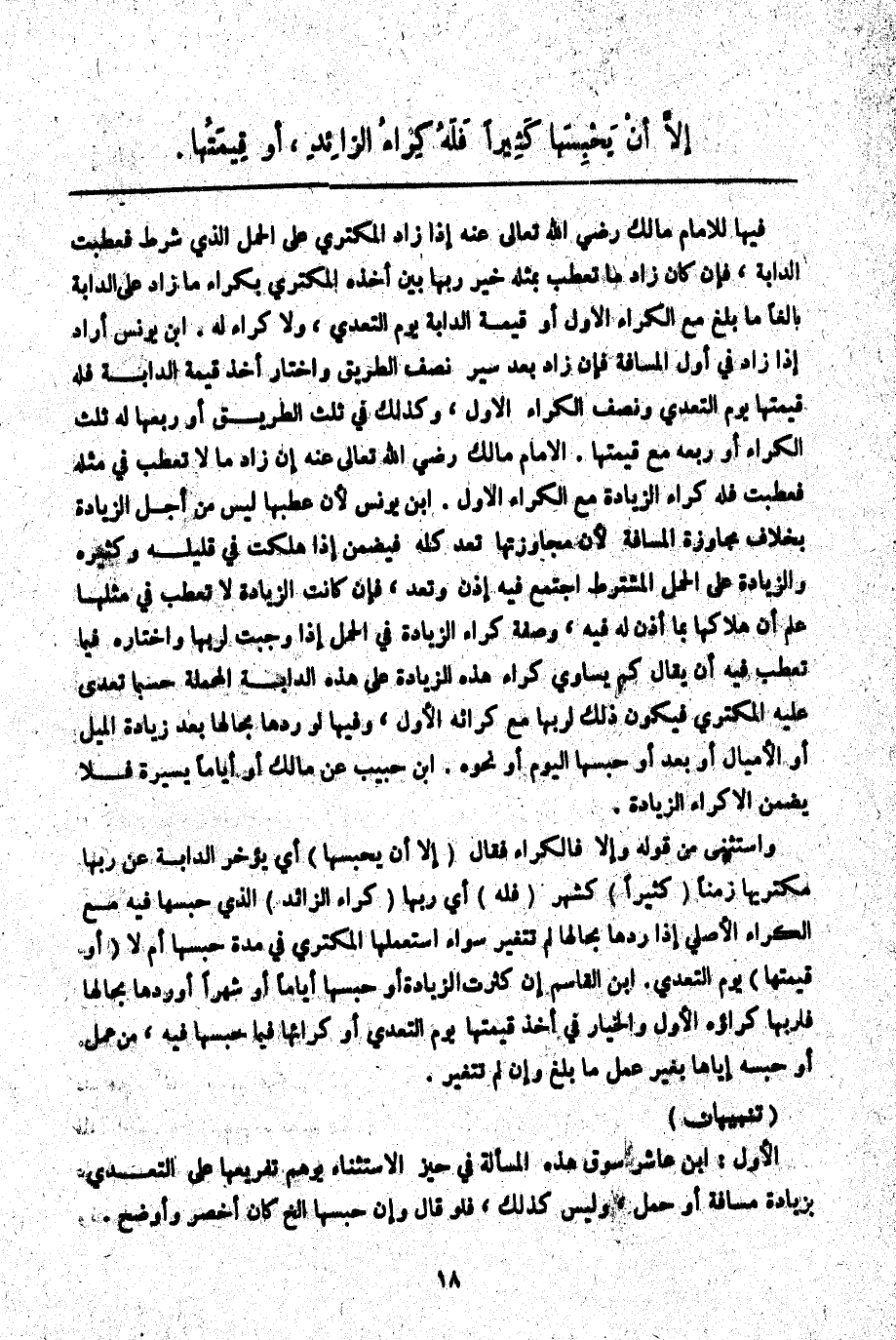 وَاسْتَثْنَى مِنْ قَوْلِهِ وَإِلَّا فَالْكِرَاءُ فَقَالَ (إلَّا أَنْ يَحْبِسَهَا) أَيْ يُؤَخِّرَ الدَّابَّةَ عَنْ رَبِّهَا مُكْتَرِيهَا زَمَنًا (كَثِيرًا) كَشَهْرٍ (فَلَهُ) أَيْ رَبِّهَا (كِرَاءُ الزَّائِدِ) الَّذِي حَبَسَهَا فِيهِ مَعَ الْكِرَاءِ الْأَصْلِيِّ إذَا رَدَّهَا بِحَالِهَا لَمْ تَتَغَيَّرْ سَوَاءٌ اسْتَعْمَلَهَا الْمُكْتَرِي فِي مُدَّةِ حَبْسِهَا أَمْ لَا (أَوْ قِيمَتُهَا) يَوْمَ التَّعَدِّي. ابْنُ الْقَاسِمِ إنْ كَثُرَتْ الزِّيَادَةُ أَوْ حَبَسَهَا أَيَّامًا أَوْ شَهْرًا أَوْ رَدَّهَا بِحَالِهَا فَلِرَبِّهَا كِرَاؤُهُ الْأَوَّلُ وَالْخِيَارُ فِي أَخْذِ قِيمَتِهَا يَوْمَ التَّعَدِّي أَوْ كِرَائِهَا فِيمَا حَبَسَهَا فِيهِ، مِنْ عَمَلٍ أَوْ حَبْسِهِ إيَّاهَا بِغَيْرِ عَمَلِ مَا بَلَغَ وَإِنْ لَمْ تَتَغَيَّرْ. (تَنْبِيهَانِ)