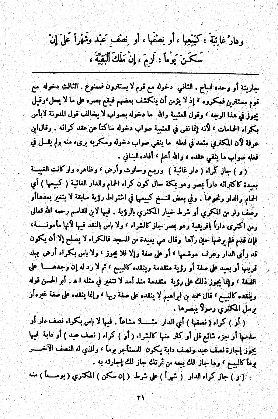 (وَ) جَازَ كِرَاءُ (دَارٍ غَائِبَةٍ) وَرَبْعٍ وَحَانُوتٍ وَأَرْضٍ، وَظَاهِرُهُ وَلَوْ كَانَتْ الْغَيْبَةُ بَعِيدَةً كَاكْتِرَائِهِ دَارًا بِمِصْرَ، وَهُوَ بِمَكَّةَ حَالَ كَوْنِ كِرَاءِ الْحَمَّامِ وَالدَّارِ الْغَائِبَةِ (كَبَيْعِهَا) أَيْ الْحَمَّامِ وَالدَّارِ وَنَحْوِهِمَا. وَفِي بَعْضِ النُّسَخِ كَبَيْعِهِمَا فِي اشْتِرَاطِ رُؤْيَةٍ سَابِقَةٍ لَا يَتَغَيَّرُ بَعْدَهَا أَوْ وَصْفٌ وَلَوْ مِنْ الْمُكْرِي أَوْ شُرِطَ خِيَارُ الْمُكْتَرِي بِالرُّؤْيَةِ. فِيهَا لِابْنِ الْقَاسِمِ - رَحِمَهُ اللَّهُ تَعَالَى - وَمَنْ اكْتَرَى دَارًا بِإِفْرِيقِيَّةَ، وَهُوَ بِمِصْرَ جَازَ كَالشِّرَاءِ، وَلَا بَأْسَ بِالنَّقْدِ فِيهَا؛ لِأَنَّهَا مَأْمُونَةٌ، فَإِنْ قَدِمَ فَلَمْ يَرْضَهَا حِينَ رَآهَا وَقَالَ هِيَ بَعِيدَةٌ مِنْ الْمَسْجِدِ فَالْكِرَاءُ لَا يَصْلُحُ إلَّا أَنْ يَكُونَ قَدْ رَأَى الدَّارَ وَعَرَفَ مَوْضِعَهَا، أَوْ عَلَى صِفَةٍ وَإِلَّا فَلَا يَجُوزُ، وَلَا بَأْسَ بِكِرَاءِ أَرْضٍ بِبَلَدٍ قَرِيبٍ أَوْ بَعِيدٍ عَلَى صِفَةٍ أَوْ رُؤْيَةٍ مُتَقَدِّمَةٍ وَيَنْقُدُهُ كَالْبَيْعِ، ثُمَّ لَا رَدَّ لَهُ إنْ وَجَدَهَا عَلَى الصِّفَةِ، وَإِنَّمَا يَجُوزُ ذَلِكَ عَلَى رُؤْيَةٍ مُتَقَدِّمَةٍ مُنْذُ أَمَدٍ لَا تَتَغَيَّرُ فِي مِثْلِهِ اهـ. أَبُو الْحَسَنِ قَوْلُهُ وَيَنْقُدُهُ كَالْبَيْعِ، قَالَ مُحَمَّدُ بْنُ إبْرَاهِيمَ لَا يَنْقُدُهُ عَلَى صِفَةِ رَبِّهَا، وَإِنَّمَا يَنْقُدُهُ عَلَى صِفَةِ غَيْرِهِ أَوْ يُرْسِلُ الْمُكْتَرِي رَسُولًا يُبْصِرُهَا.