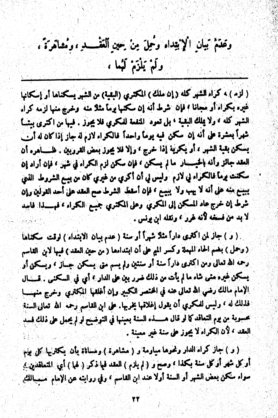 (وَ) جَازَ كِرَاءُ الدَّارِ وَنَحْوَهَا مُيَاوَمَةً وَ (مُشَاهَرَةً) وَمُسَانَاةً بِأَنْ يَكْتَرِيَهَا كُلَّ يَوْمٍ أَوْ كُلَّ شَهْرٍ أَوْ كُلَّ سَنَةٍ بِكَذَا، وَصَحَّ وَ (لَمْ يَلْزَمْ) الْعَقْدُ فِيمَا ذُكِرَ (لَهُمَا) أَيْ الْمُتَعَاقِدَيْنِ، سَوَاءٌ سَكَنَ بَعْضَ الشَّهْرِ أَوْ السَّنَةِ أَوْ لَا عِنْدَ ابْنِ الْقَاسِمِ، وَفِي رِوَايَتِهِ عَنْ الْإِمَامِ مَالِكٍ