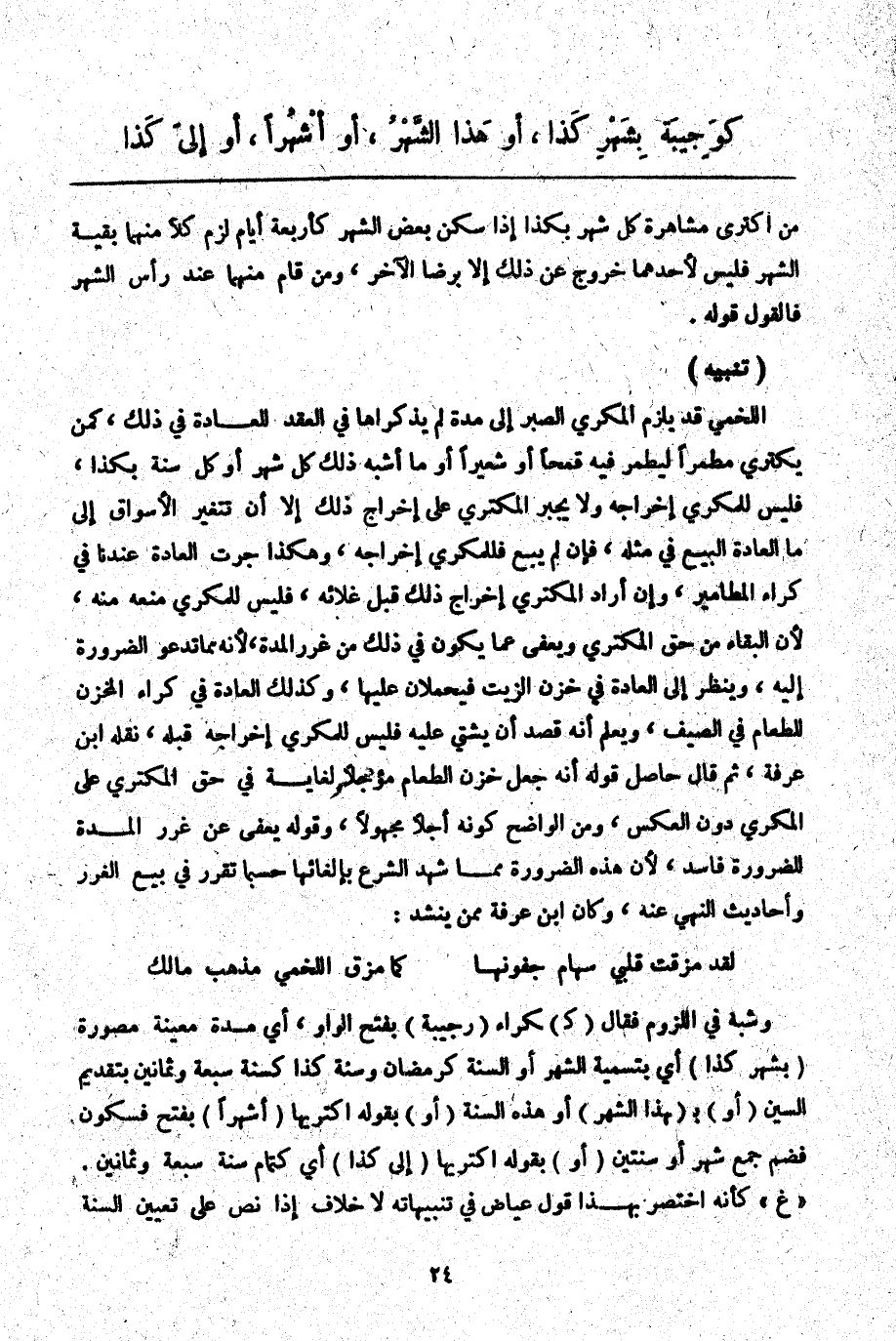 وَشَبَّهَ فِي اللُّزُومِ فَقَالَ (كَ) كِرَاءِ (وَجِيبَةٍ) بِفَتْحِ الْوَاوِ، أَيْ مُدَّةٍ مُعَيَّنَةٍ مُصَوَّرَةٍ (بِشَهْرِ كَذَا) أَيْ بِتَسْمِيَةِ الشَّهْرِ أَوْ السَّنَةِ كَرَمَضَانَ وَسَنَةِ كَذَا كَسَنَةِ سَبْعَةٍ وَثَمَانِينَ بِتَقْدِيمِ السِّينِ (أَوْ) بِ (هَذَا الشَّهْرِ) أَوْ هَذِهِ السَّنَةِ (أَوْ) بِقَوْلِهِ أَكْتَرِيهَا (أَشْهُرًا) بِفَتْحٍ فَسُكُونٍ فَضَمٍّ جَمْعُ شَهْرٍ أَوْ سَنَتَيْنِ (أَوْ) بِقَوْلِهِ أَكْتَرِيهَا (إلَى كَذَا) أَيْ كَتَمَامِ سَنَةِ سَبْعَةٍ وَثَمَانِينَ.