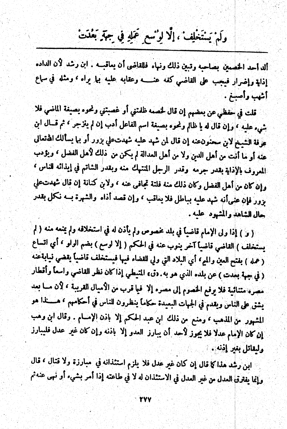 (وَ) إذَا وَلَّى الْإِمَامُ قَاضِيًا فِي بَلَدٍ مَخْصُوصٍ وَلَمْ يَأْذَن لَهُ فِي اسْتِخْلَافِهِ وَلَمْ يَمْنَعْهُ مِنْهُ (لَمْ يَسْتَخْلِفْ) الْقَاضِي قَاضِيًا آخَرَ يَنُوبُ عَنْهُ فِي الْحُكْمِ (إلَّا لِوُسْعِ) بِضَمِّ الْوَاوِ، أَيْ اتِّسَاعِ (عَمَلِهِ) بِفَتْحِ الْعَيْنِ وَالْمِيمِ، أَيْ الْبِلَادِ الَّتِي وُلِّيَ لِلْقَضَاءِ فِيهَا فَيَسْتَخْلِفُ قَاضِيًا يَقْضِي نِيَابَةً عَنْهُ (فِي جِهَةٍ بَعُدَتْ) عَنْ بَلَدِهِ الَّذِي هُوَ بِهِ. " ق " الْمُتَيْطِيُّ إذَا كَانَ نَظَرُ الْقَاضِي وَاسِعًا وَأَقْطَارُ مِصْرِهِ مُتَنَائِيَةً فَلَا يَرْفَعُ الْخُصُومَ إلَى مِصْرِهِ إلَّا فِيمَا مَنْ قَرُبَ مِنْ الْأَمْيَالِ الْقَرِيبَةِ لِأَنَّ مَا بَعُدَ يَشُقُّ عَلَى النَّاسِ وَيُقَدِّمُ فِي الْجِهَاتِ الْبَعِيدَةِ حُكَّامًا يَنْظُرُونَ لِلنَّاسِ فِي أَحْكَامِهِمْ، هَذَا هُوَ الْمَشْهُورُ مِنْ الْمَذْهَبِ، وَمَنَعَ مِنْ ذَلِكَ ابْنُ عَبْدِ الْحَكَمِ إلَّا بِإِذْنِ الْإِمَامِ. وَقَالَ ابْنُ وَهْبٍ إنْ كَانَ الْإِمَامُ عَدْلًا فَلَا يَجُوزُ لِأَحَدٍ أَنْ يُبَارِزَ الْعَدُوَّ إلَّا بِإِذْنِهِ وَإِنْ كَانَ غَيْرَ عَدْلٍ فَلْيُبَارِزْ وَلْيُقَاتِلْ بِغَيْرِ إذْنِهِ.
