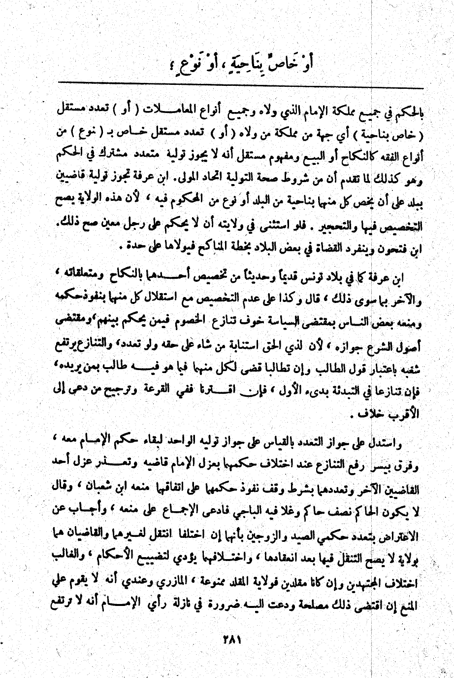 ـــــــــــــــــــــــــــــQبِالْحُكْمِ فِي جَمِيعِ مَمْلَكَةِ الْإِمَامِ الَّذِي وَلَّاهُ وَجَمِيعِ أَنْوَاعِ الْمُعَامَلَاتِ (أَوْ) تَعَدُّدُ مُسْتَقِلٍّ (خَاصٍّ بِنَاحِيَةٍ) أَيِّ جِهَةٍ مِنْ مَمْلَكَةِ مَنْ وَلَّاهُ (أَوْ) تَعَدُّدُ مُسْتَقِلٍّ خَاصٍّ بِ (نَوْعٍ) مِنْ أَنْوَاعِ الْفِقْهِ كَالنِّكَاحِ أَوْ الْبَيْعِ وَمَفْهُومُ مُسْتَقِلٍّ أَنَّهُ لَا يَجُوزُ تَوْلِيَةُ مُتَعَدِّدٍ مُشْتَرَكٍ فِي الْحُكْمِ وَهُوَ كَذَلِكَ لِمَا تَقَدَّمَ أَنَّ مِنْ شُرُوطِ صِحَّةِ التَّوْلِيَةِ اتِّحَادُ الْمُوَلَّى. ابْنُ عَرَفَةَ تَجُوزُ تَوْلِيَةُ قَاضِيَيْنِ بِبَلَدٍ عَلَى أَنْ يَخُصَّ مِنْهُمَا بِنَاحِيَةٍ مِنْ الْبَلَدِ أَوْ نَوْعٍ مِنْ الْمَحْكُومِ فِيهِ لِأَنَّ هَذِهِ الْوِلَايَةَ يَصِحُّ التَّخْصِيصُ فِيهَا وَالتَّحْجِيرُ. فَلَوْ اسْتَثْنَى فِي وِلَايَتِهِ أَنْ لَا يَحْكُمَ عَلَى رَجُلٍ مُعَيَّنٍ صَحَّ ذَلِكَ. ابْنُ فَتْحُونٍ وَيَنْفَرِدُ الْقُضَاةُ فِي بَعْضِ الْبِلَادِ بِخُطَّةِ الْمُنَاكِحِ فَيُوَلَّاهَا عَلَى حِدَةٍ.