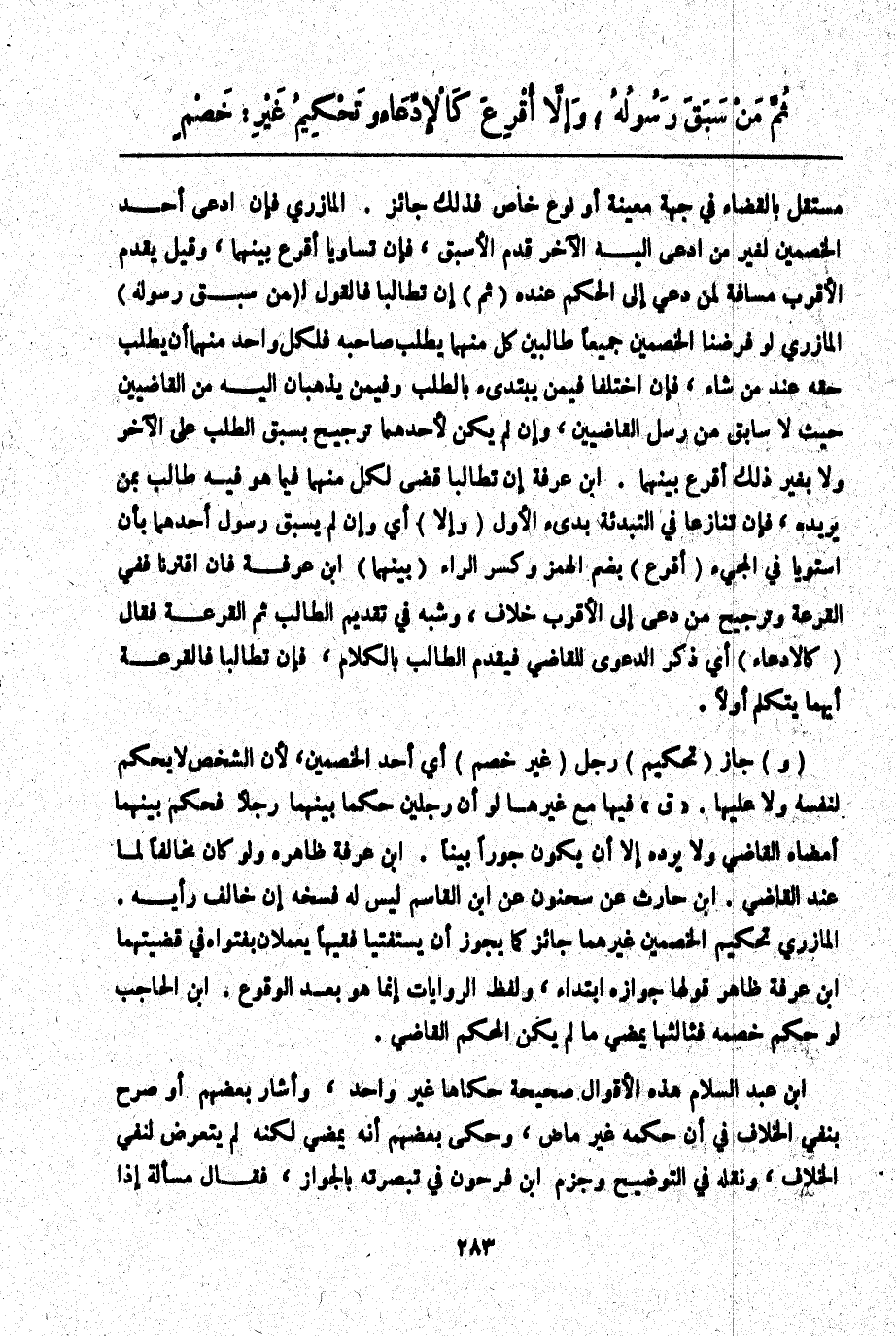 ـــــــــــــــــــــــــــــQمُسْتَقِلٌّ بِالْقَضَاءِ فِي جِهَةٍ مُعَيَّنَةٍ أَوْ نَوْعٍ خَاصٍّ فَذَلِكَ جَائِزٌ. الْمَازِرِيُّ فَإِنْ ادَّعَى أَحَدُ الْخَصْمَيْنِ لِغَيْرِ مَنْ ادَّعَى إلَيْهِ الْآخَرُ قُدِّمَ الْأَسْبَقُ، فَإِنْ تَسَاوَيَا أُقْرِعَ بَيْنَهُمَا، وَقِيلَ يُقَدَّمُ الْأَقْرَبُ مَسَافَةً لِمَنْ دُعِيَ إلَى الْحُكْمِ عِنْدَهُ (ثُمَّ) إنْ تَطَالَبَا فَالْقَوْلُ لِ (مَنْ سَبَقَ رَسُولُهُ) الْمَازِرِيُّ لَوْ فَرَضْنَا الْخَصْمَيْنِ جَمِيعًا طَالِبَيْنِ كُلٌّ مِنْهُمَا يَطْلُبُ صَاحِبَهُ فَلِكُلِّ وَاحِدٍ مِنْهُمَا أَنْ يَطْلُبَ حَقَّهُ عِنْدَ مَنْ شَاءَ، فَإِنْ اخْتَلَفَا فِيمَنْ يَبْتَدِئُ بِالطَّلَبِ وَفِيمَنْ يَذْهَبَانِ إلَيْهِ مِنْ الْقَاضِيَيْنِ حَيْثُ لَا سَابِقَ مِنْ رُسُلِ الْقَاضِيَيْنِ، وَإِنْ لَمْ يَكُنْ لِأَحَدِهِمَا تَرْجِيحٌ بِسَبْقِ الطَّلَبِ عَلَى الْآخَرِ وَلَا بِغَيْرِ ذَلِكَ أُقْرِعَ بَيْنَهُمَا. ابْنُ عَرَفَةَ إنْ تَطَالَبَا قُضِيَ لِكُلٍّ مِنْهُمَا فِيمَا هُوَ فِيهِ طَالِبٌ بِمَنْ يُرِيدُهُ، فَإِنْ تَنَازَعَا فِي التَّبْدِئَةِ بُدِئَ الْأَوَّلُ (وَإِلَّا) أَيْ وَإِنْ لَمْ يَسْبِقْ رَسُولُ أَحَدِهِمَا بِأَنْ اسْتَوَيَا فِي الْمَجِيءِ (أَقُرِعَ) بِضَمِّ الْهَمْزِ وَكَسْرِ الرَّاءِ (بَيْنَهُمَا) ابْنُ عَرَفَةَ فَإِنْ اقْتَرَنَا فَفِي الْقُرْعَةِ وَتَرْجِيحِ مَنْ دُعِيَ إلَى الْأَقْرَبِ خِلَافٌ، وَشَبَّهَ فِي تَقْدِيمِ الطَّالِبِ ثُمَّ الْقُرْعَةُ فَقَالَ (كَالِادِّعَاءِ) أَيْ ذَكَرَ الدَّعْوَى لِلْقَاضِي فَيُقَدَّمُ الطَّالِبُ بِالْكَلَامِ، فَإِنْ تَطَالَبَا فَالْقُرْعَةُ أَيُّهُمَا يَتَكَلَّمُ أَوَّلًا.