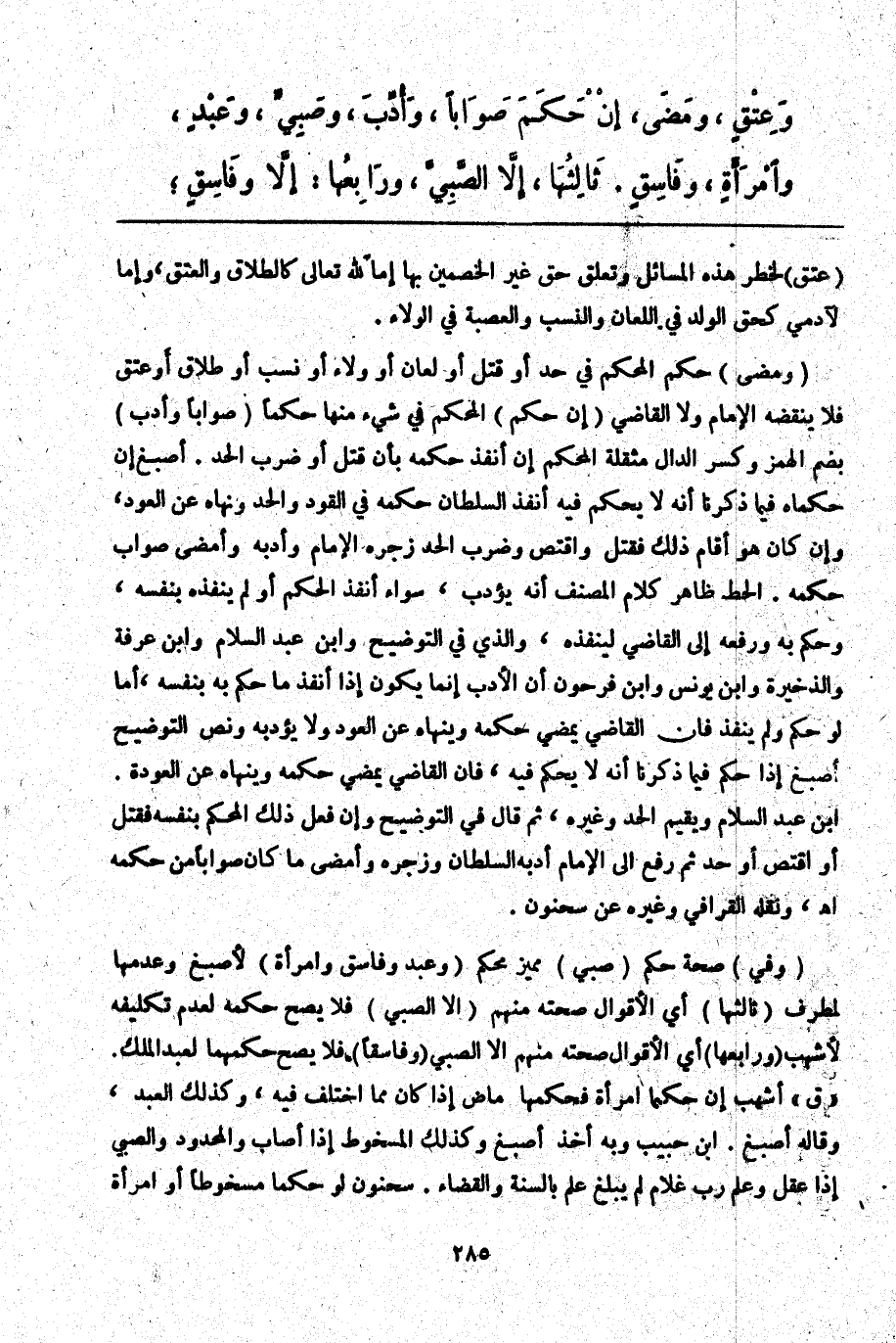 (وَمَضَى) حُكْمُ الْمُحَكَّمِ فِي حَدٍّ أَوْ قَتْلٍ أَوْ لِعَانٍ أَوْ وَلَاءٍ أَوْ نَسَبٍ أَوْ طَلَاقٍ أَوْ عِتْقٍ فَلَا يَنْقُضُهُ الْإِمَامُ وَلَا الْقَاضِي (إنْ حَكَمَ) الْمُحَكَّمُ فِي شَيْءٍ مِنْهَا حُكْمًا (صَوَابًا وَأُدِّبَ) بِضَمِّ الْهَمْزِ وَكَسْرِ الدَّالِ مُثَقَّلَةً الْمُحَكَّمُ إنْ أَنْفَذَ حُكْمَهُ بِأَنْ قَتَلَ أَوْ ضَرَبَ الْحَدَّ. أَصْبَغُ إنْ حَكَّمَاهُ فِيمَا ذَكَرْنَا أَنَّهُ لَا يُحَكَّمُ فِيهِ أَنْفَذَ السُّلْطَانُ حُكْمَهُ فِي الْقَوَدِ وَالْحَدِّ وَنَهَاهُ عَنْ الْعَوْدِ، وَإِنْ كَانَ هُوَ أَقَامَ ذَلِكَ فَقَتَلَ وَاقْتَصَّ وَضَرَبَ الْحَدَّ زَجَرَهُ الْإِمَامُ وَأَدَّبَهُ وَأَمْضَى صَوَابَ حُكْمِهِ. الْحَطّ ظَاهِرُ كَلَامِ الْمُصَنِّفِ أَنَّهُ يُؤَدَّبُ سَوَاءٌ أَنْفَذَ الْحُكْمَ أَوْ لَمْ يُنْفِذْهُ بِنَفْسِهِ، وَحَكَمَ بِهِ وَرَفَعَهُ إلَى الْقَاضِي لِيُنْفِذَهُ، وَاَلَّذِي فِي التَّوْضِيحِ وَابْنِ عَبْدِ السَّلَامِ وَابْنِ عَرَفَةَ وَالذَّخِيرَةِ وَابْنِ يُونُسَ وَابْنِ فَرْحُونٍ أَنَّ الْأَدَبَ إنَّمَا يَكُونُ إذَا أَنْفَذَ مَا حَكَمَ بِهِ بِنَفْسِهِ، أَمَّا لَوْ حَكَمَ وَلَمْ يُنْفِذْ فَإِنَّ الْقَاضِيَ يُمْضِي حُكْمَهُ وَيَنْهَاهُ عَنْ الْعَوْدِ وَلَا يُؤَدِّبُهُ وَنَصُّ التَّوْضِيحِ أَصْبَغُ إذَا حَكَمَ فِيمَا ذَكَرْنَا أَنَّهُ لَا يَحْكُمُ فِيهِ، فَإِنَّ الْقَاضِيَ يُمْضِي حُكْمَهُ وَيَنْهَاهُ عَنْ الْعَوْدَةِ. ابْنُ عَبْدِ السَّلَامِ وَيُقِيمُ الْحَدَّ وَغَيْرَهُ، ثُمَّ قَالَ فِي التَّوْضِيحِ وَإِنْ فَعَلَ ذَلِكَ الْحُكْمَ بِنَفْسِهِ فَقَتَلَ أَوْ اقْتَصَّ أَوْ حُدَّ ثُمَّ رَفَعَ إلَى الْإِمَامِ أَدَّبَهُ السُّلْطَانُ وَزَجَرَهُ وَأَمْضَى مَا كَانَ صَوَابًا مِنْ حُكْمِهِ. اهـ. وَنَقَلَهُ الْقَرَافِيُّ وَغَيْرُهُ عَنْ سَحْنُونٍ.